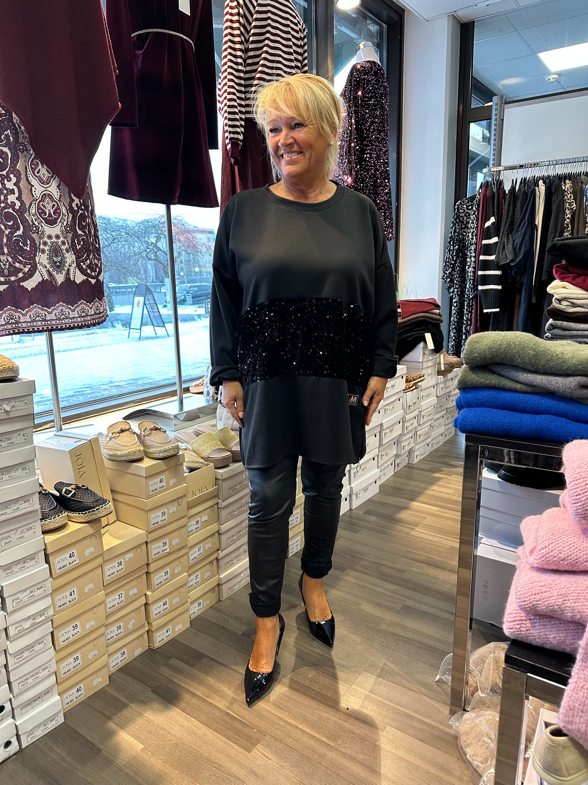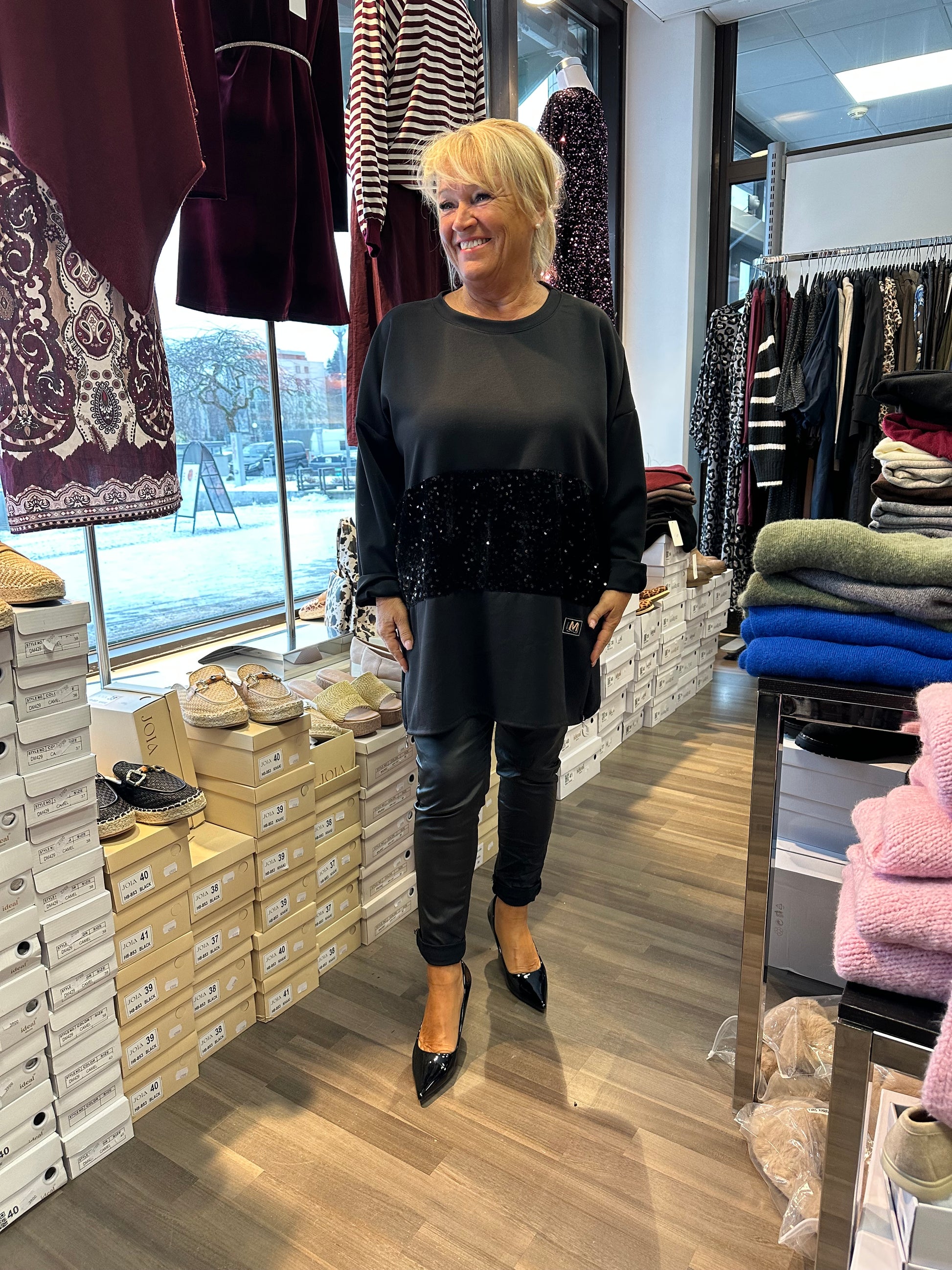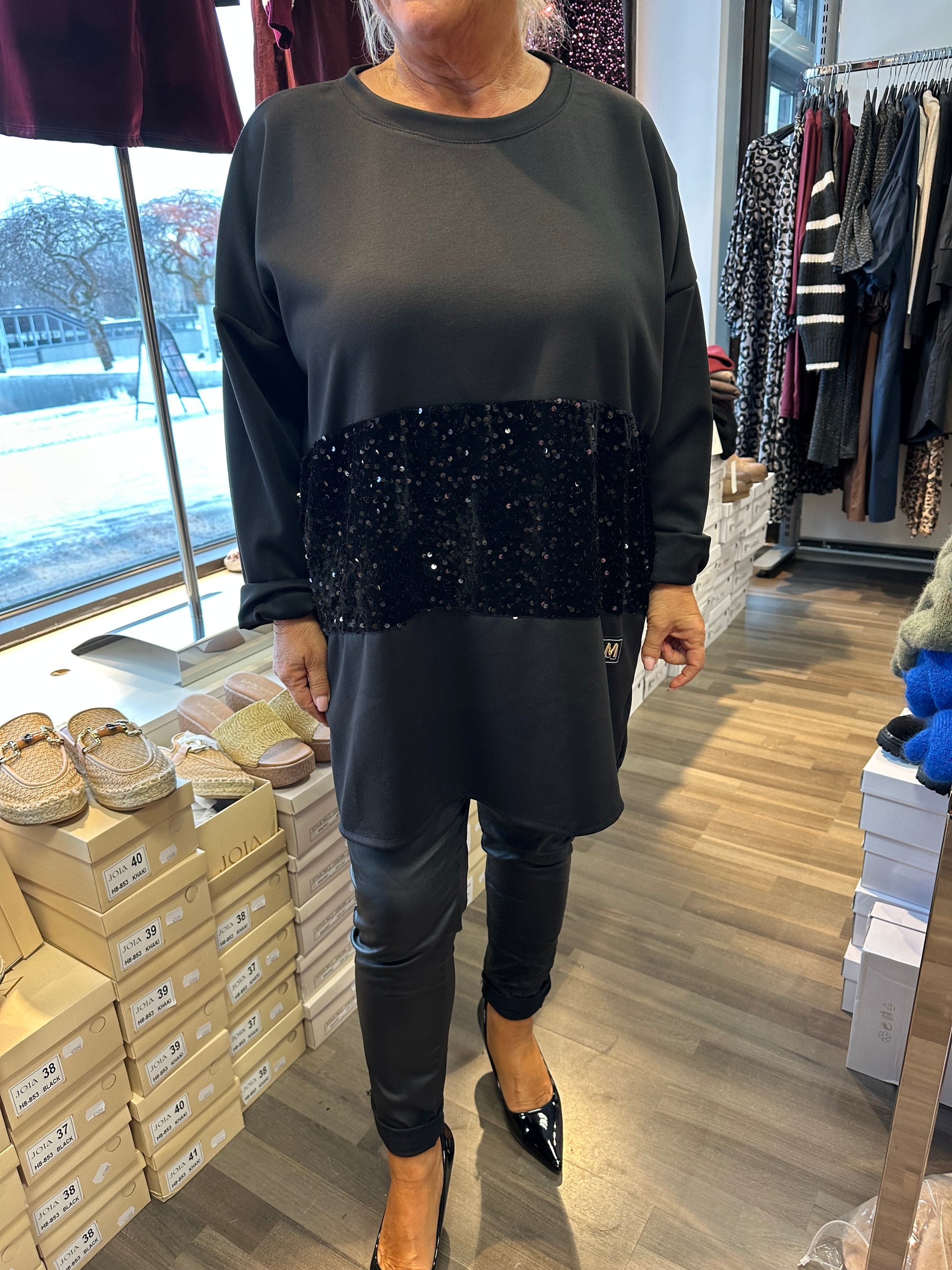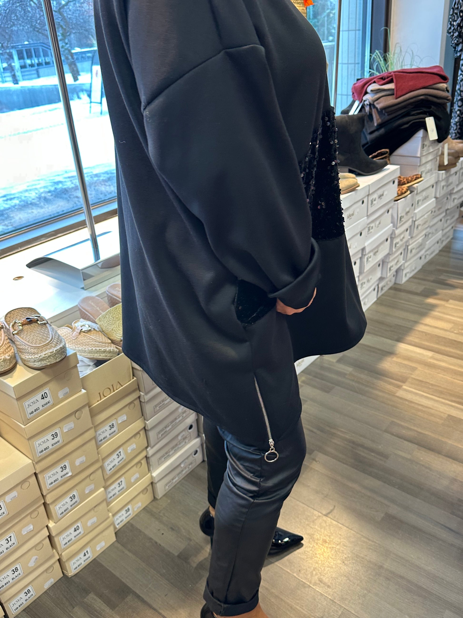 Reilummankokoinen collegetunika paljettikoristeilla. Helma sivuilta hieman pidempi ja helmassa vetoketjukoristeet.