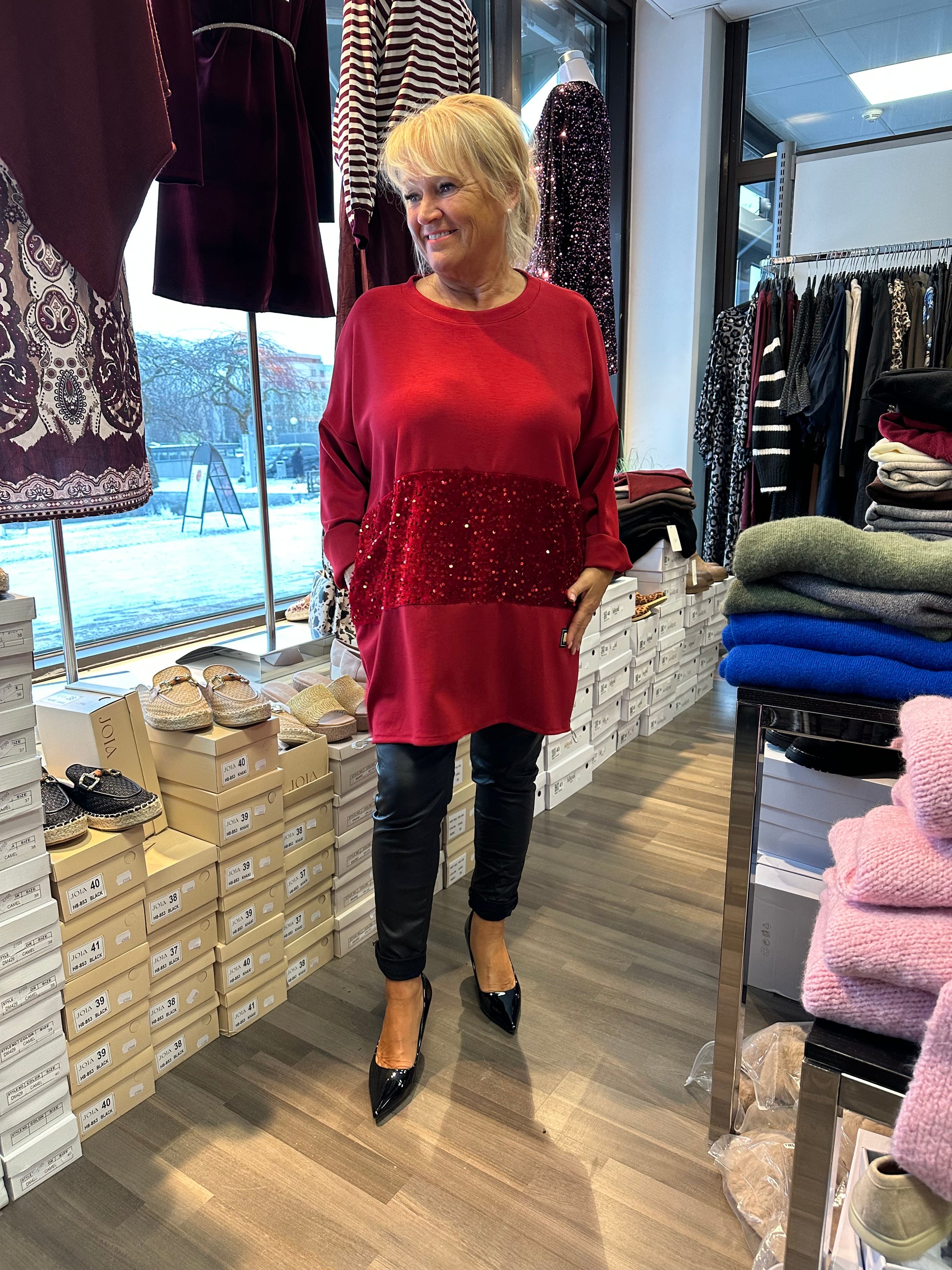 Reilummankokoinen collegetunika paljettikoristeilla. Helma sivuilta hieman pidempi ja helmassa vetoketjukoristeet.