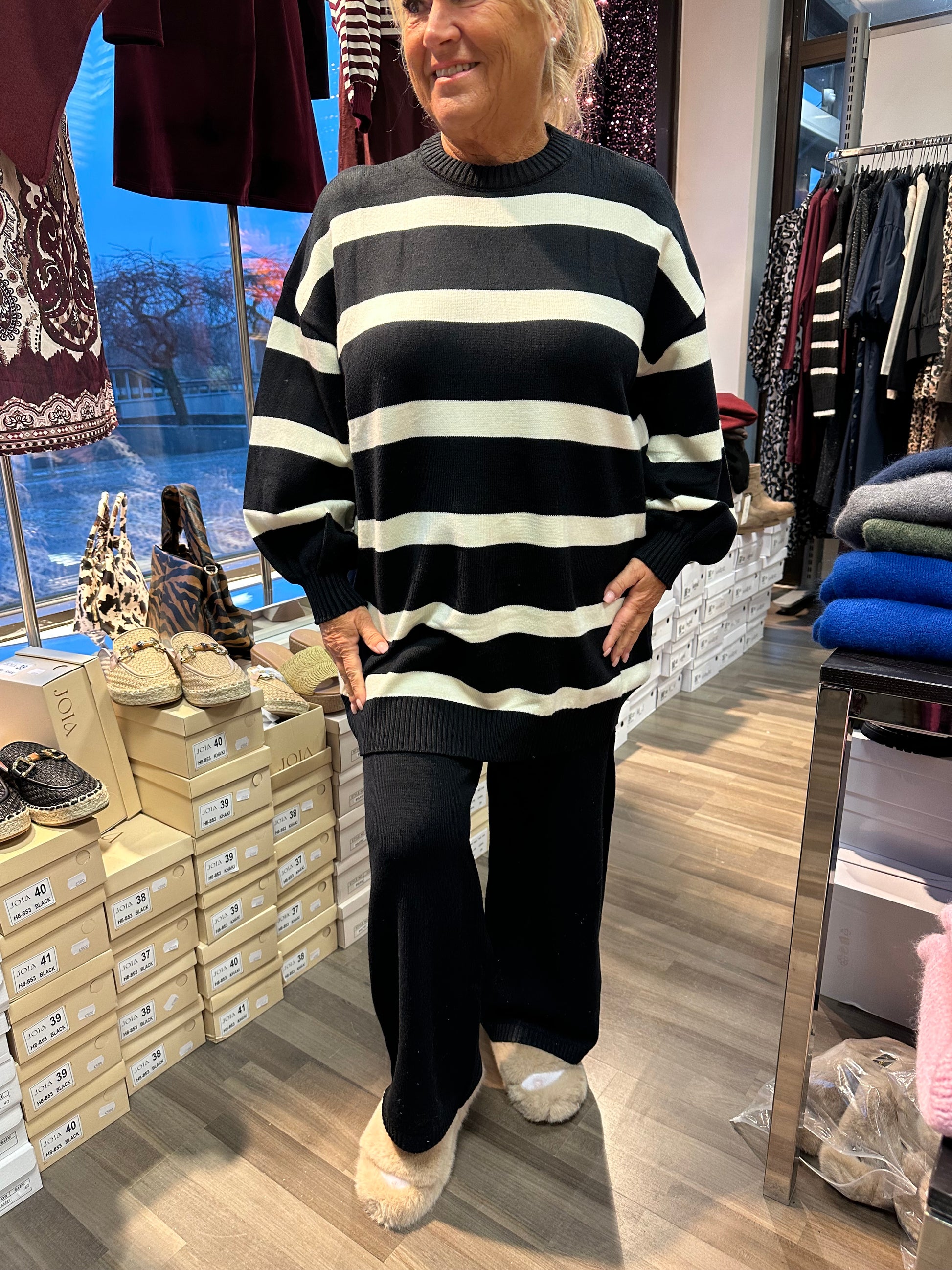 Kiva reilummankokoinen neuleasu! Asuun kuuluu pidempi neuletunika, jossa resorit hihansuissa, helmassa ja pääntiellä, sekä leveälahkeiset neulehousut. Housuissa joustava resorivyötärö.