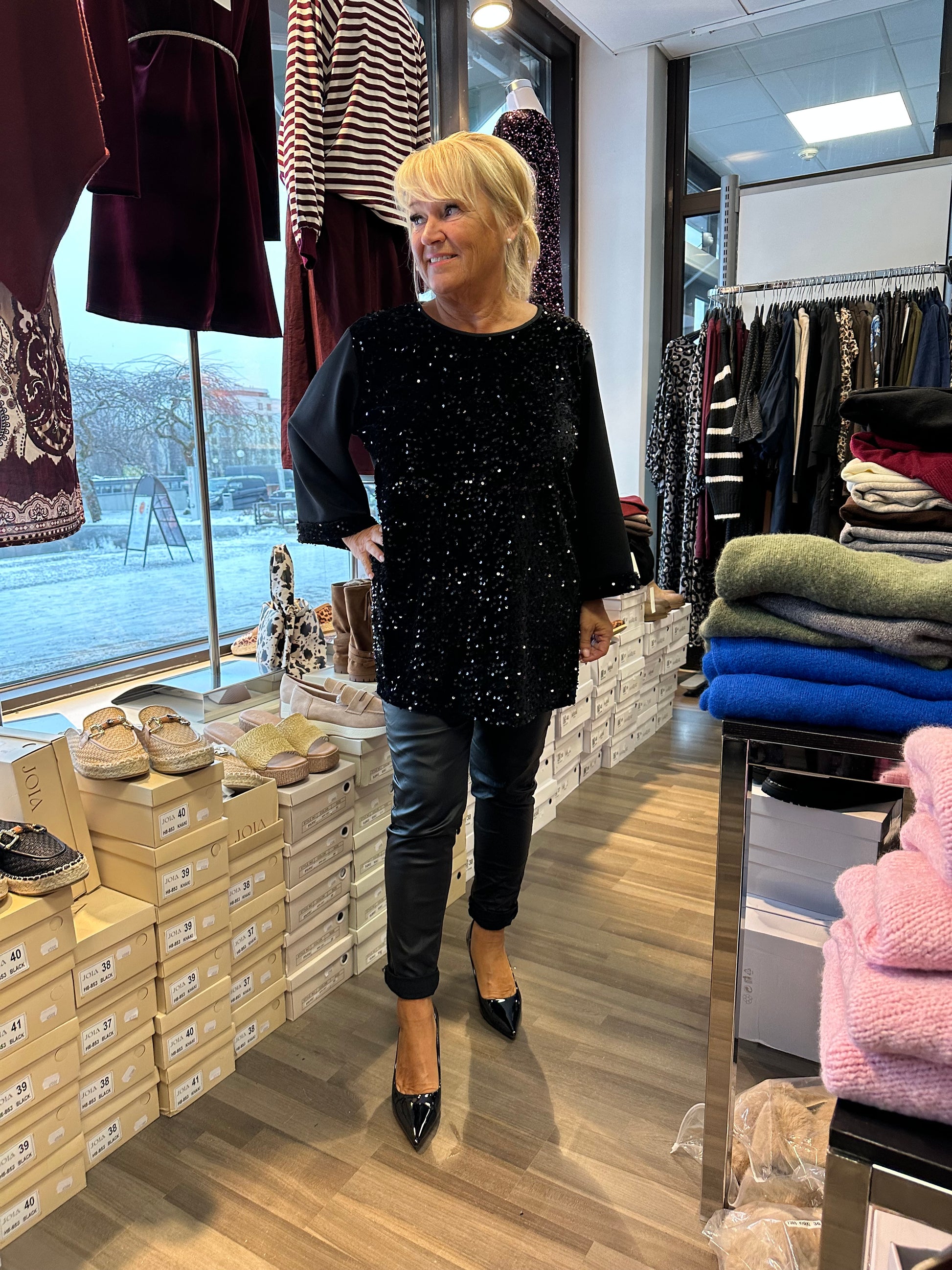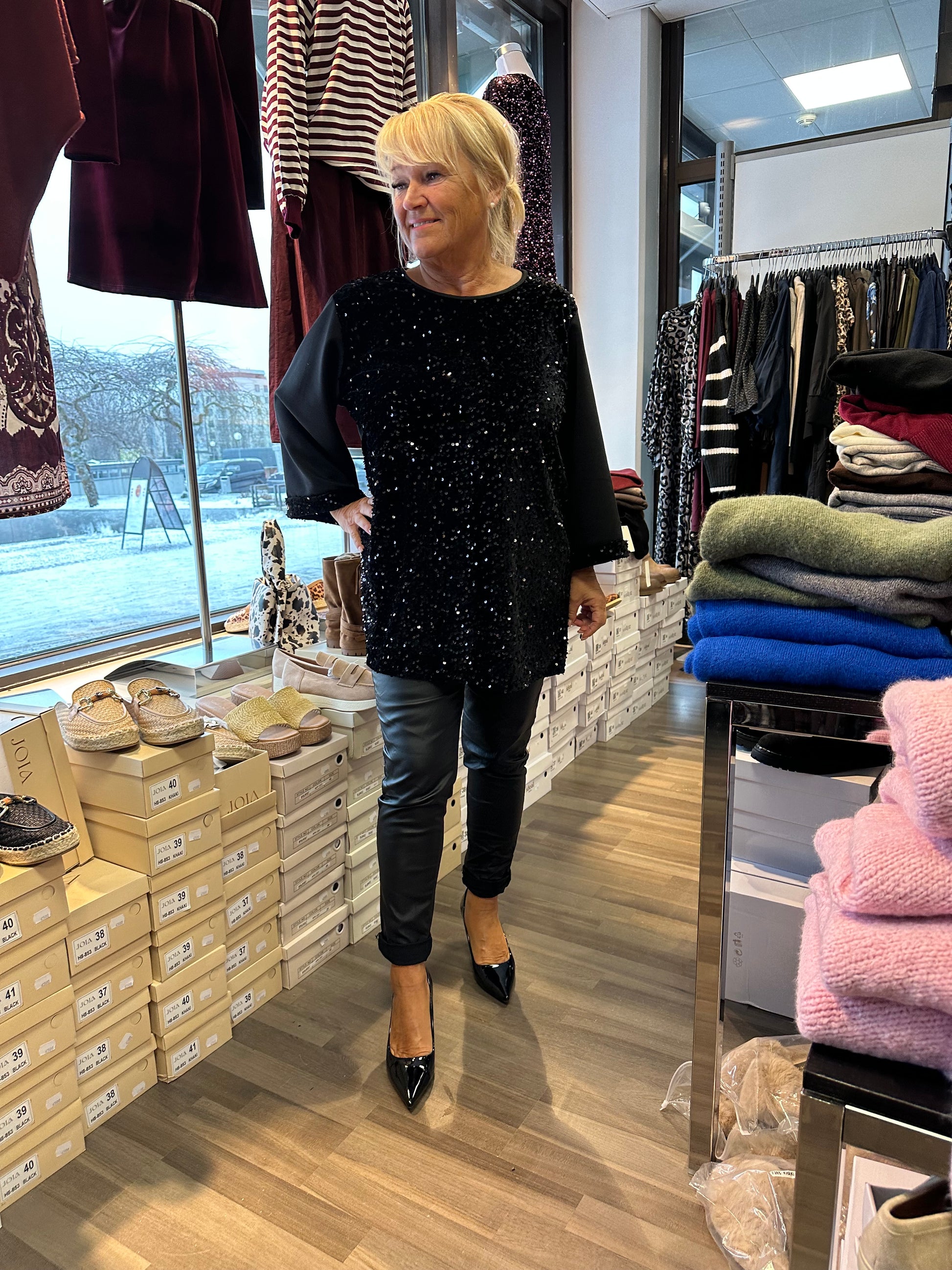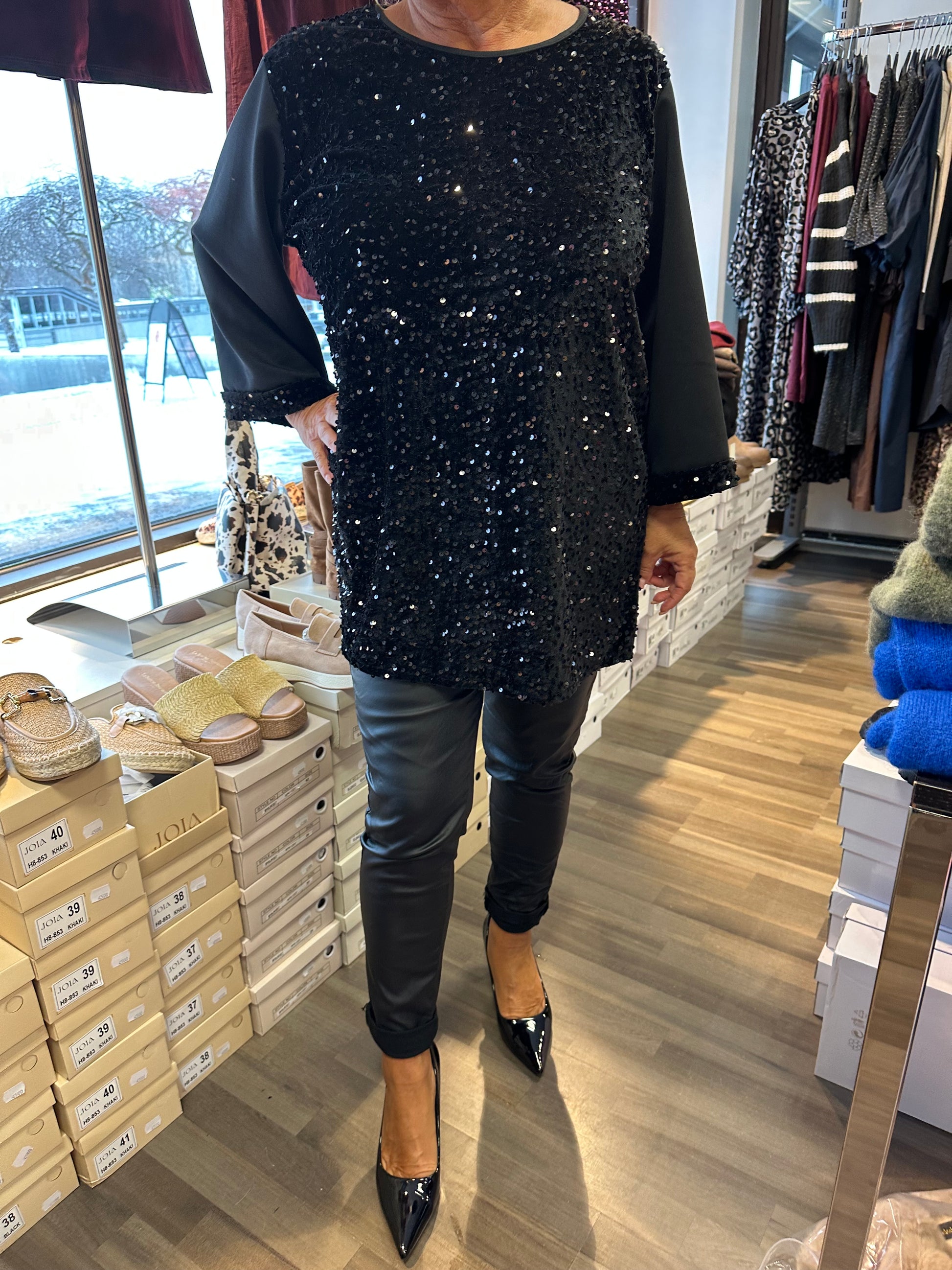 Reilummankokoinen paljettipusero vajaamittaisilla leveillä hihoilla. Selkäpuoli ilman paljetteja ja miellyttävä trikookangas.