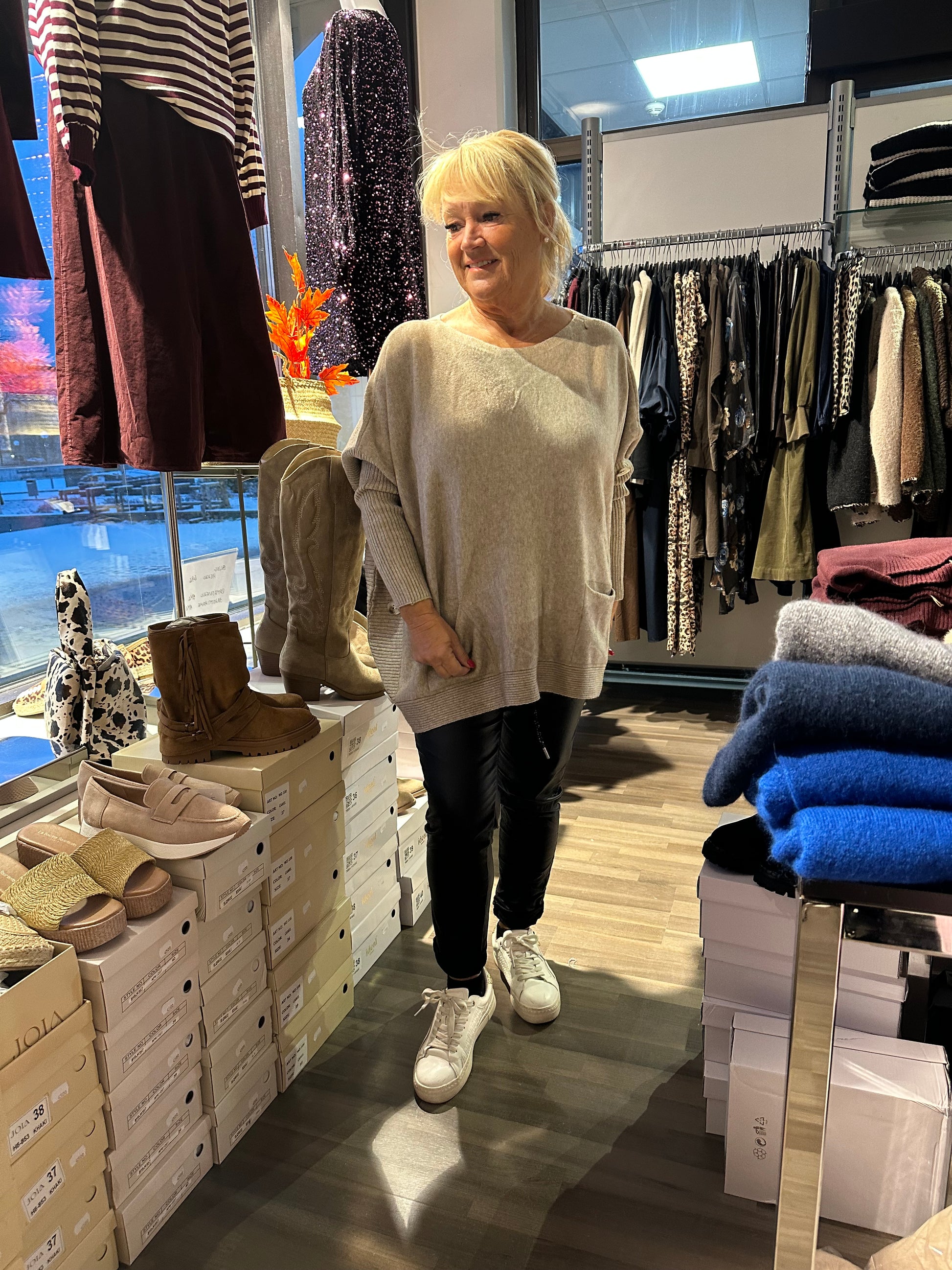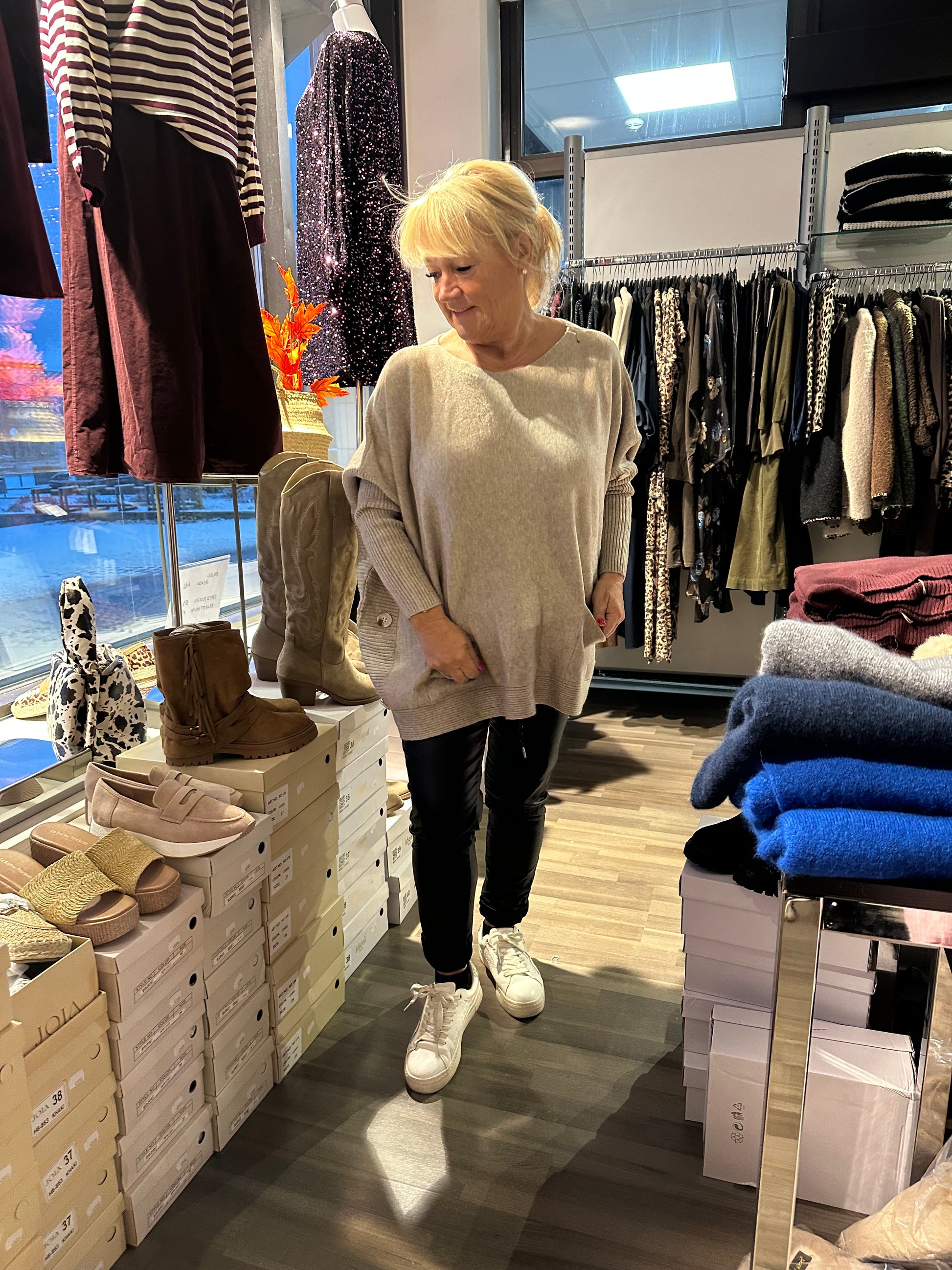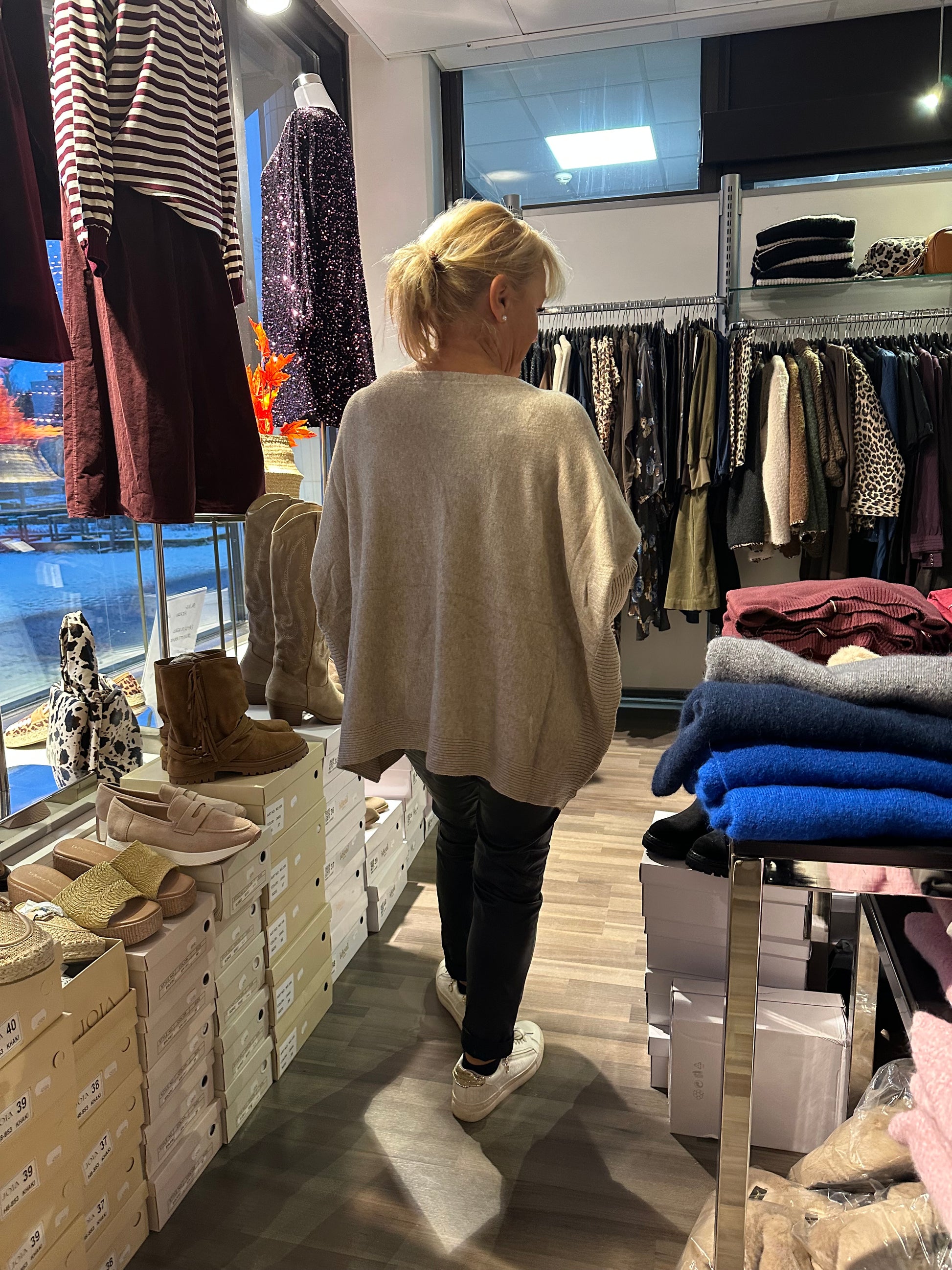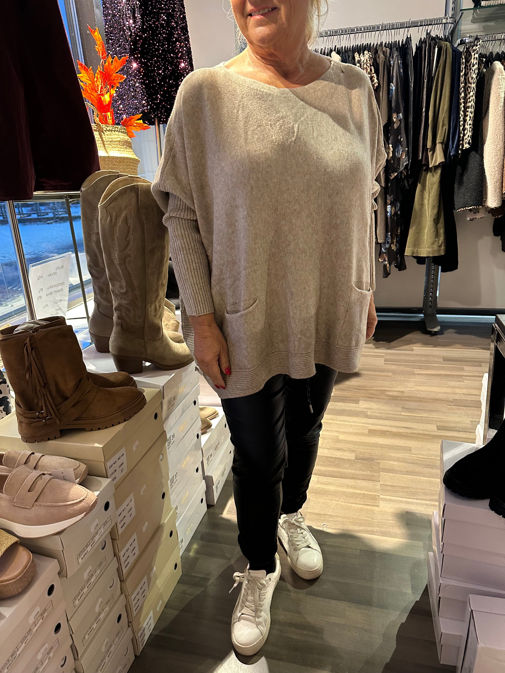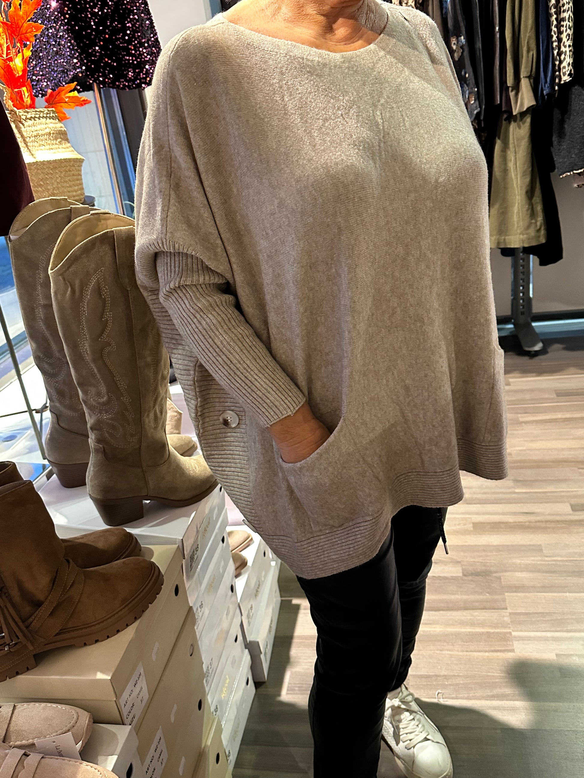 Miellyttävän tuntuinen leveä pontsoneule! Nappikoristeet ja pienet taskut edessä. Pitkät resorihihat. Kiva liukaspintainen neulos.