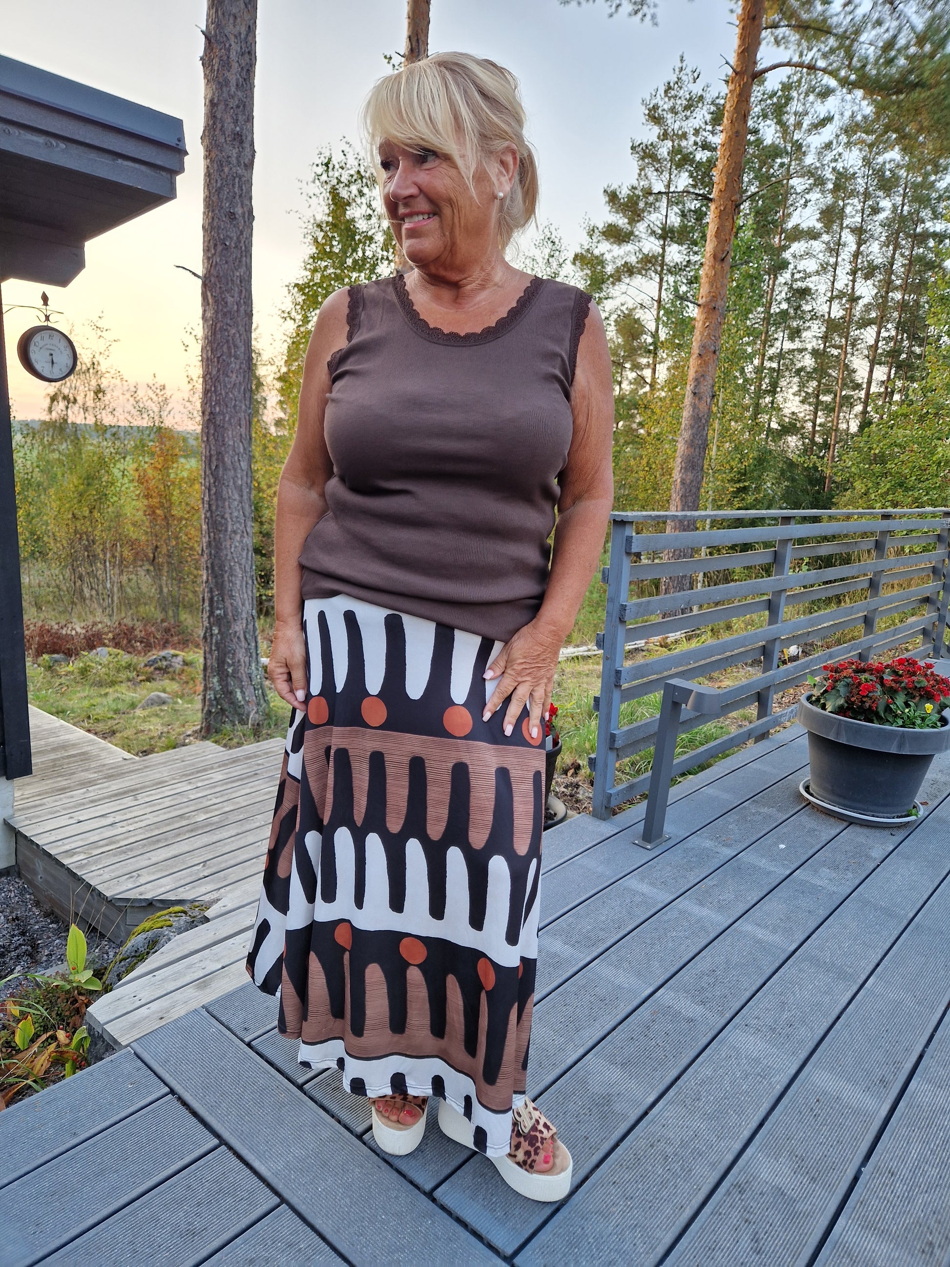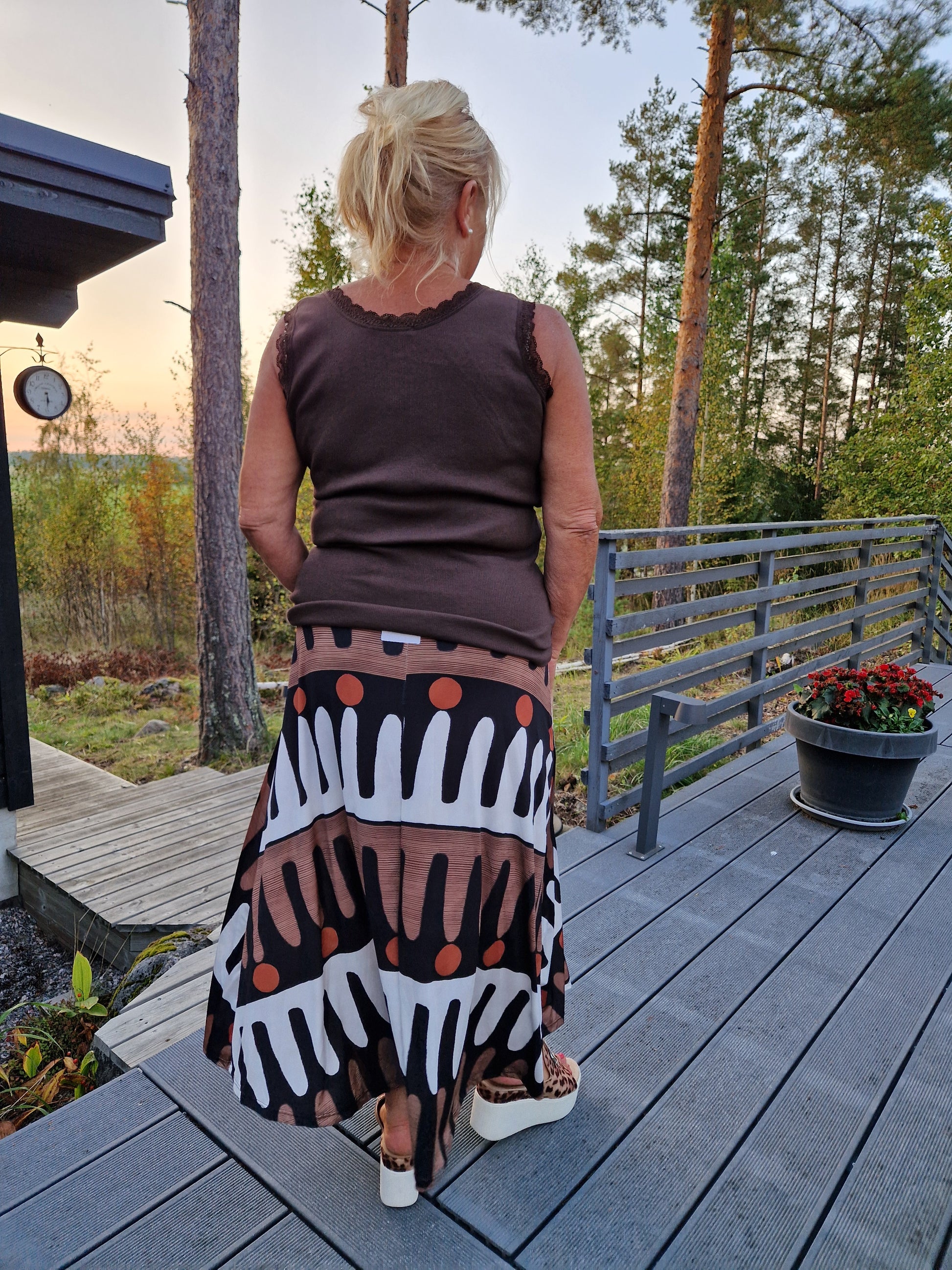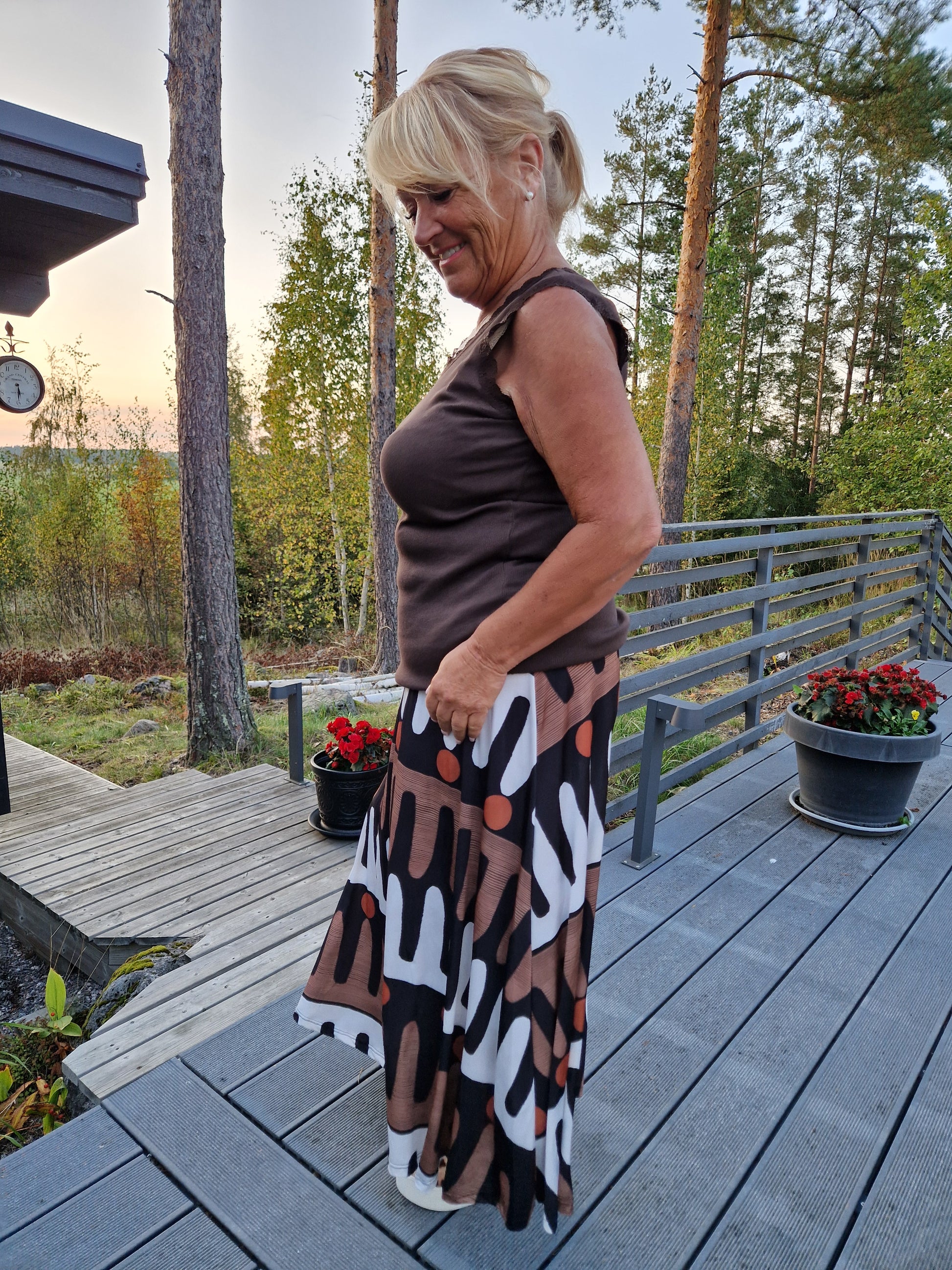 Laskeutuva, kuminauhavyötäröllinen hame. A-linjainen.