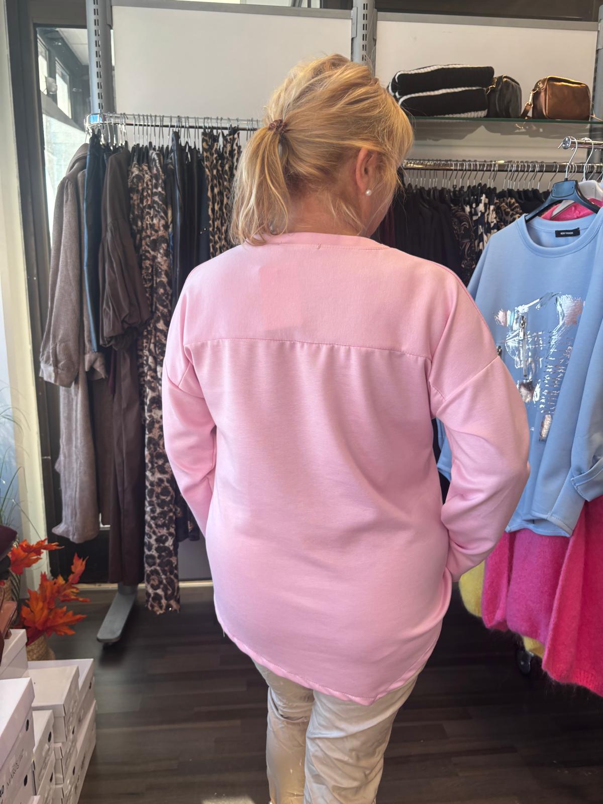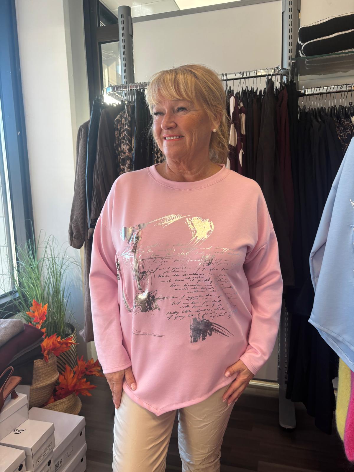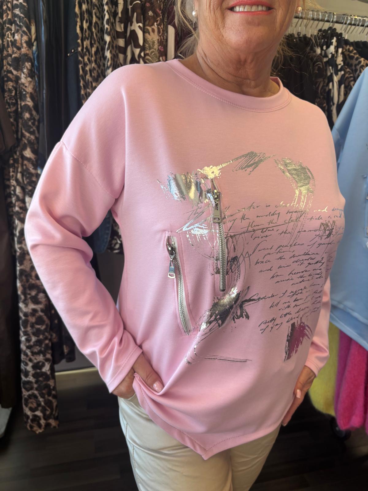 Pusero/ tunika, jossa epäsymmetrinen helma. Vetoketjukoristeet ja kirjoitusta. Kirjoitus antaa puseroon ilmettä, mutta ei siitä saa selvää! O-aukkpinen pääntie, nyt ei ole iso eikä pieni!