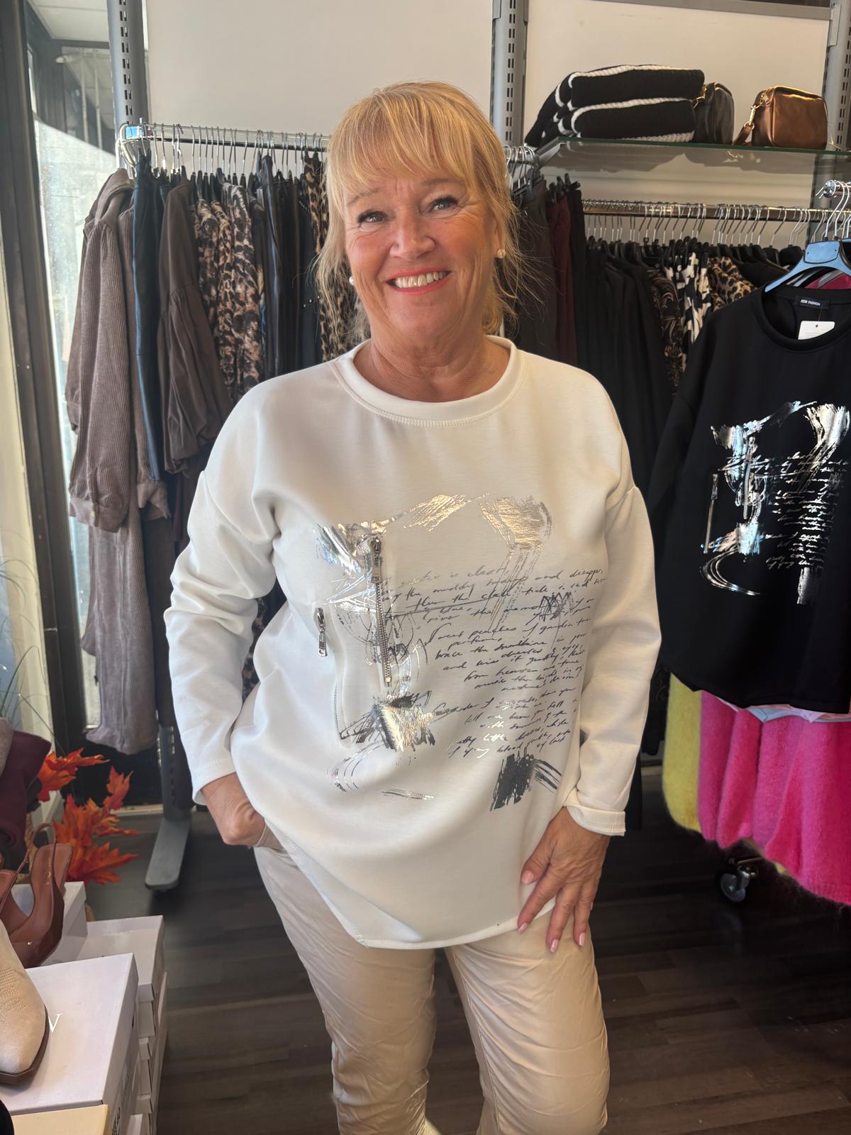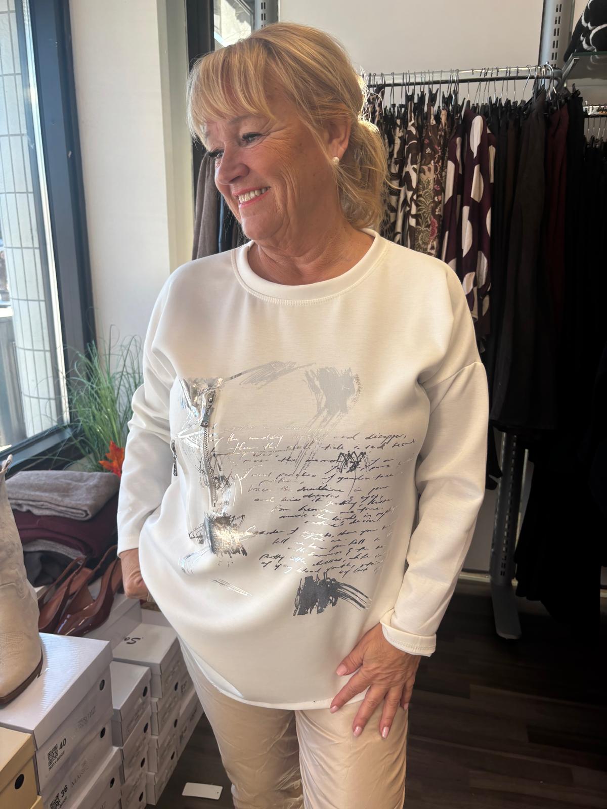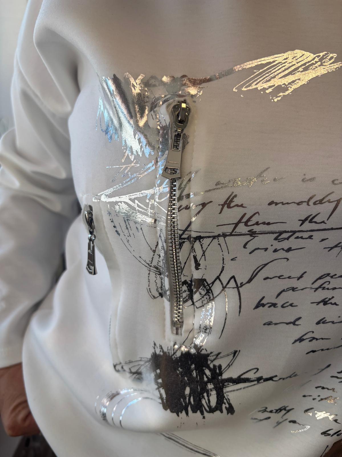 Pusero/ tunika, jossa epäsymmetrinen helma. Vetoketjukoristeet ja kirjoitusta. Kirjoitus antaa puseroon ilmettä, mutta ei siitä saa selvää! O-aukkpinen pääntie, nyt ei ole iso eikä pieni!
