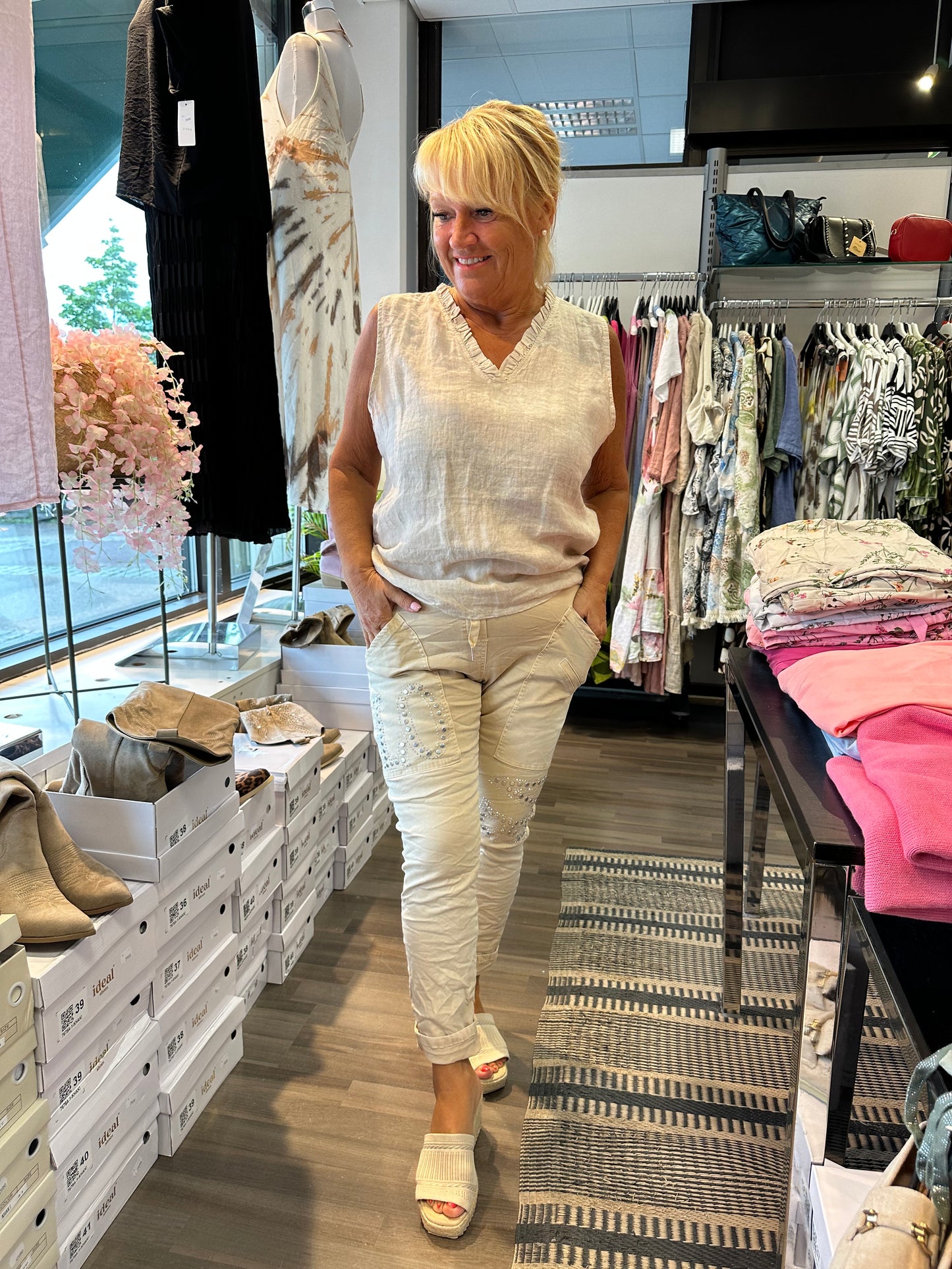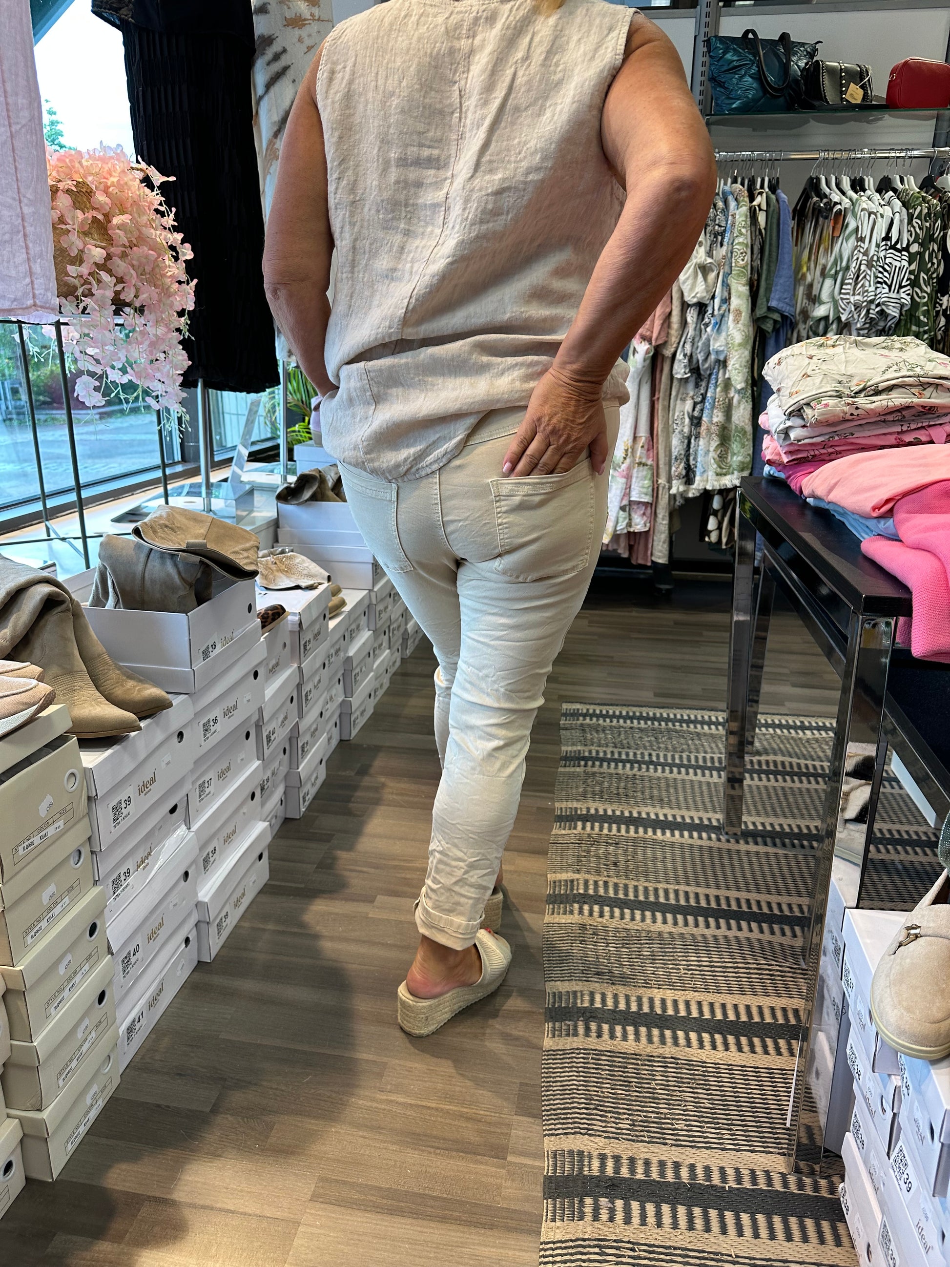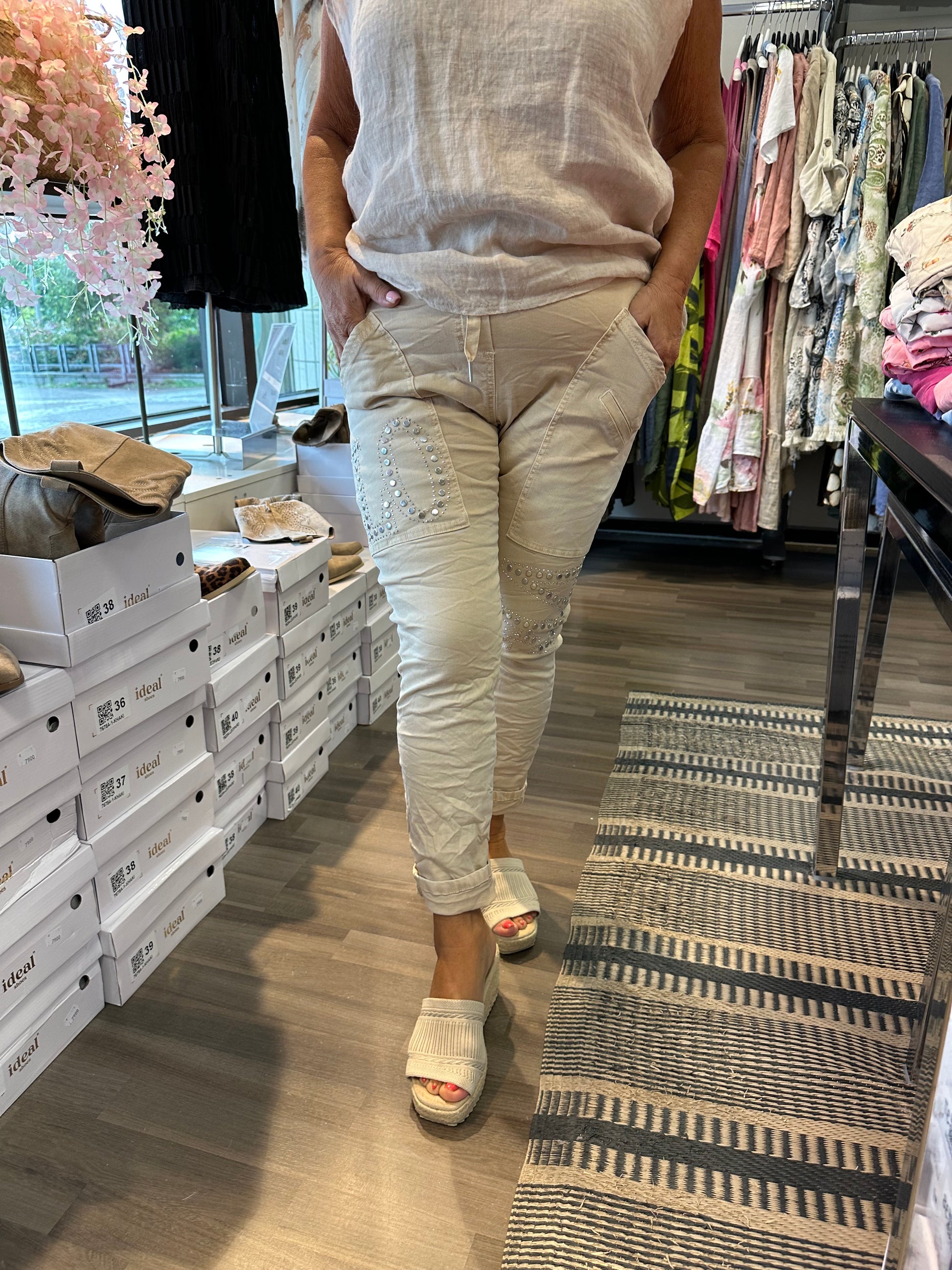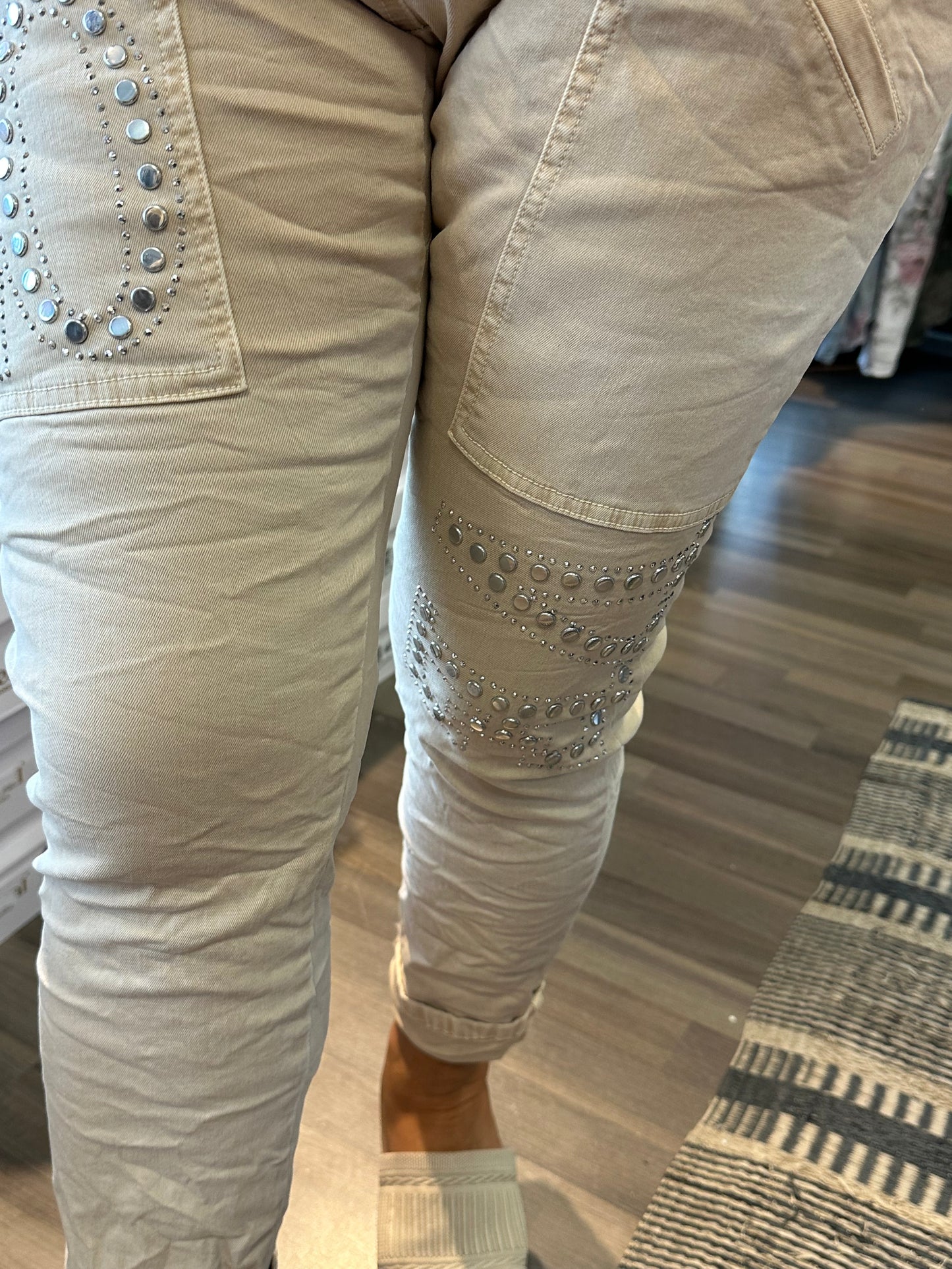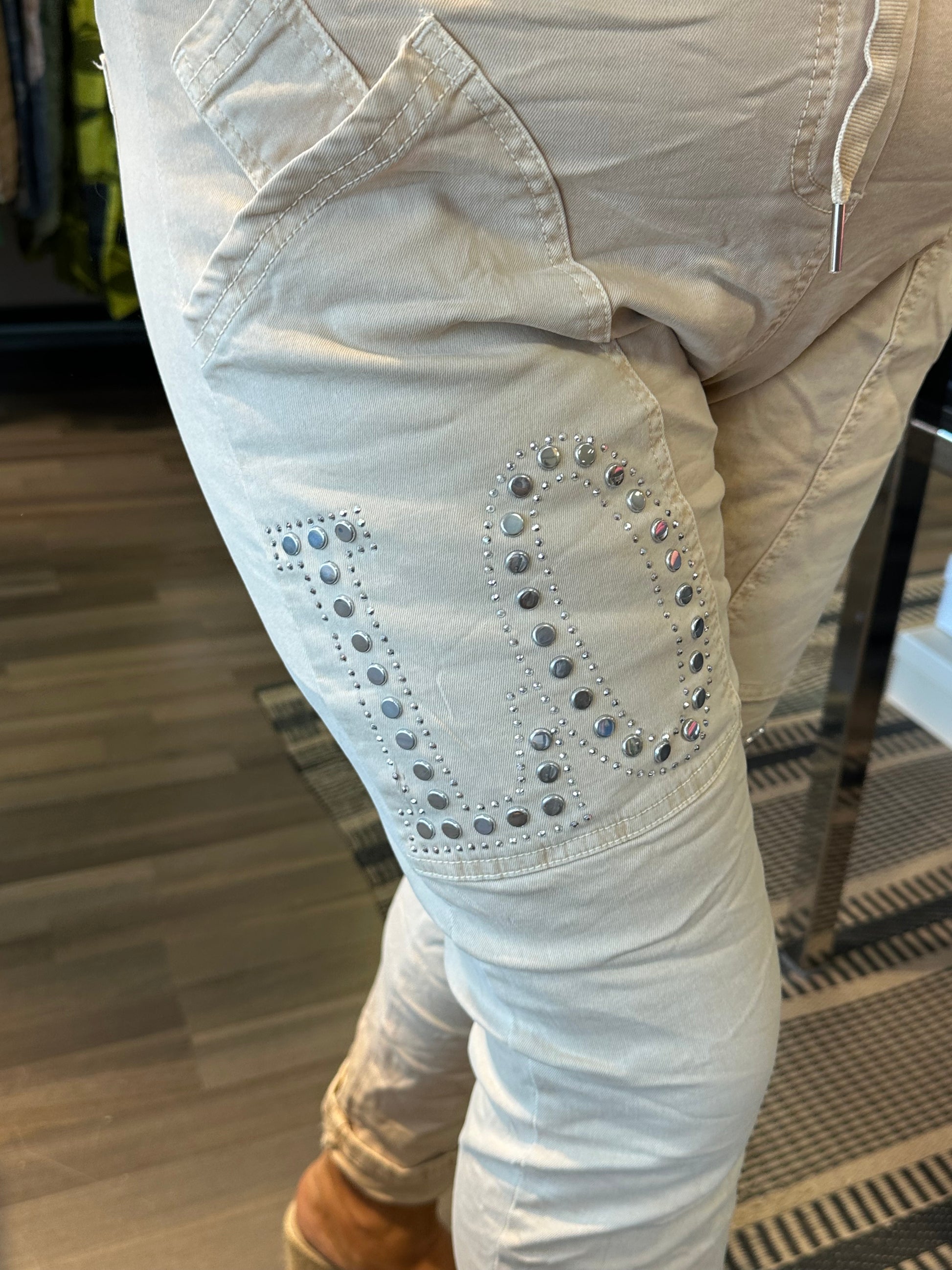 Makeet housut joustavaa puuvillaa. Mukava korkeavyötärö, jossa joustava resori ja nyörit. Isot taskut ja koristeluja hopeisilla niiteillä.
