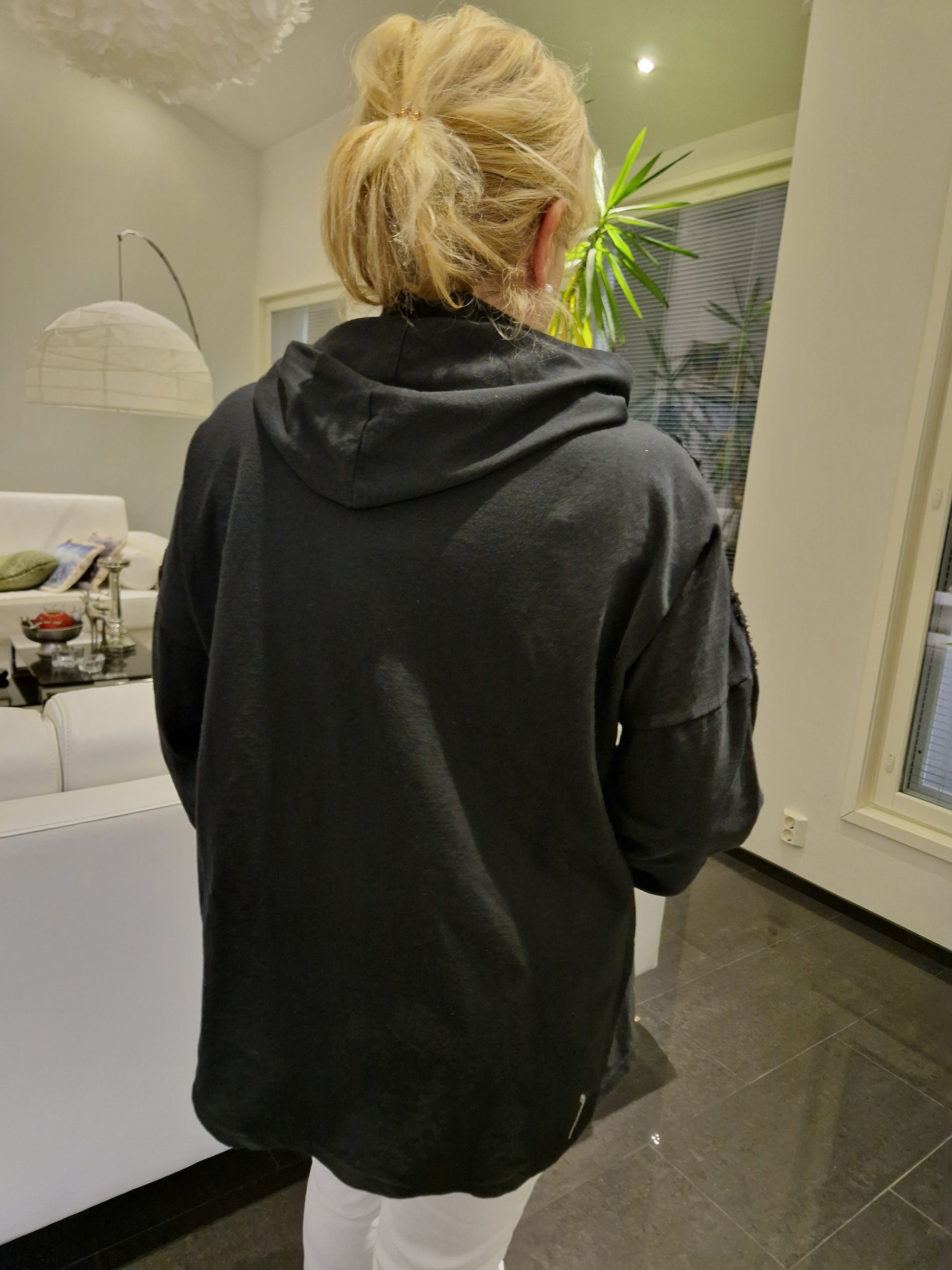 97% puuvilla 3% elastan, vetoketjukiinnitys ja taskut edessä. Huppu. Kirjailtu etuosan yläosassa.
