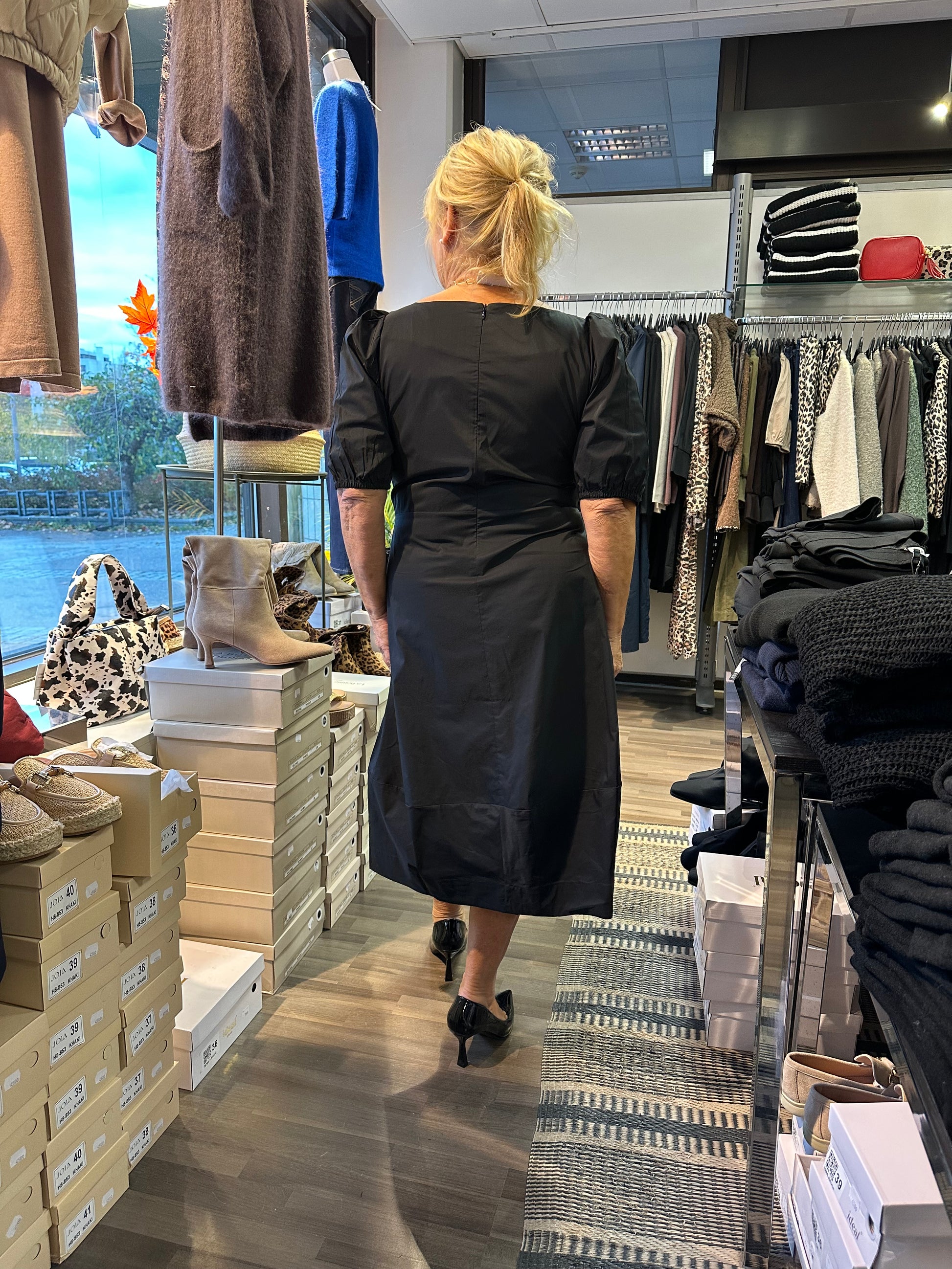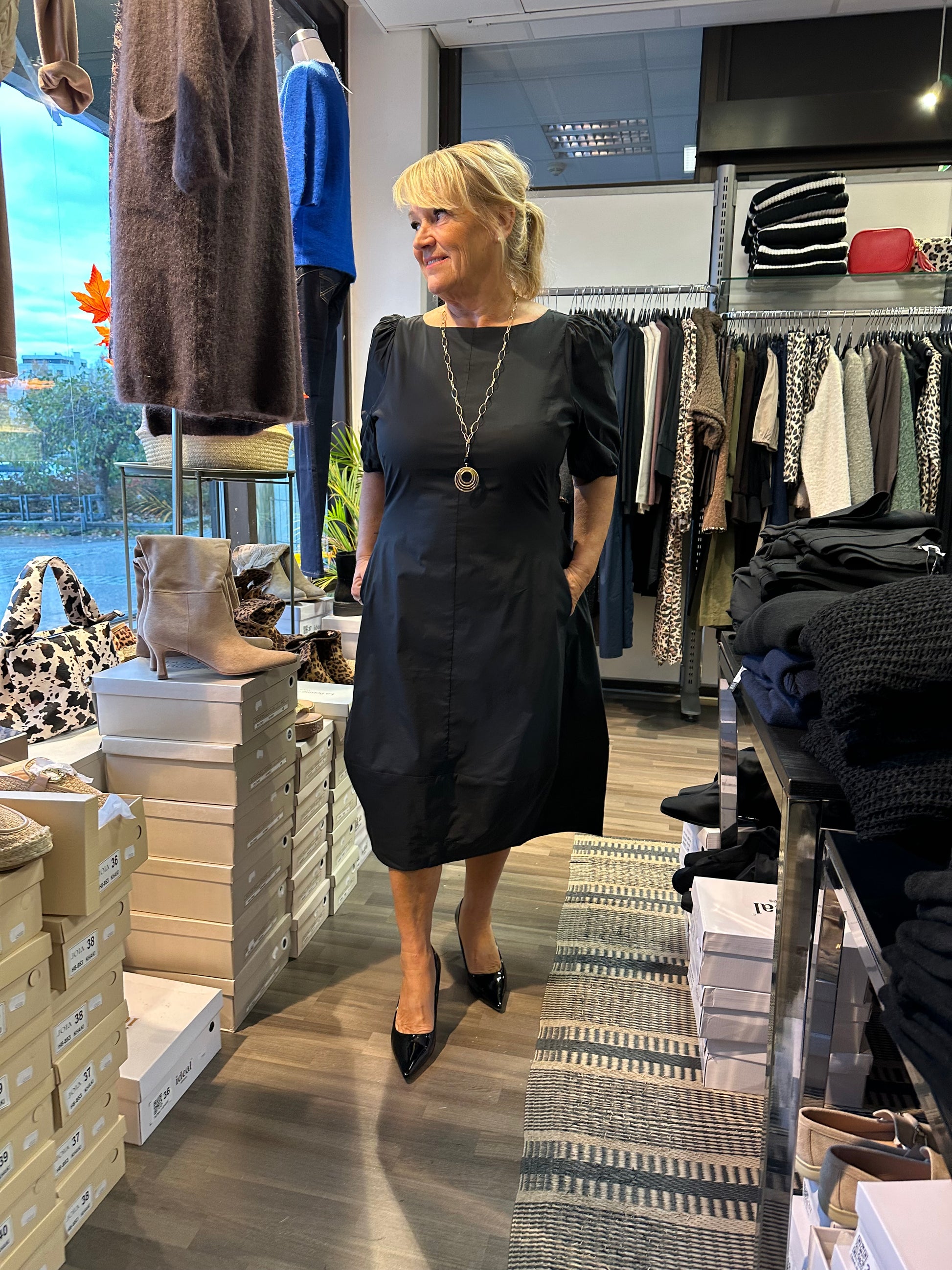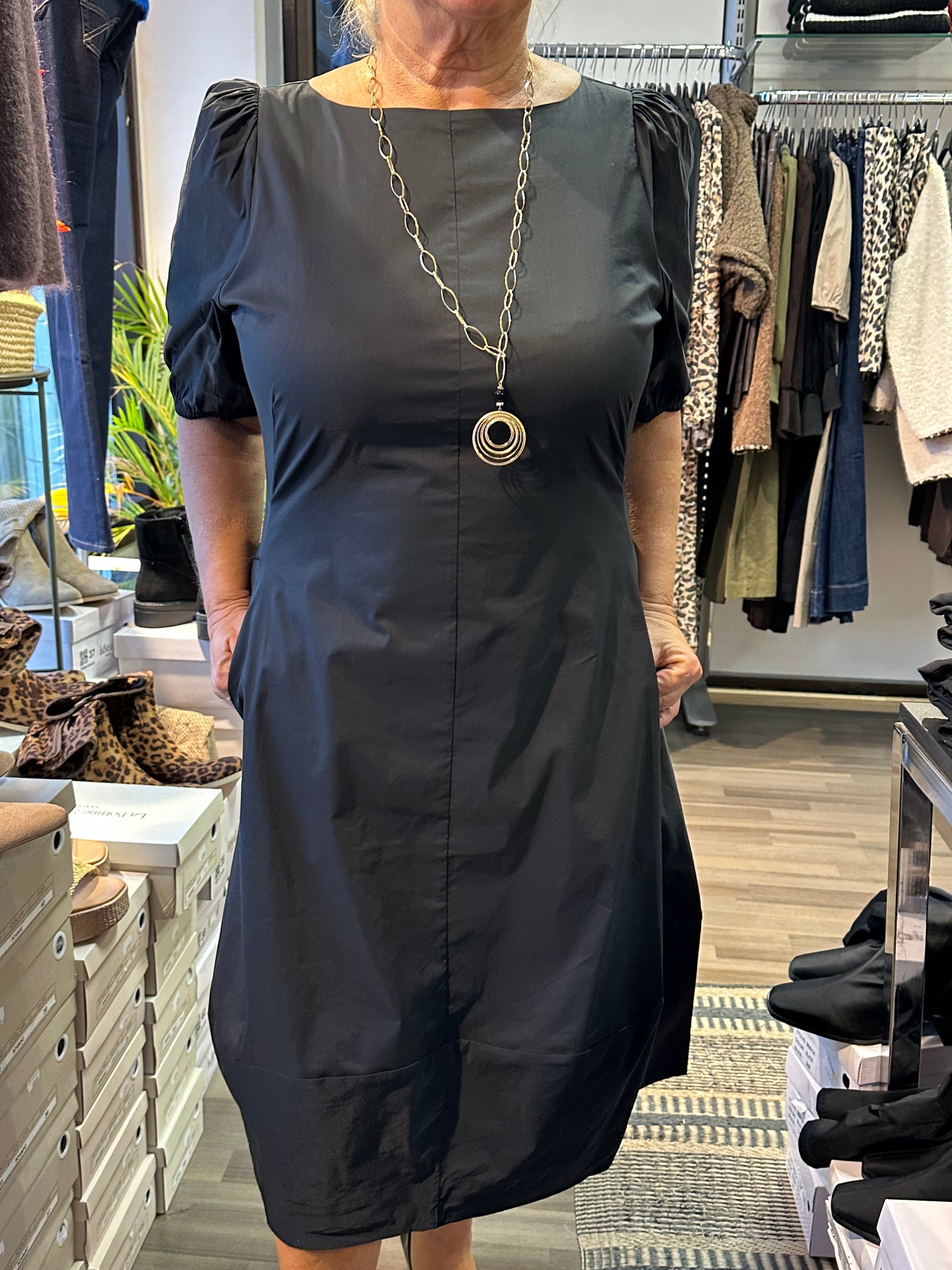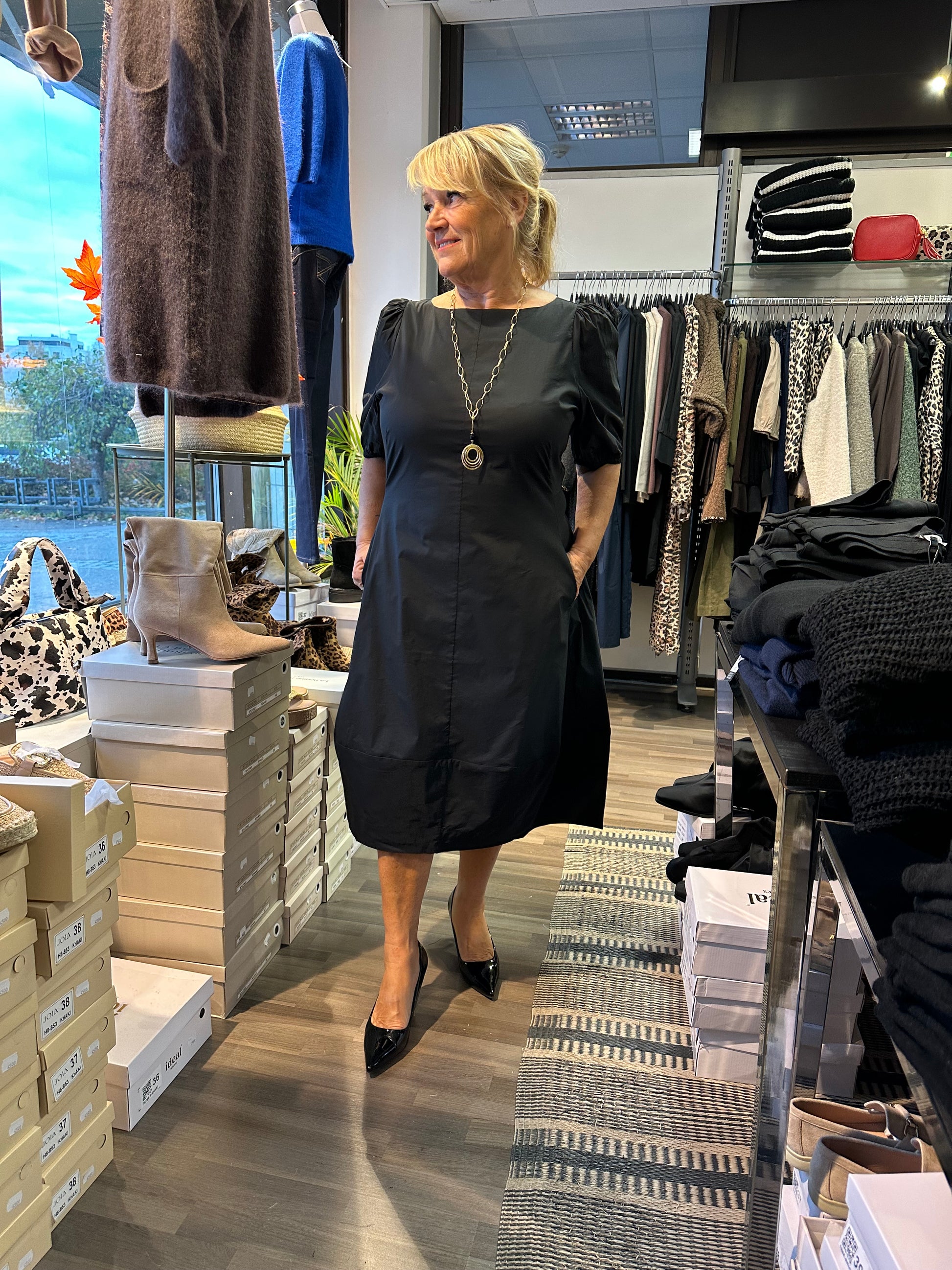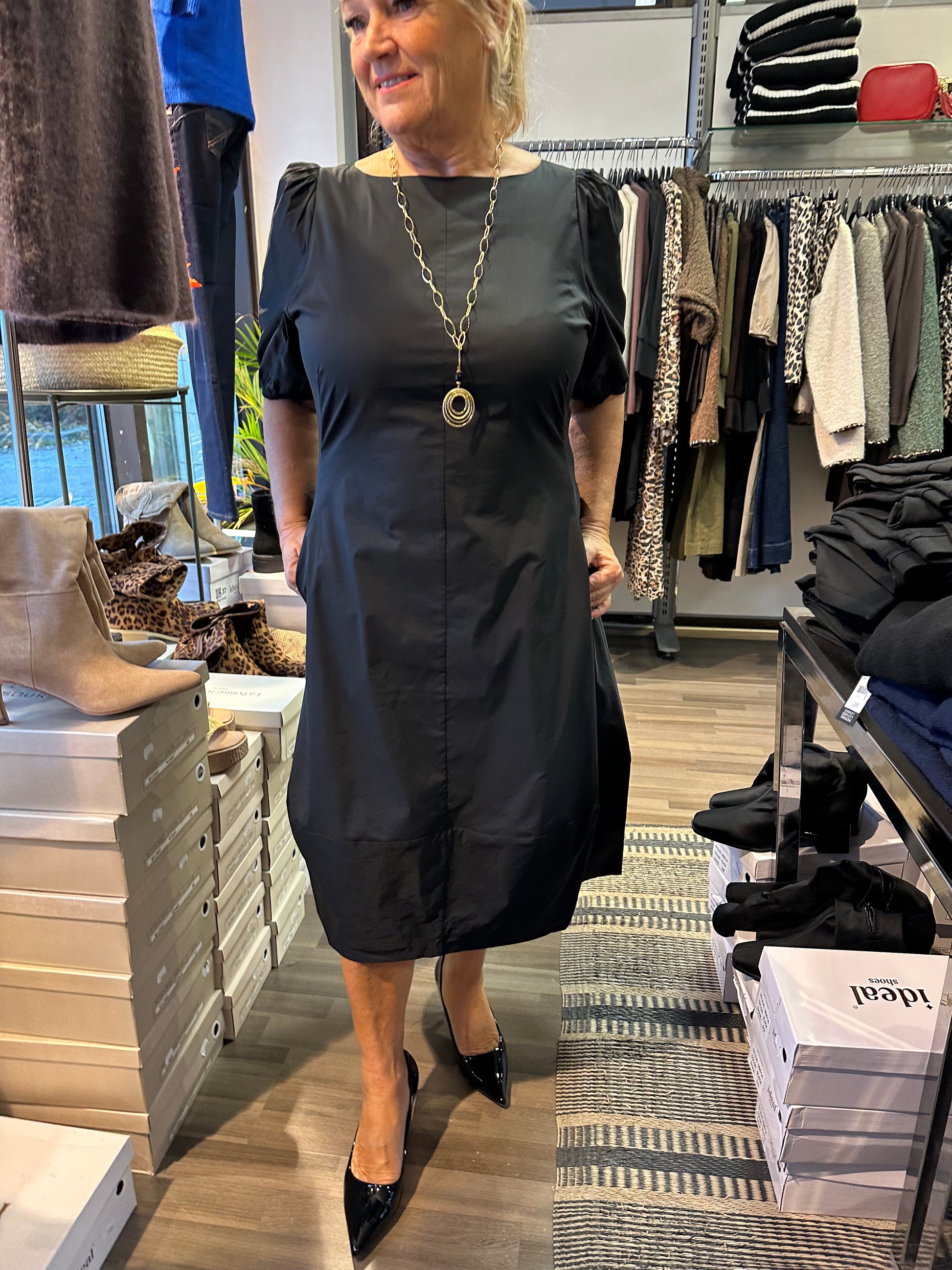 Mukavan tuntuinen, tulppaanihelmainen mekko puuvillapopliinia. Lyhyet puhvihihat ja hihansuissa joustava kuminauha. Kaunis venepääntie. Taskut sivuilla. Selässä vetoketju.