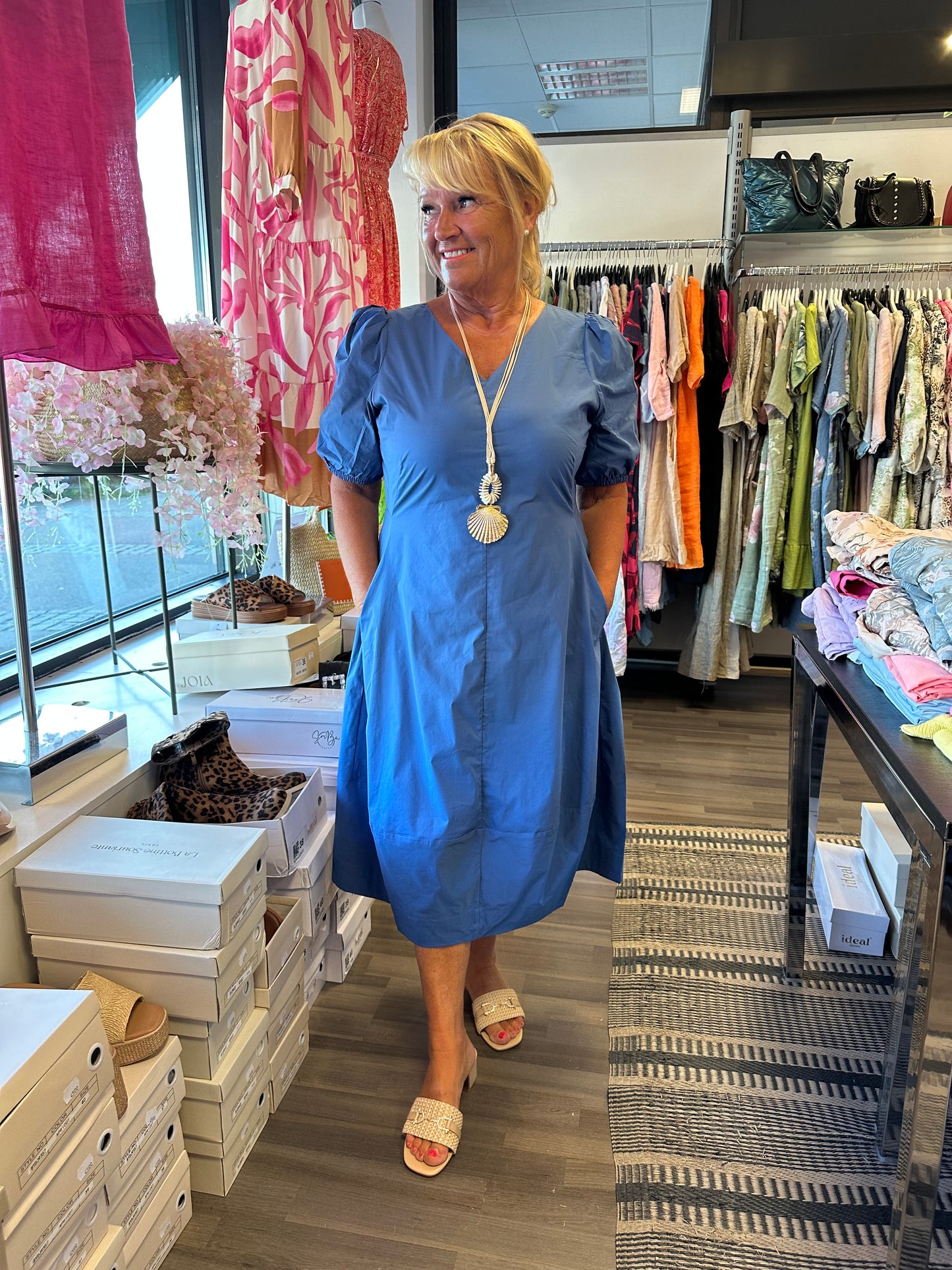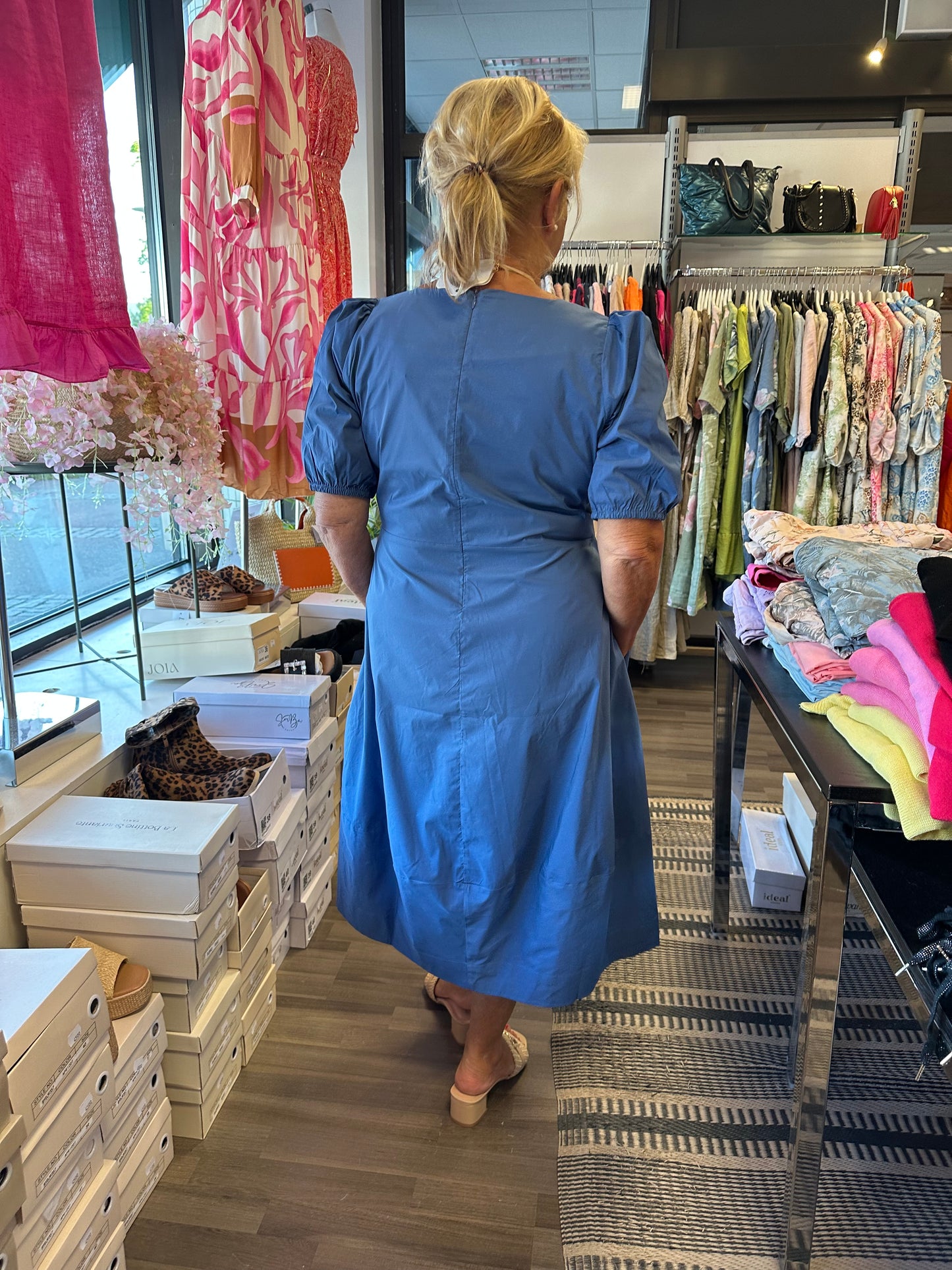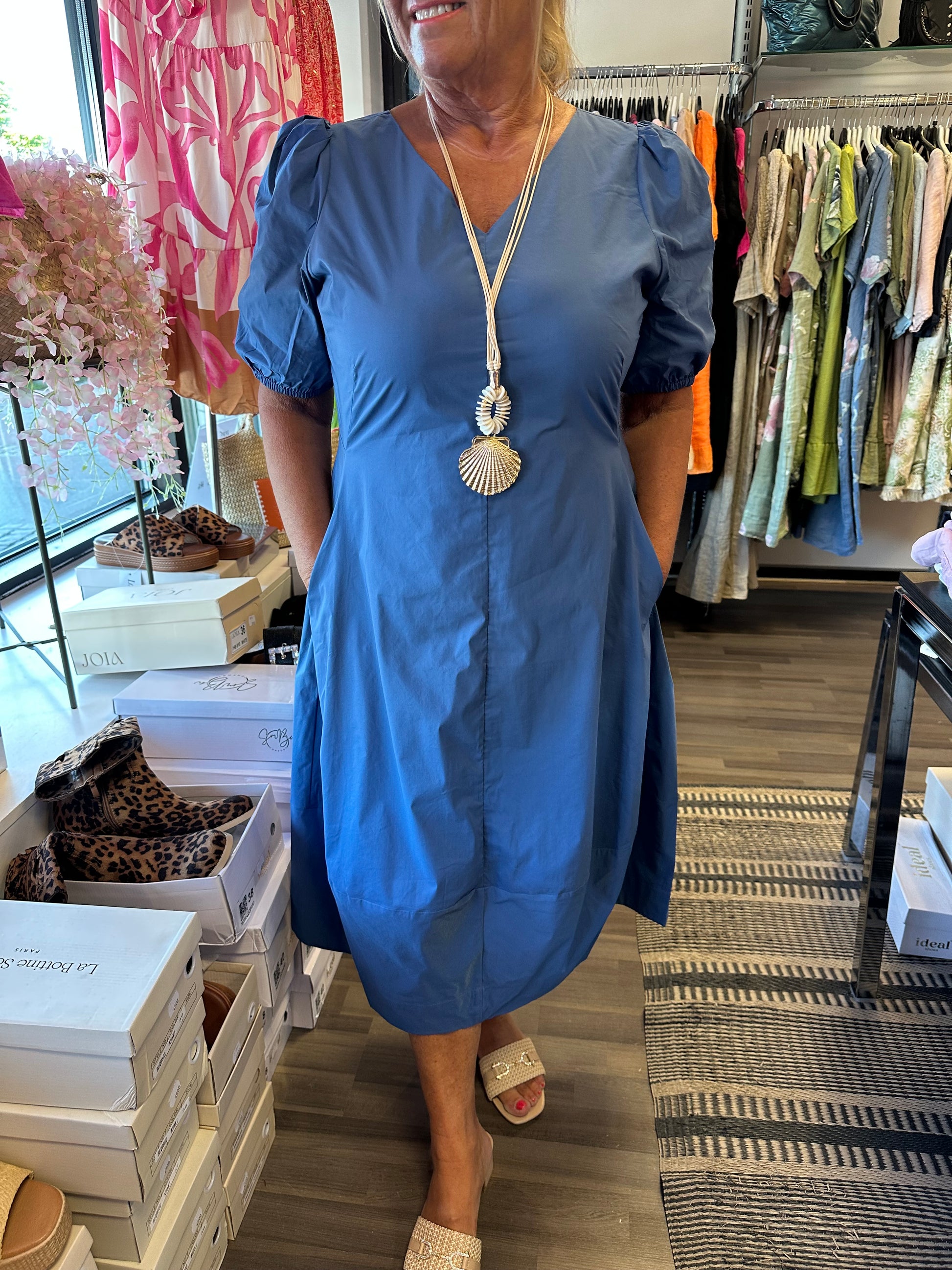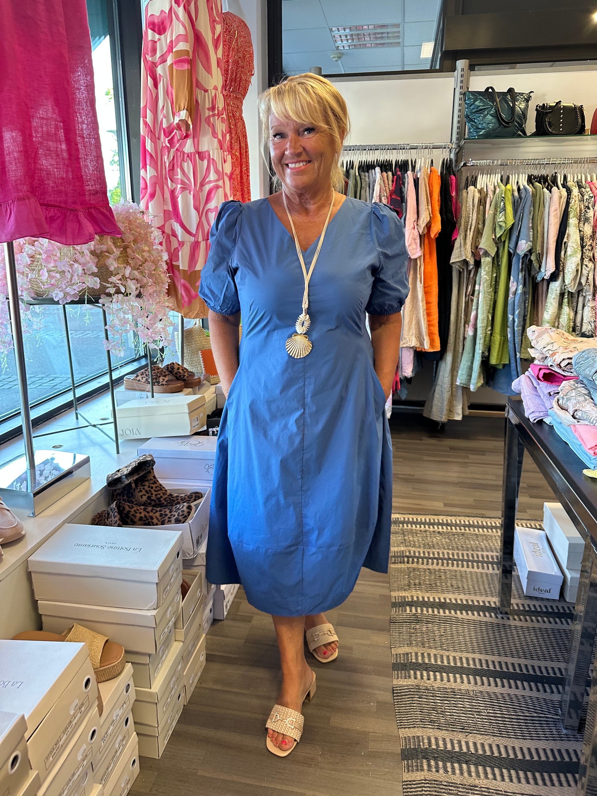 Mukavan tuntuinen, tulppaanihelmainen mekko puuvillapopliinia. Lyhyet puhvihihat ja hihansuissa joustava kuminauha. V-pääntie. Taskut sivuilla. Selässä vetoketju.