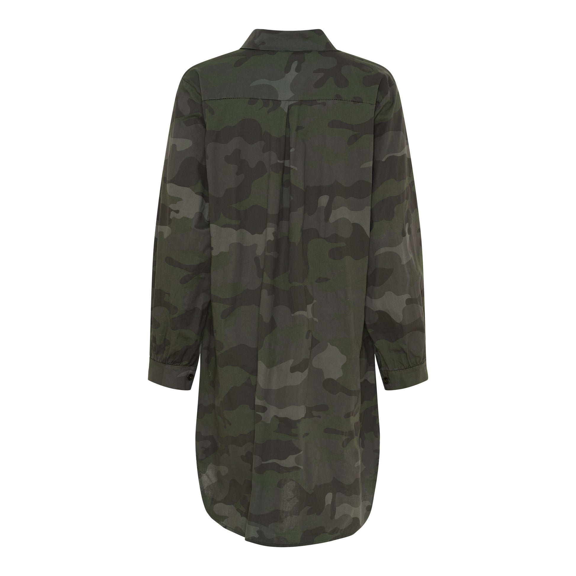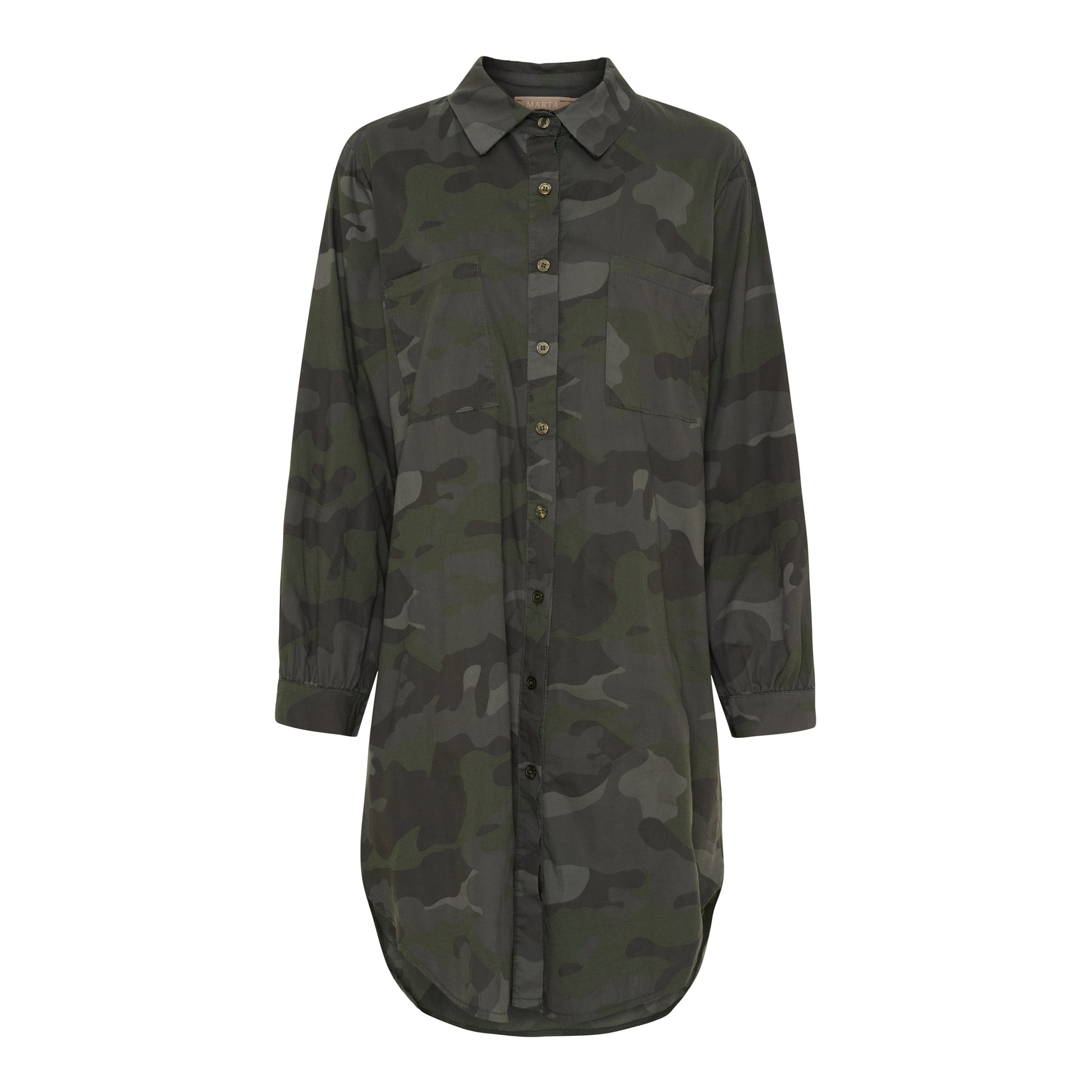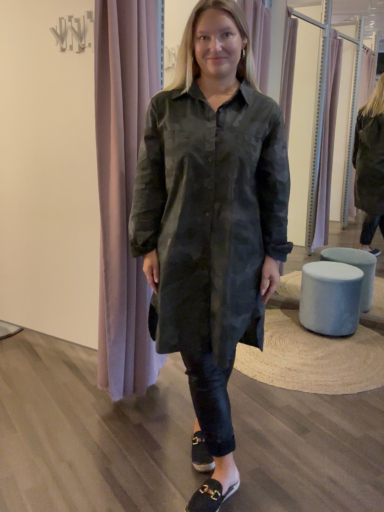 Tunika kevyttä puuvillaa. Napit edessä koko pituudelta, kaulukset ja rintataskut. Pitkät hihat ja napit hihansuissa. Kiva muotoon ommeltu helma.