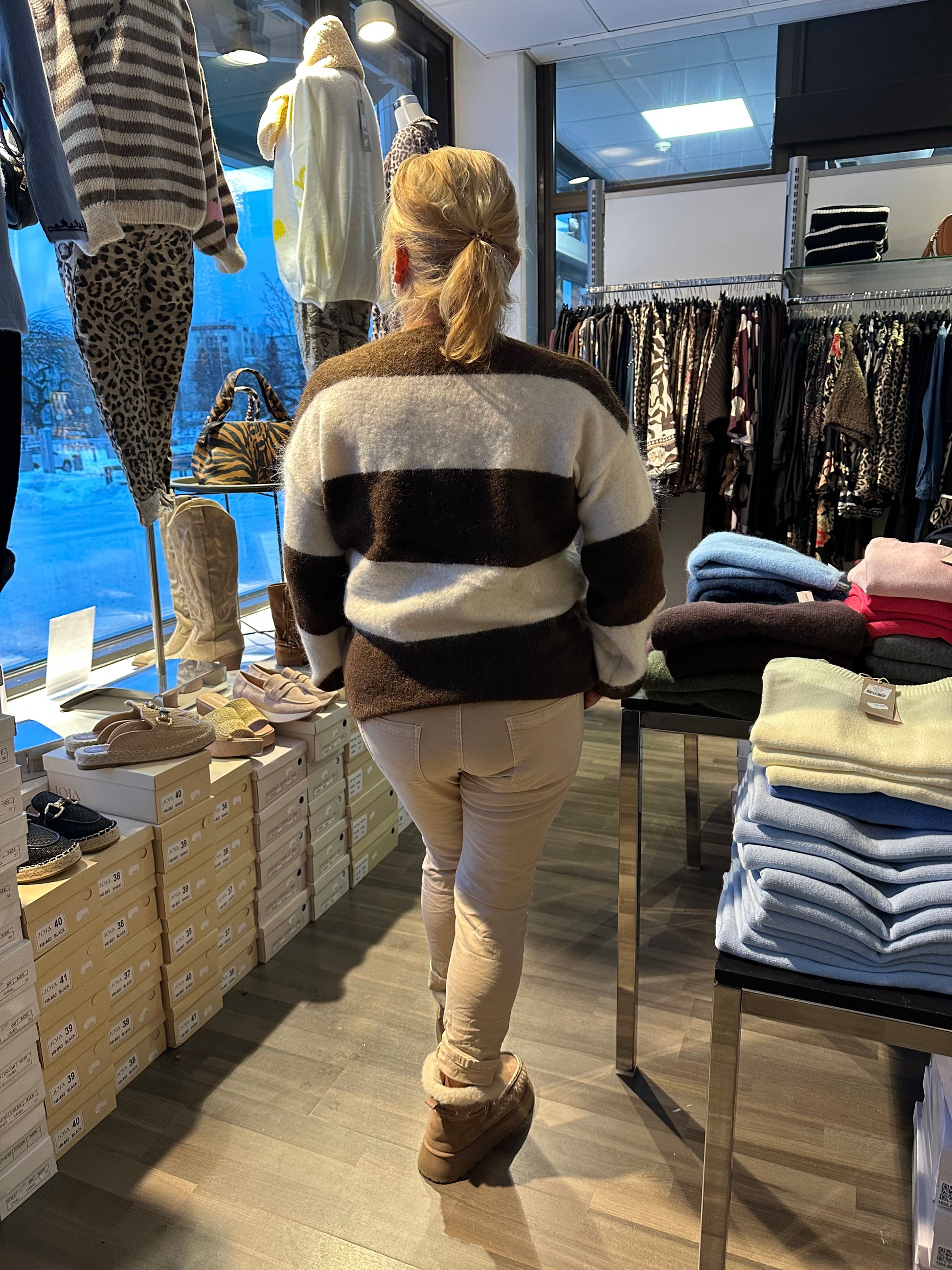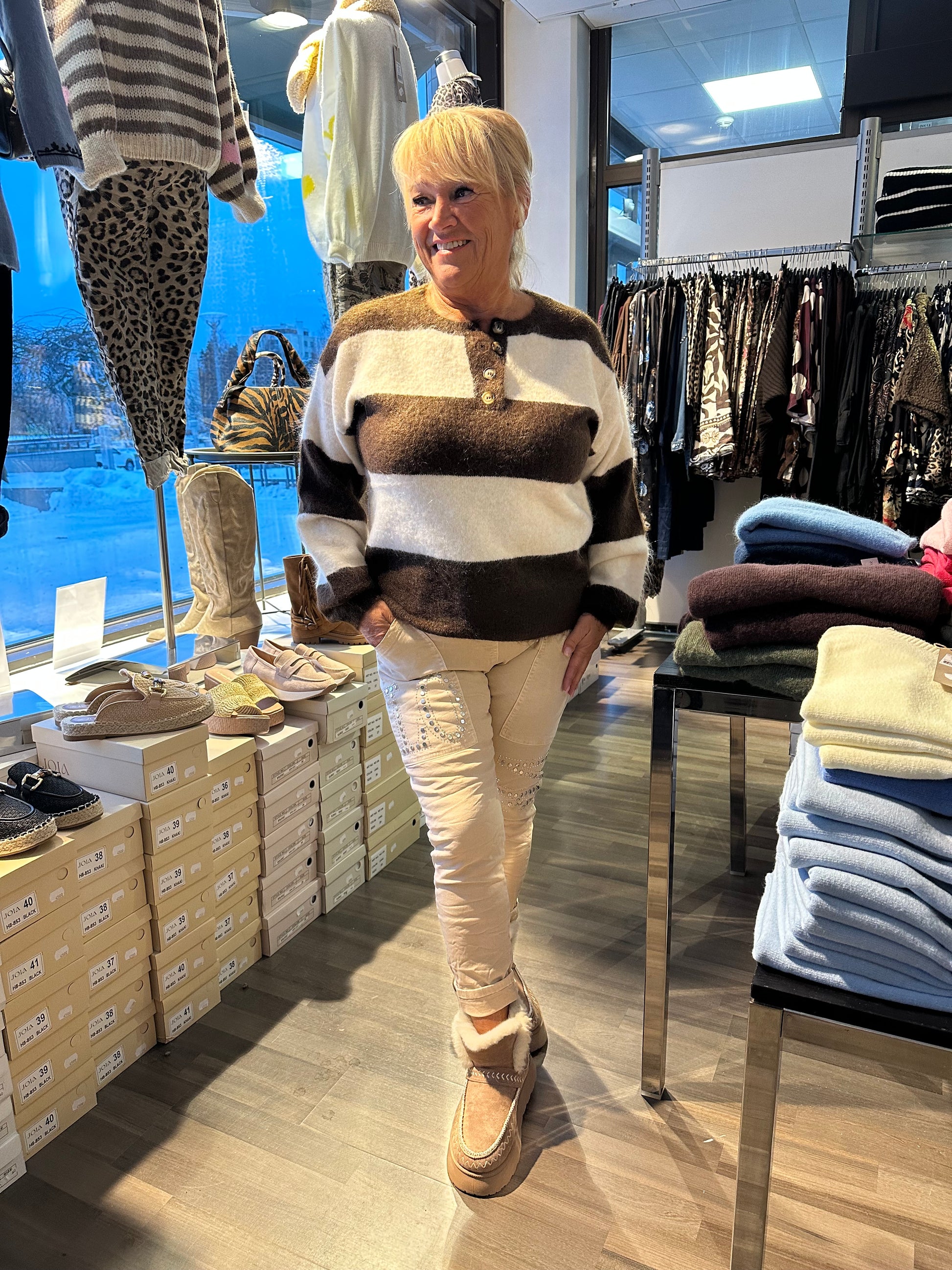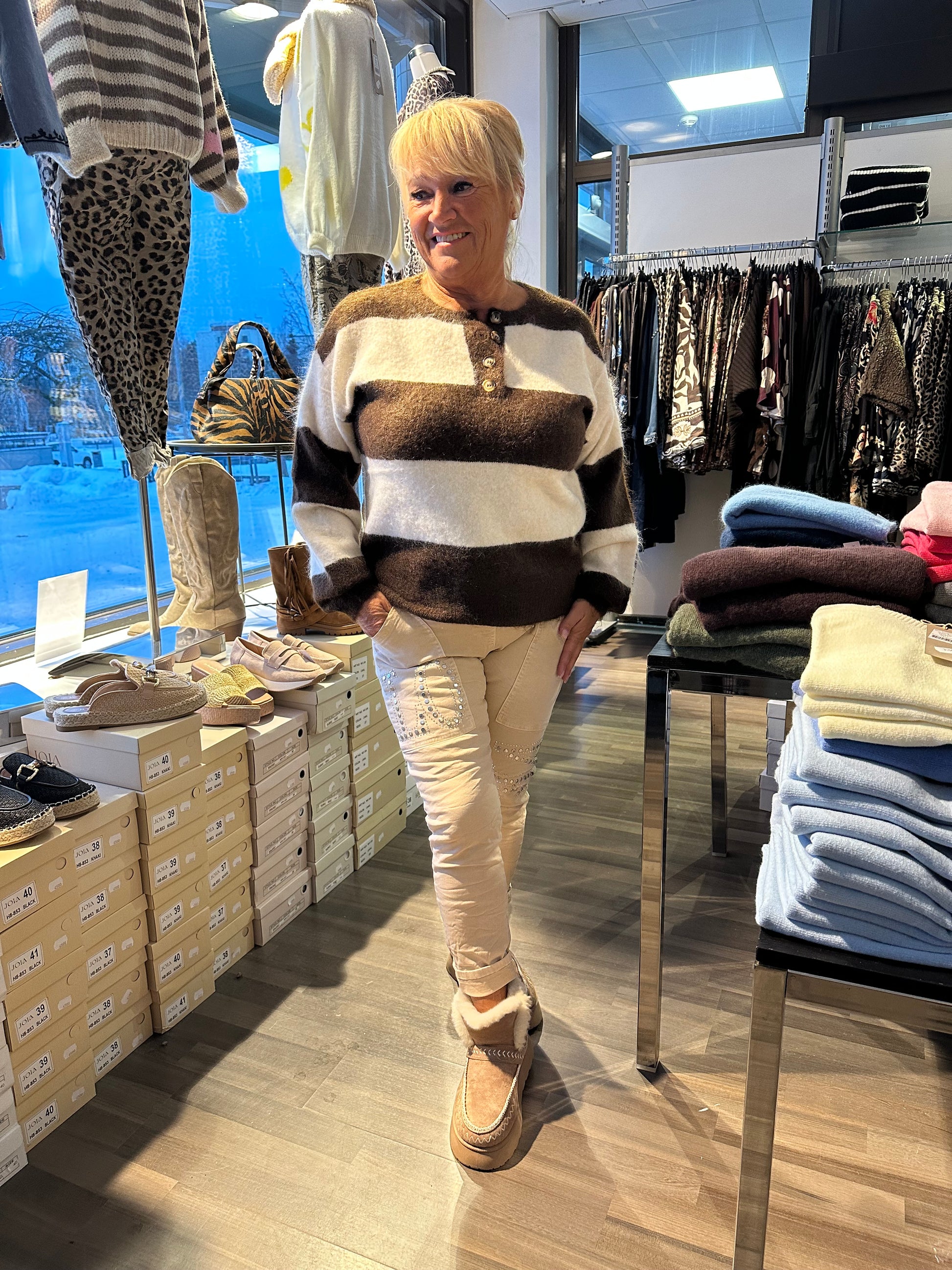 Ihana pehmeä neulepusero! Luonnonvalkoinen ja suklaanruskea raita. Pääntiellä muutama nappi.