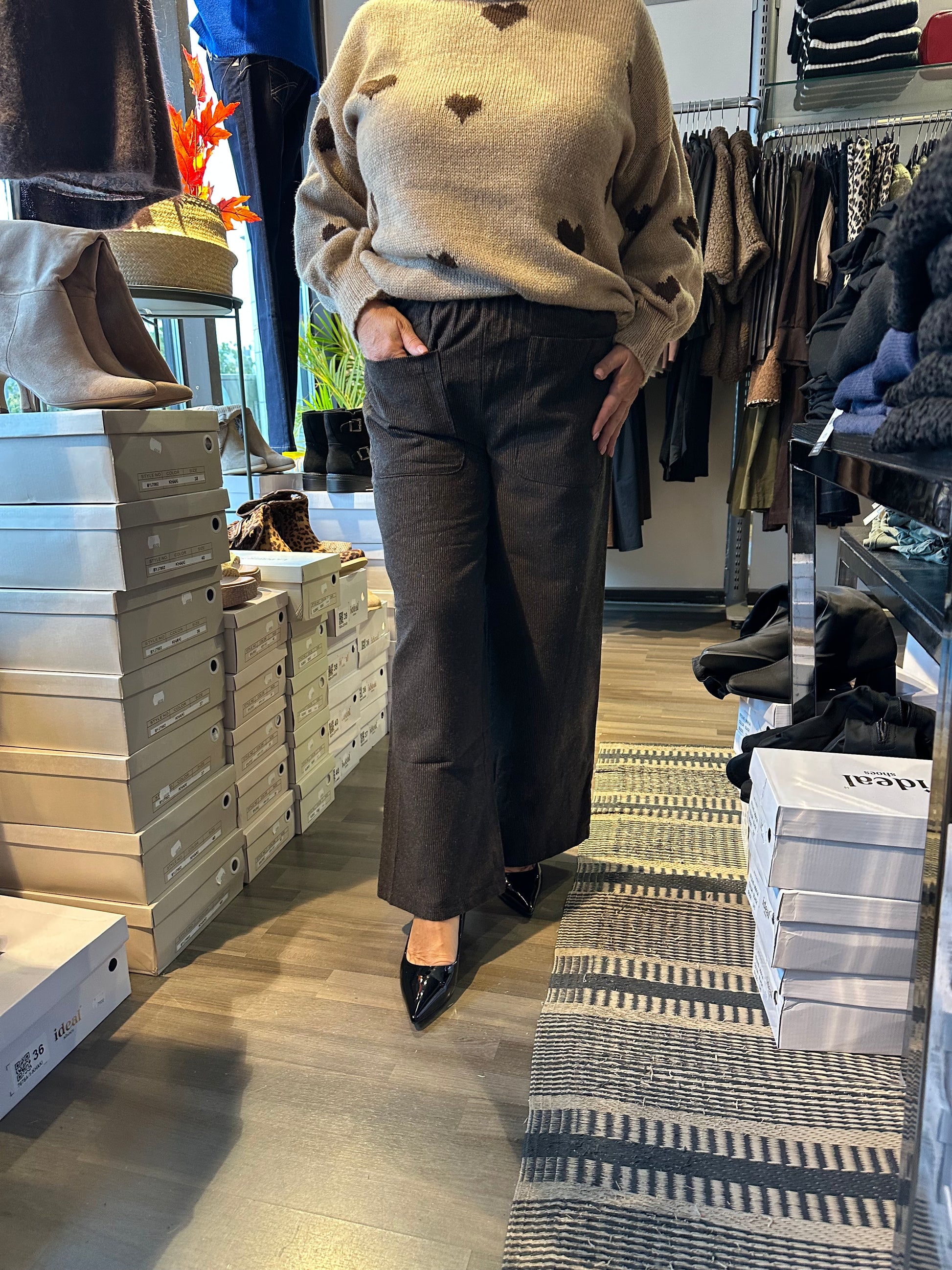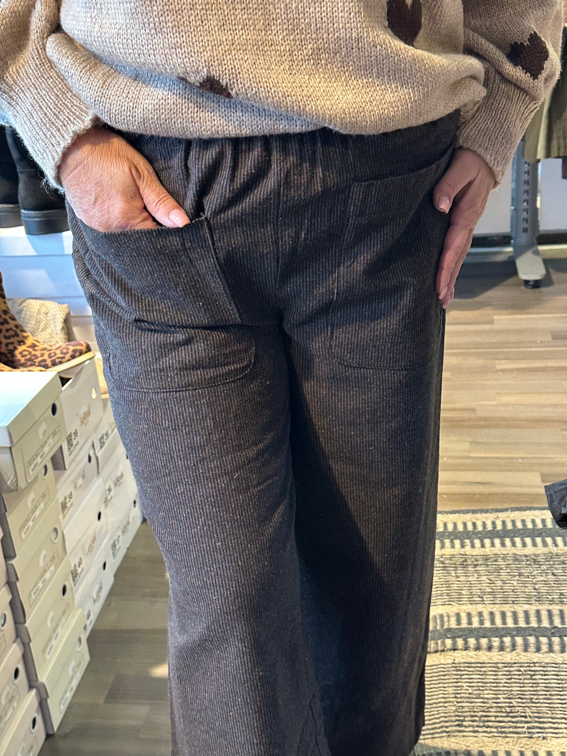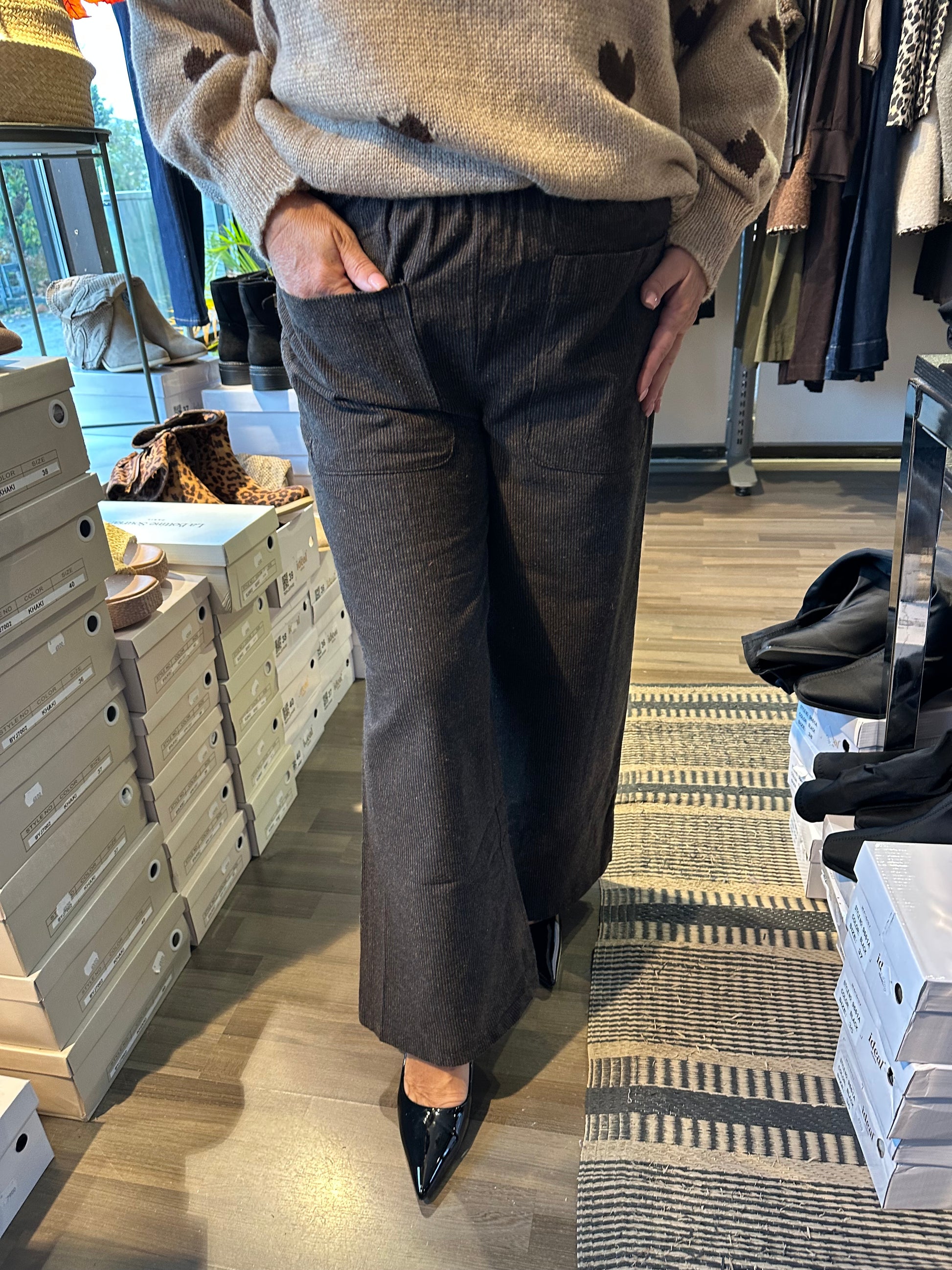 Leveälahkeiset ruskeat puuvillahousut hieman vajaamittaisella lahkeella. Korkea vyötärö, jossa joustava resori. Edessä pystytaskut.