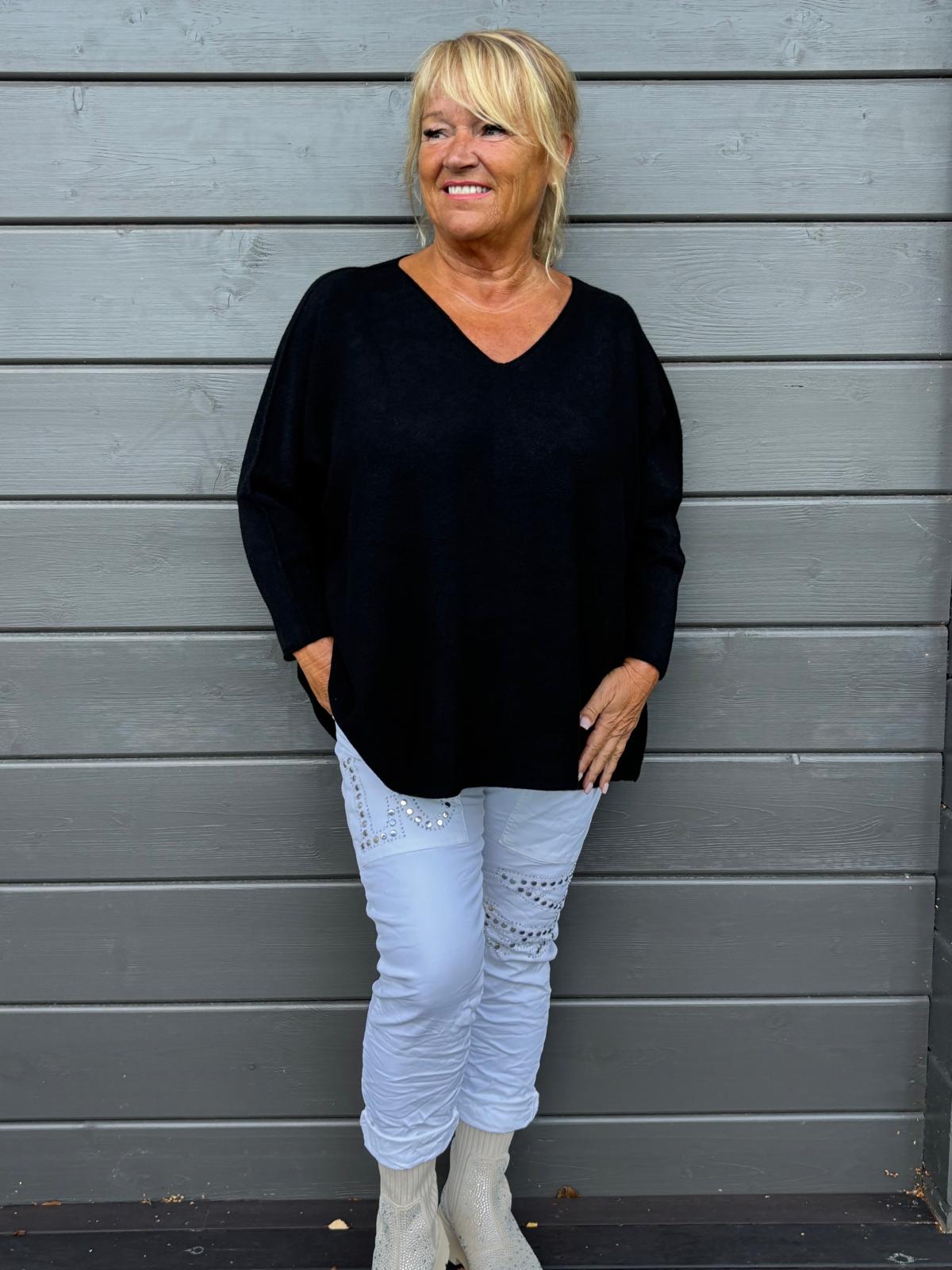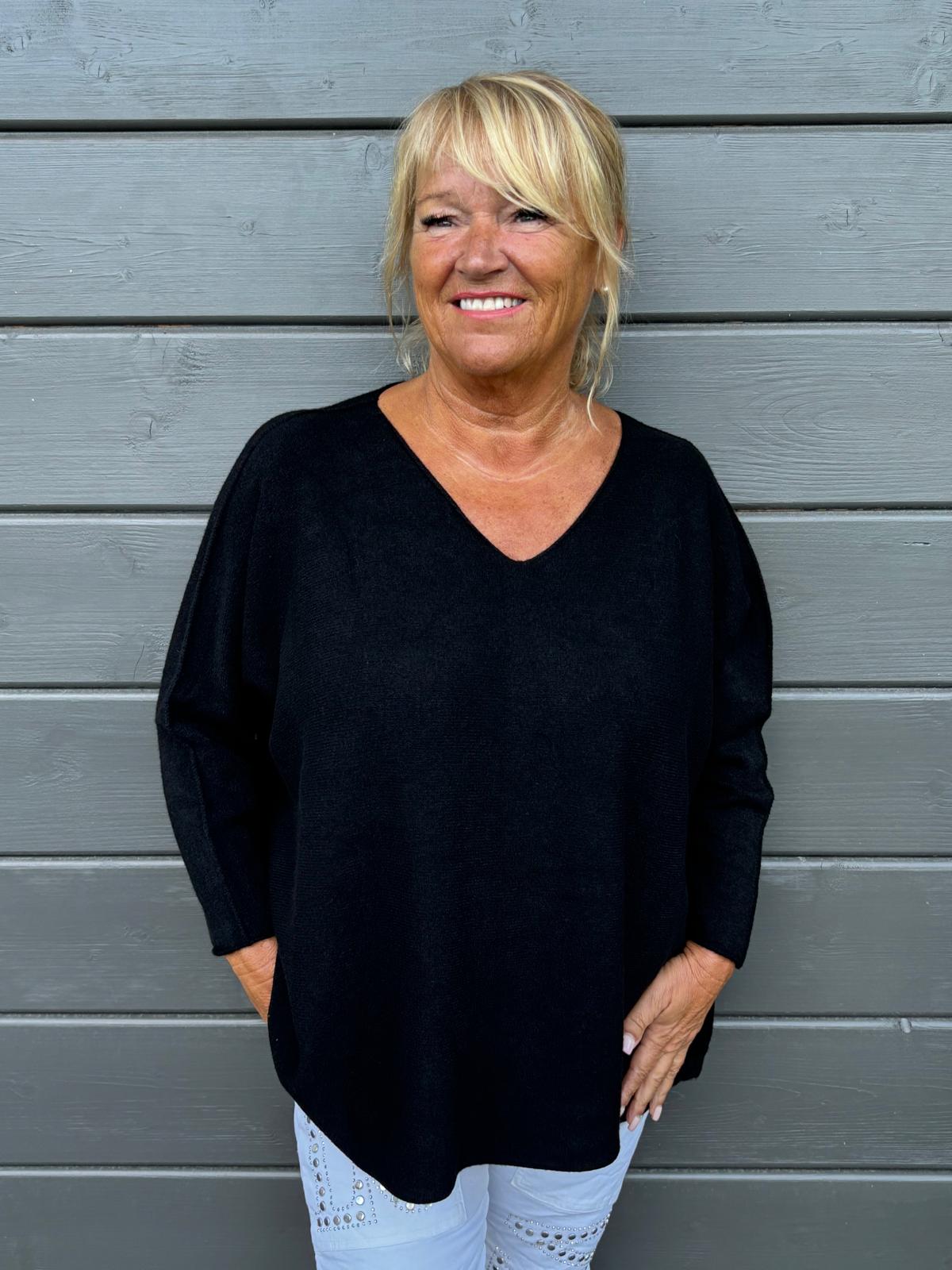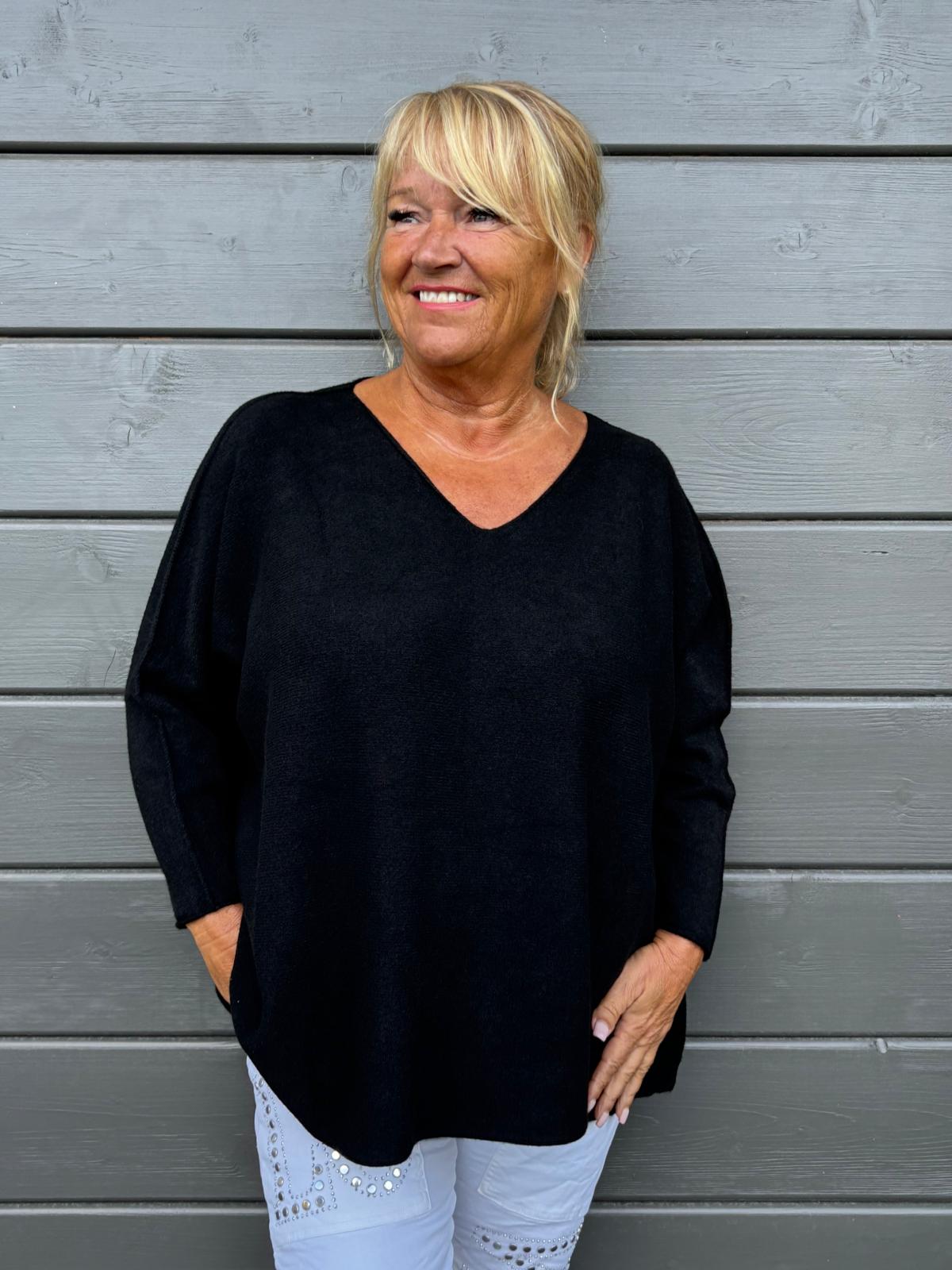 Tuttuun pehmeään ja mukavaan viskoosisekoite laatuun uusi reilumpi neule. V-,aukkoinen pääntie.