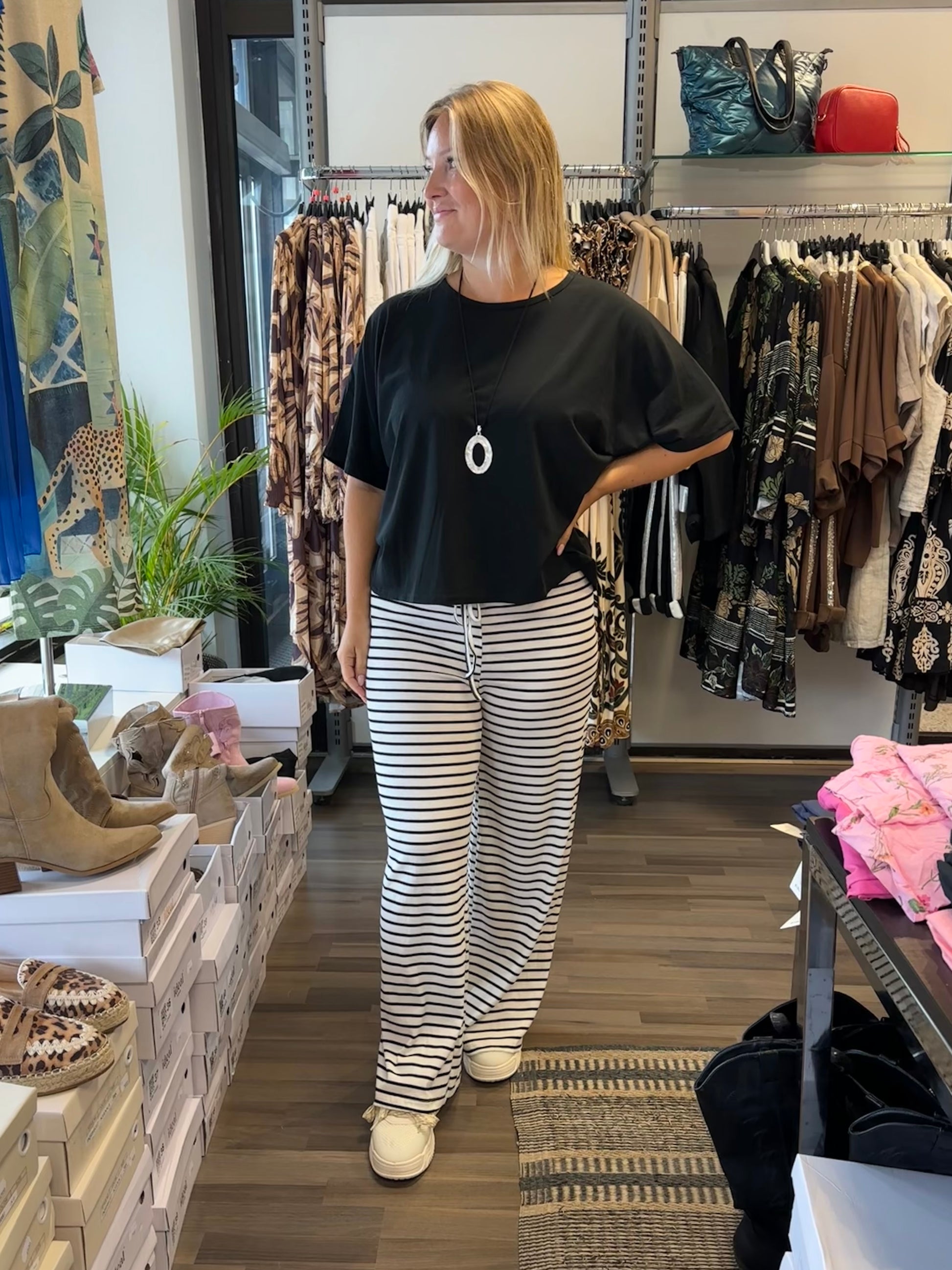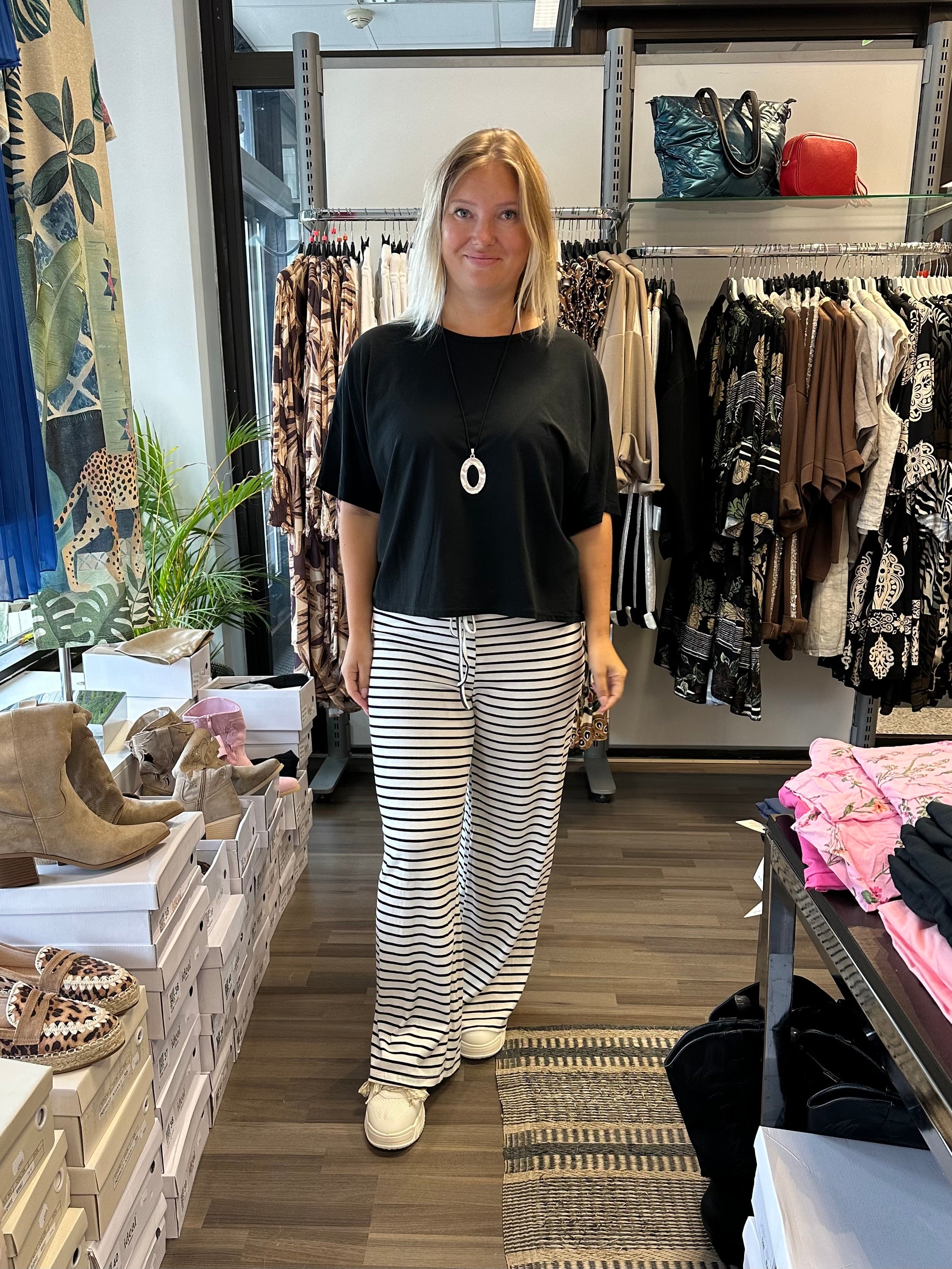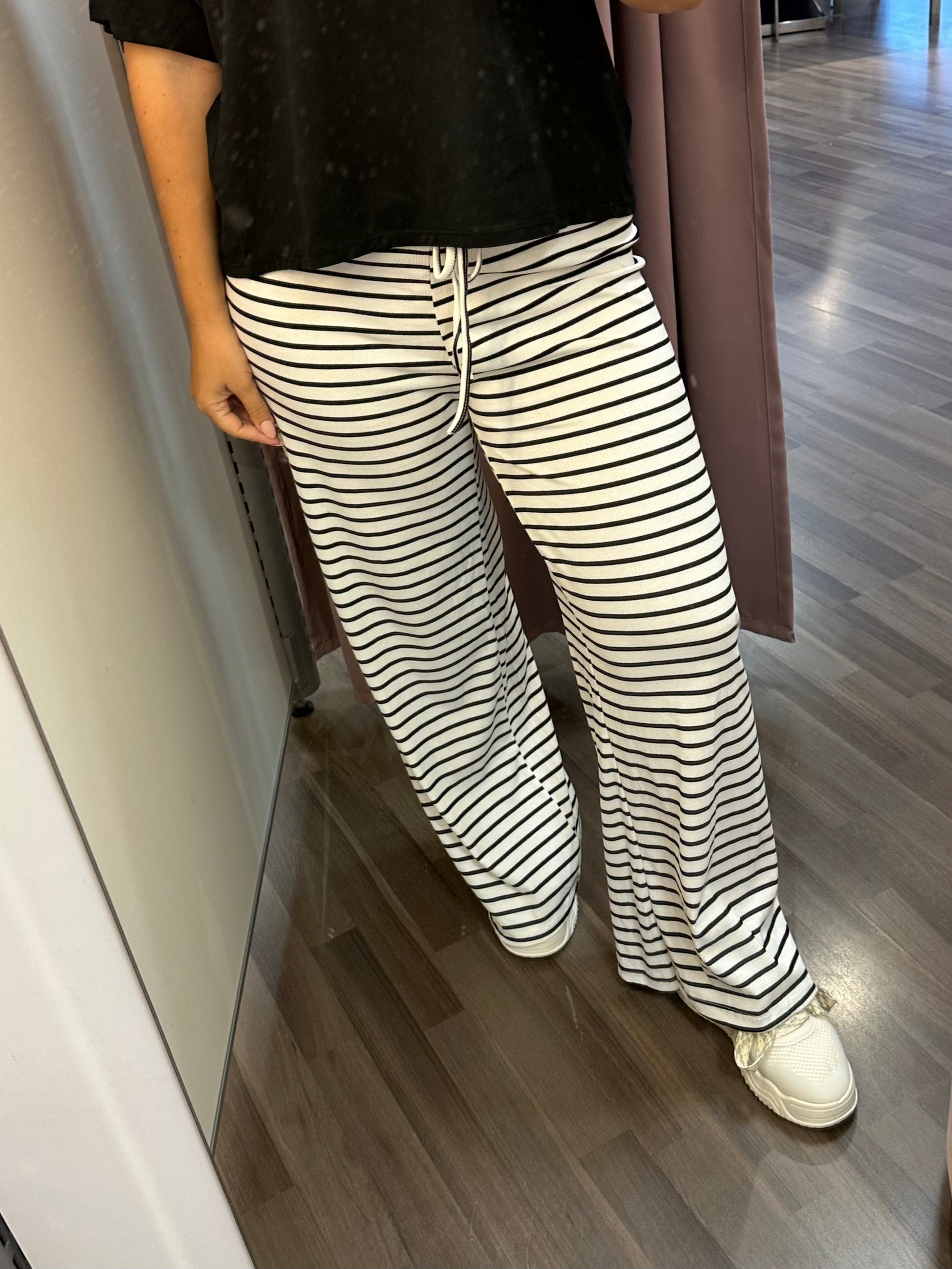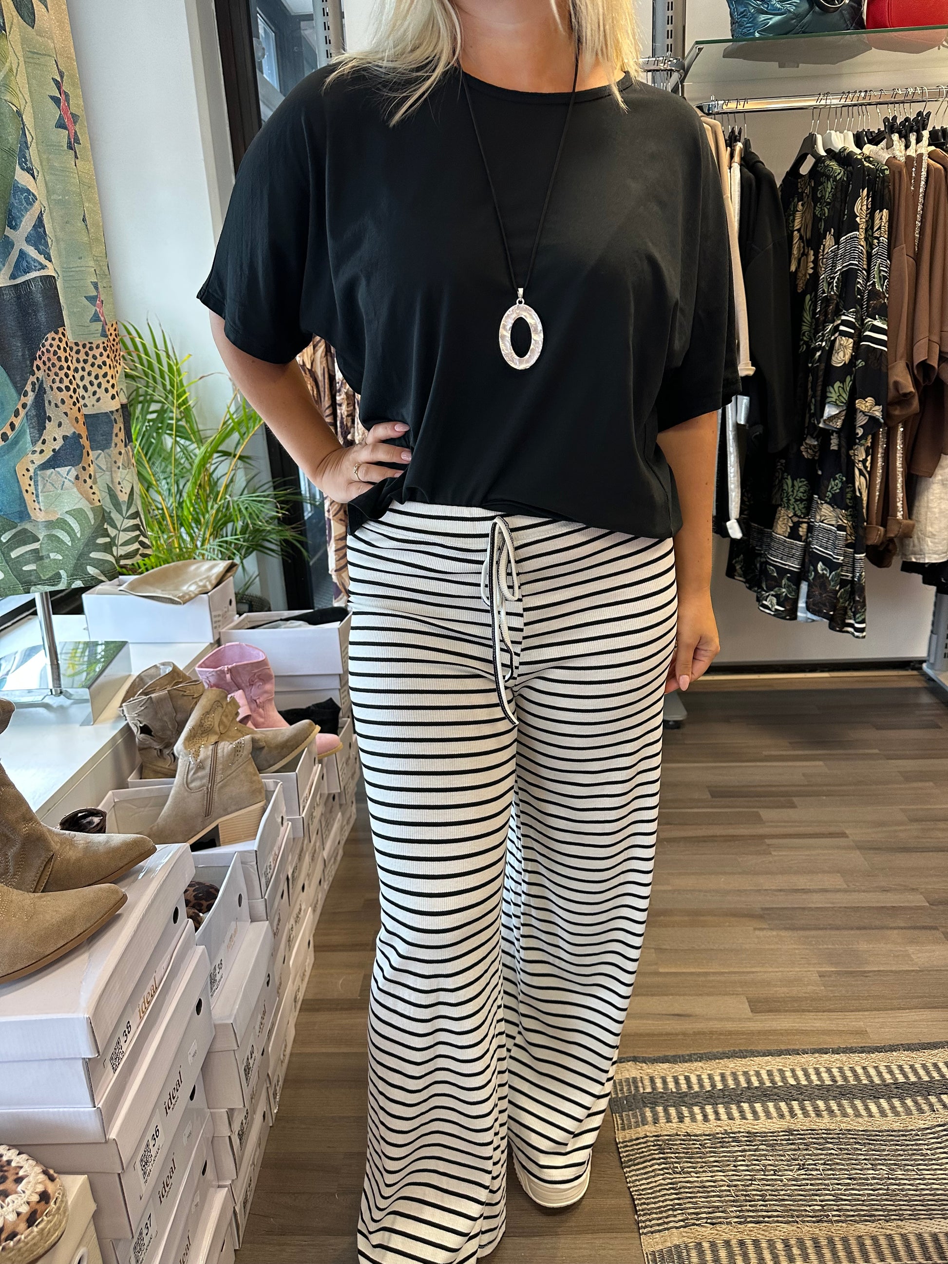Leveälahkeiset housut mukavan kevyttä ribbineulosta. Joustava vyötärö, jossa nyöri koristeena. Korkeavyötärö.
