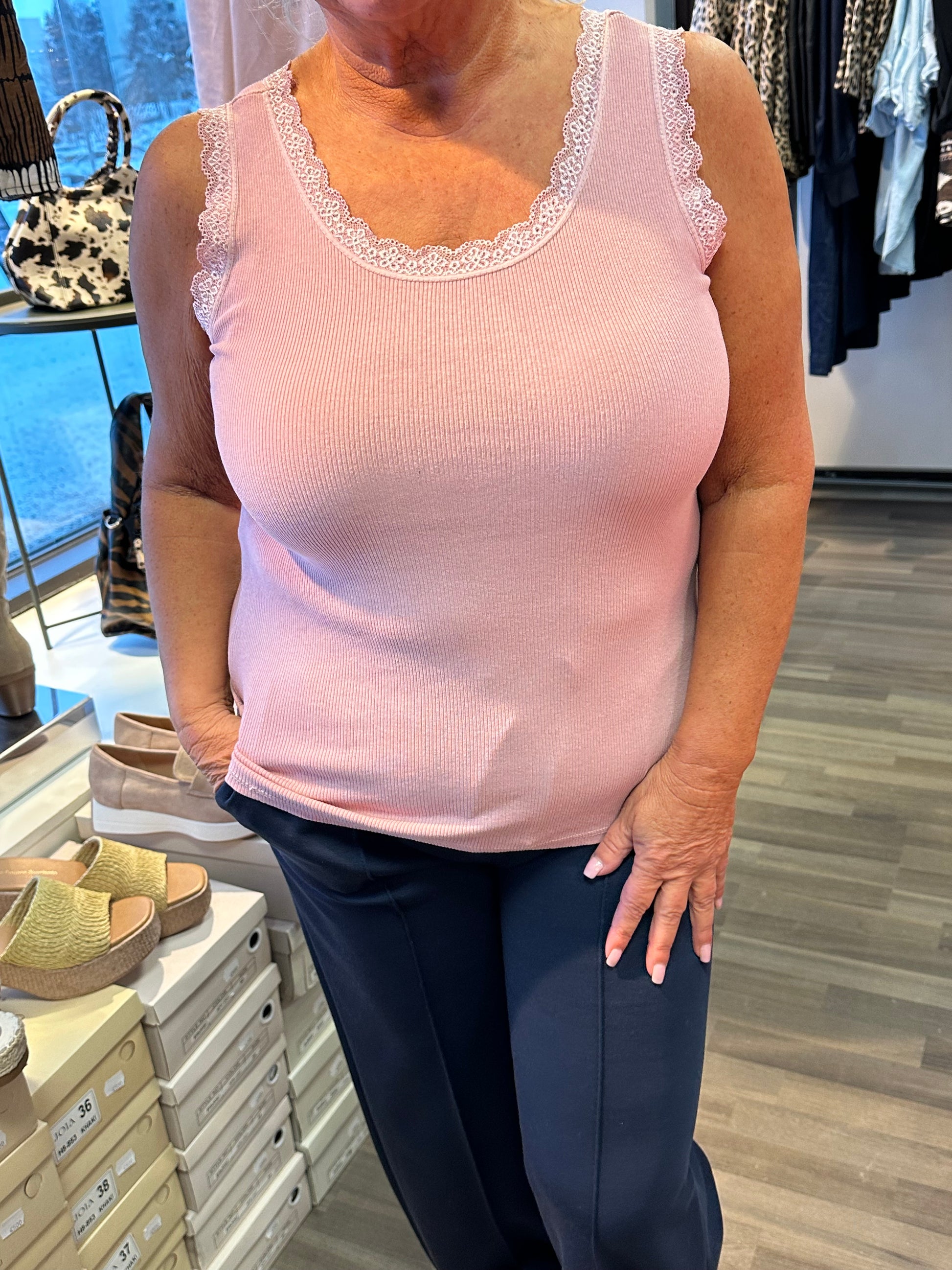 Ribbitoppi, joka ei mene ihan jokaista mutkaa myöden! Toimii siis alustoppina tai ihan itsekseen. Pitsisomisteet pääntiellä ja olkaimissa.