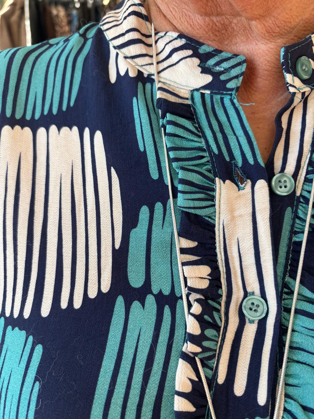 Pieni frillakoriste pääntiellä ja napit. Taskut sivuilla. Vyötäröllä rypytys, joka antaa tilaa mekon alaosaan. Pitkät hihat, joissa kumpparit.