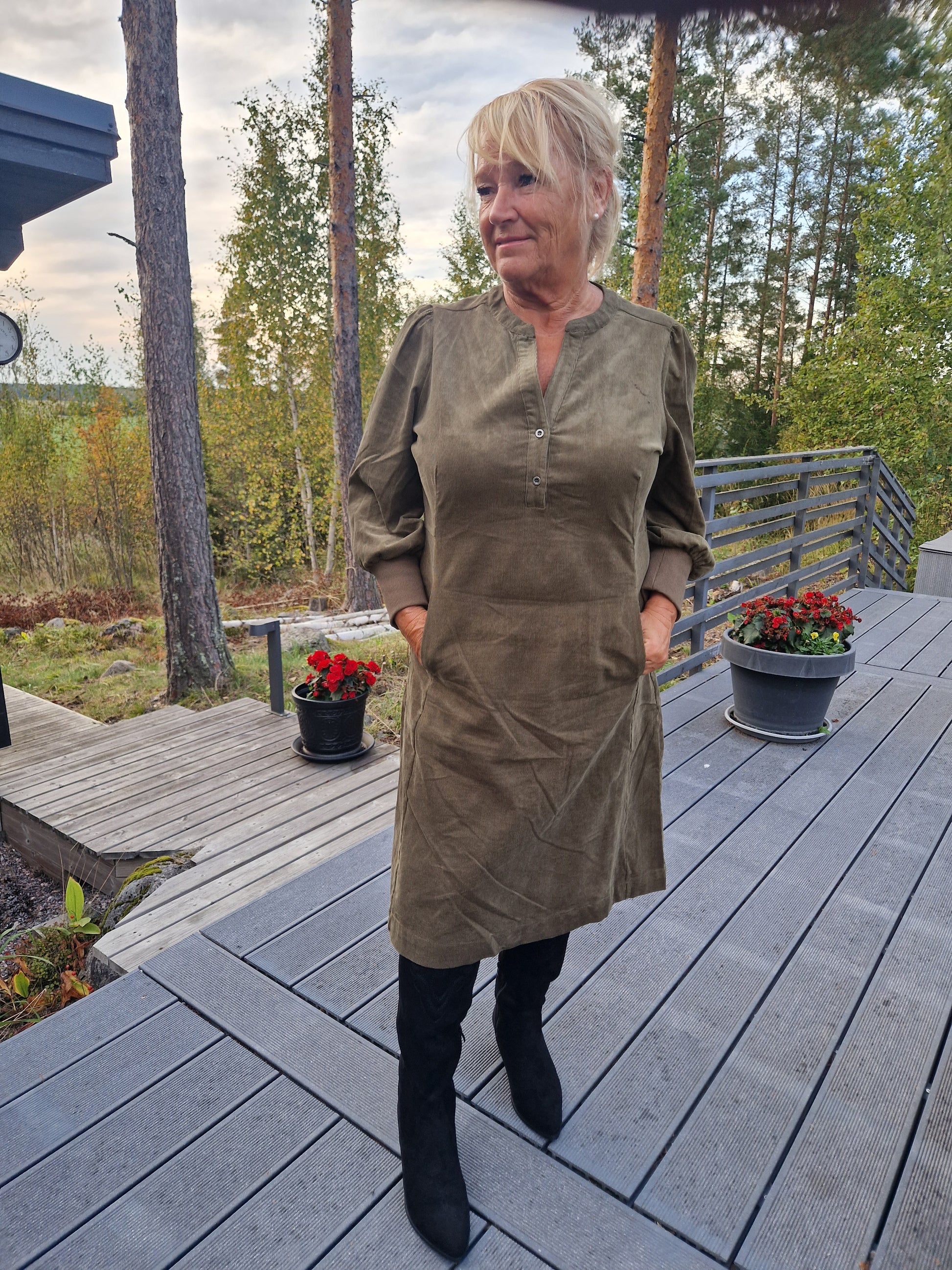 100% puuvillaa. Samettimekko, jossa pääntiellä 2 nappia, hihoissa pitkät resorit, vähän vajaamittainen hiha. Istuva leikkaus rinnan kohdalla, taskut edessä. Helma vähän leventyy vyötäröllä. Kankaassa ei joustoa, mutta hyvä leikkaus antaa liikkumatilaa helmaan. Culturen mallistosta, eli minulla aina L koko. Mitoitukset vastaavat hyvin heidän mallistossaan.