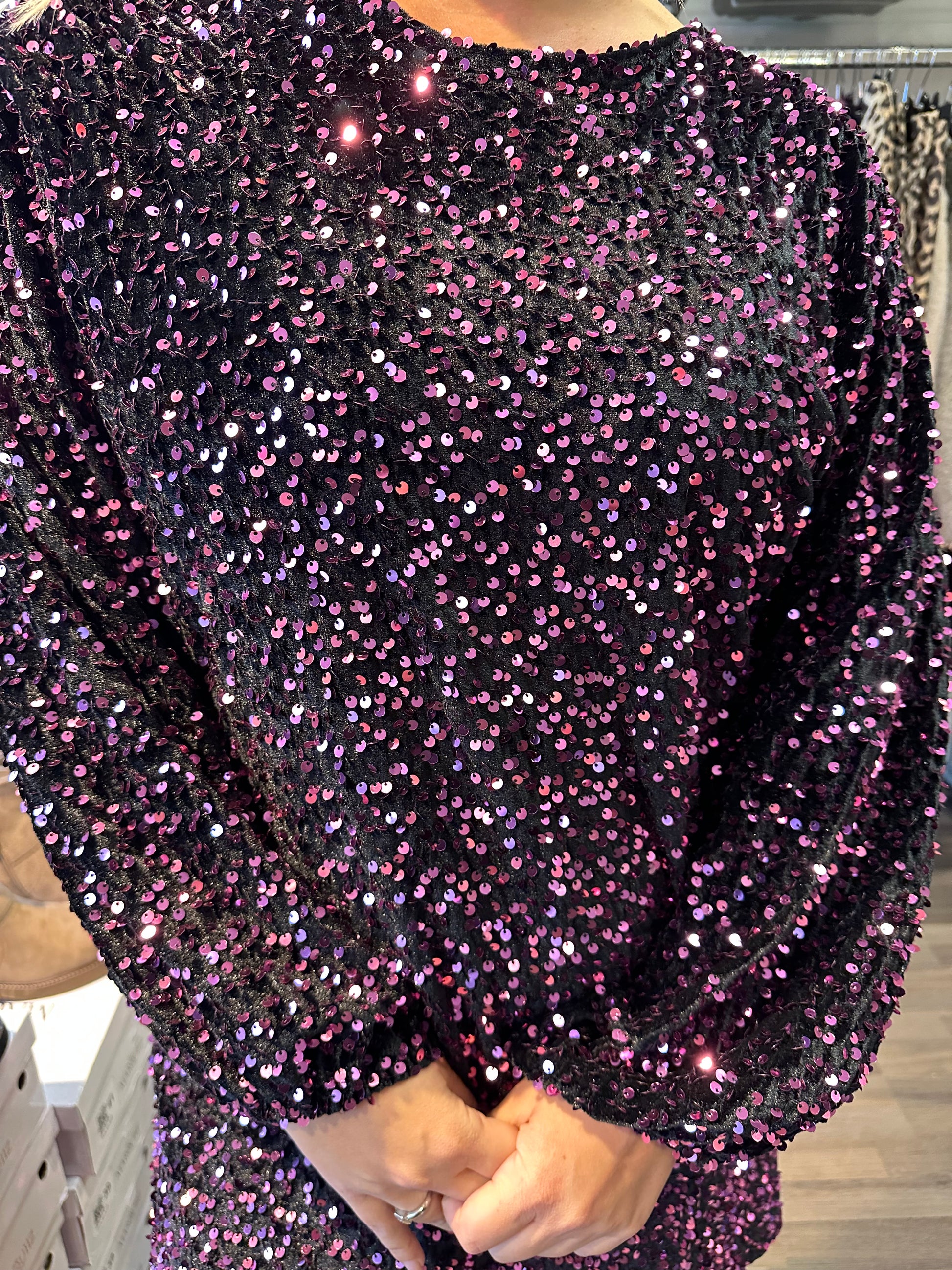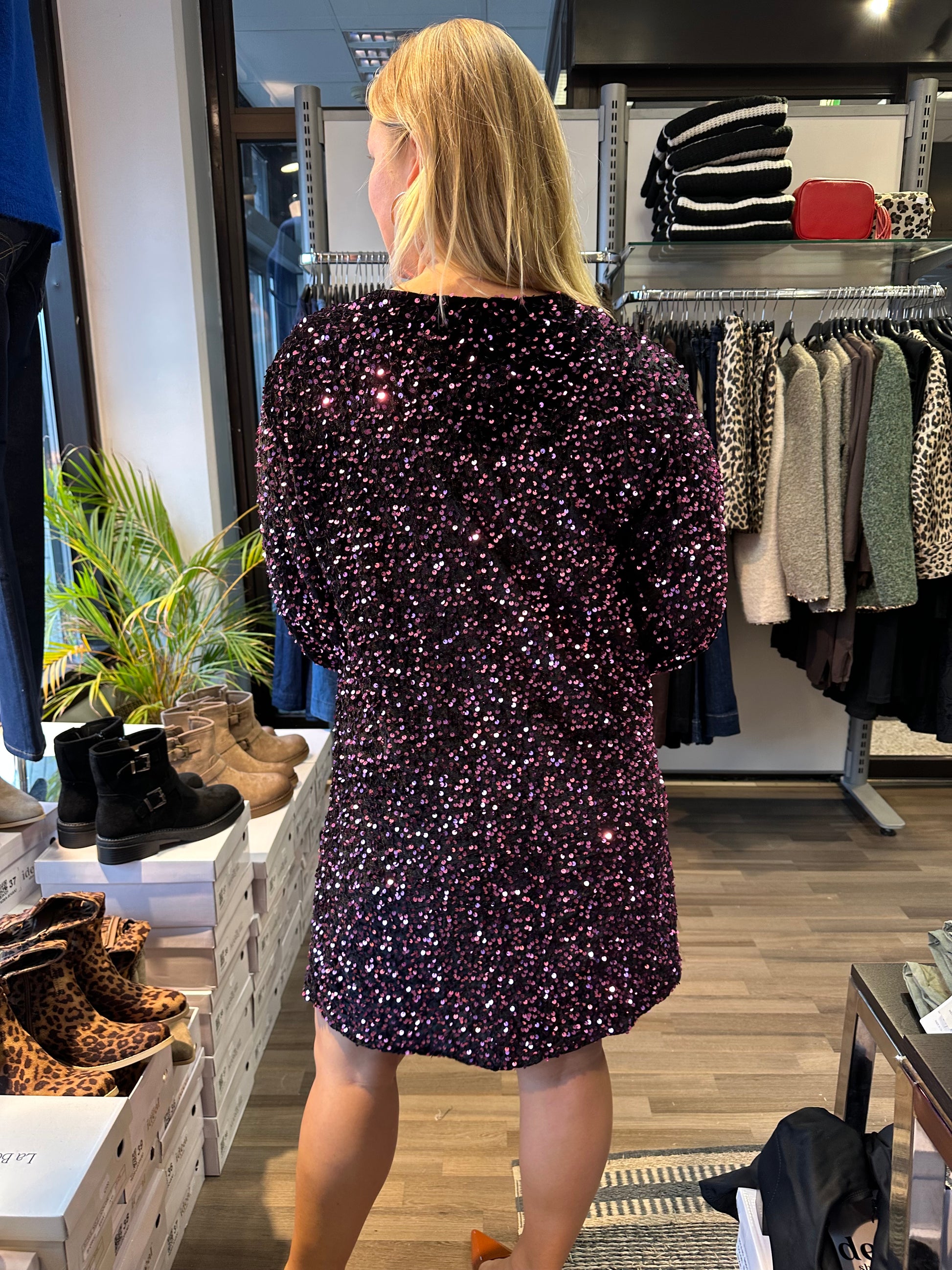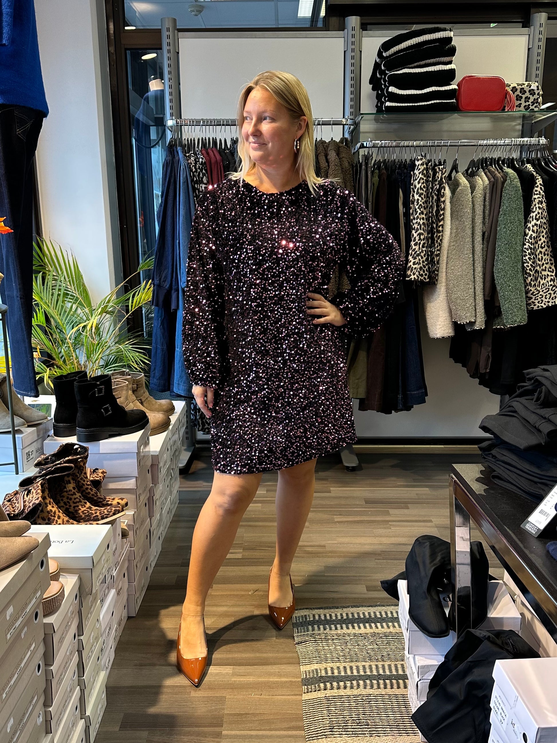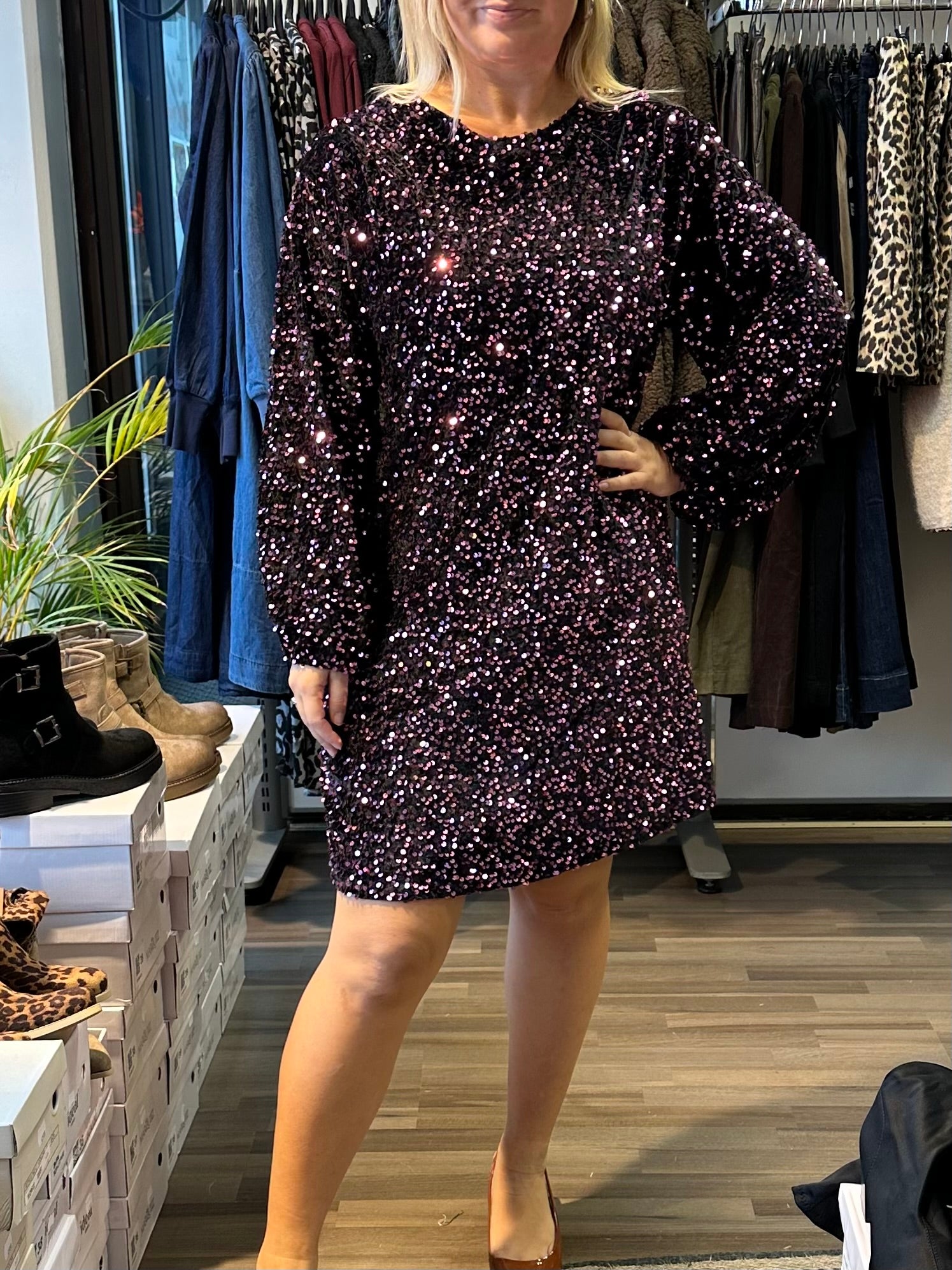 Ihana paljettimekko mukavaa samettia. Pitkät hihat ja hihansuissa kuminauha. Pyöreä pääntie. Alla vuori, joten paljetit ei kutita.