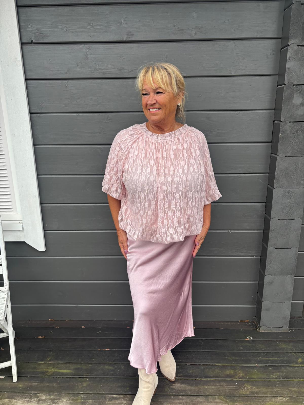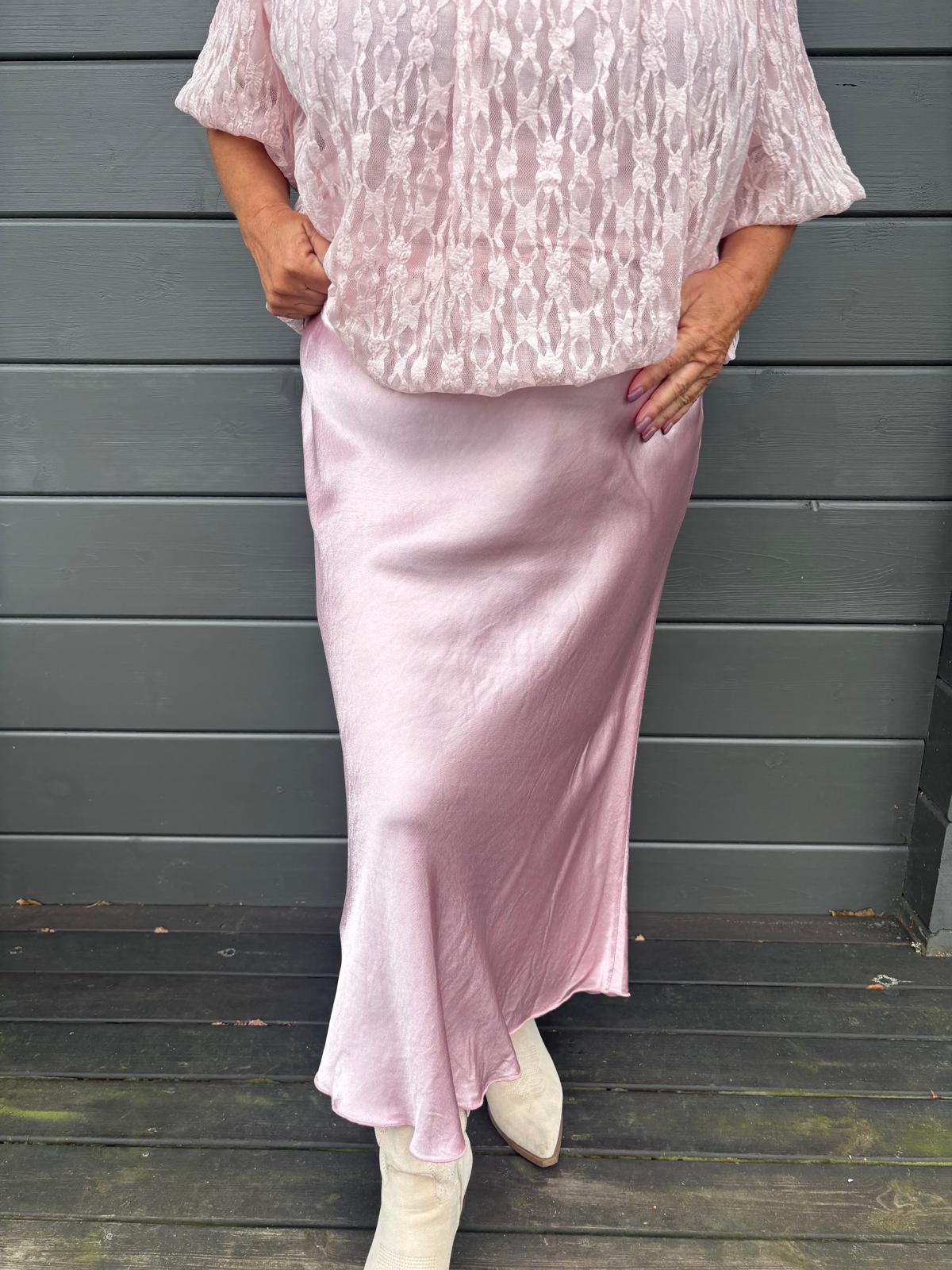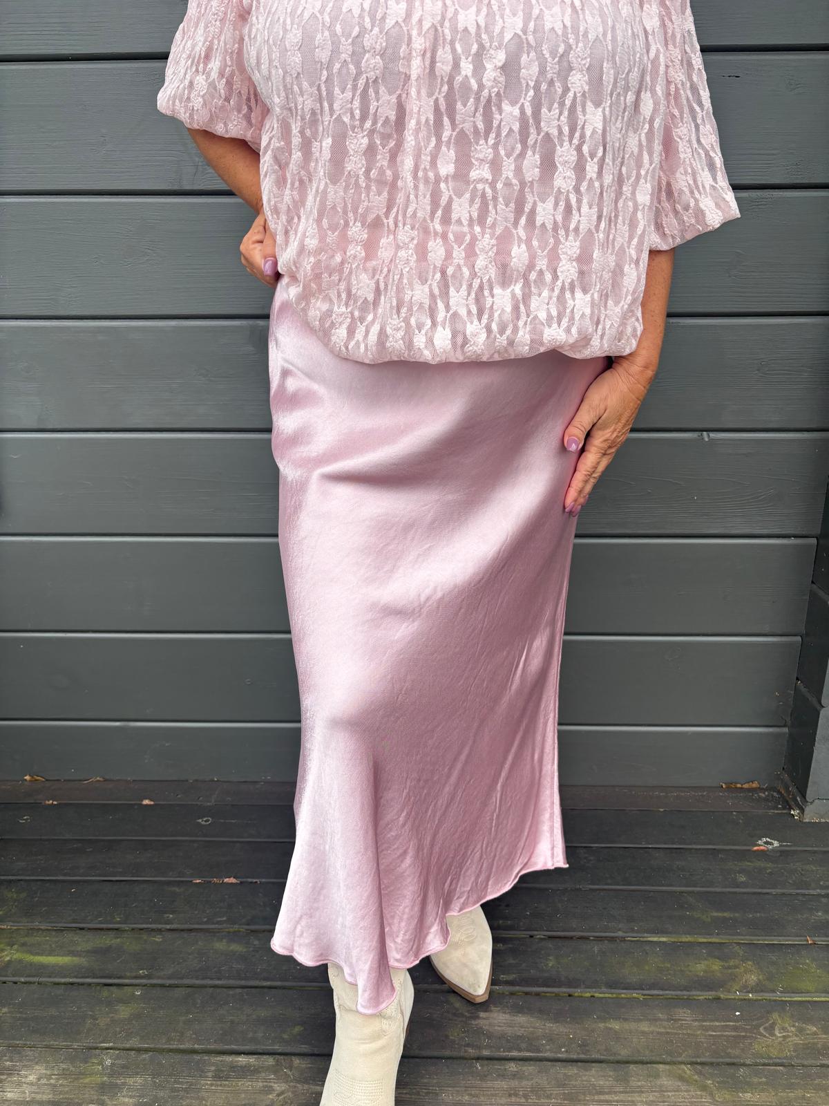 Midimittainen satiinihame, jossa joustava vyötärö.