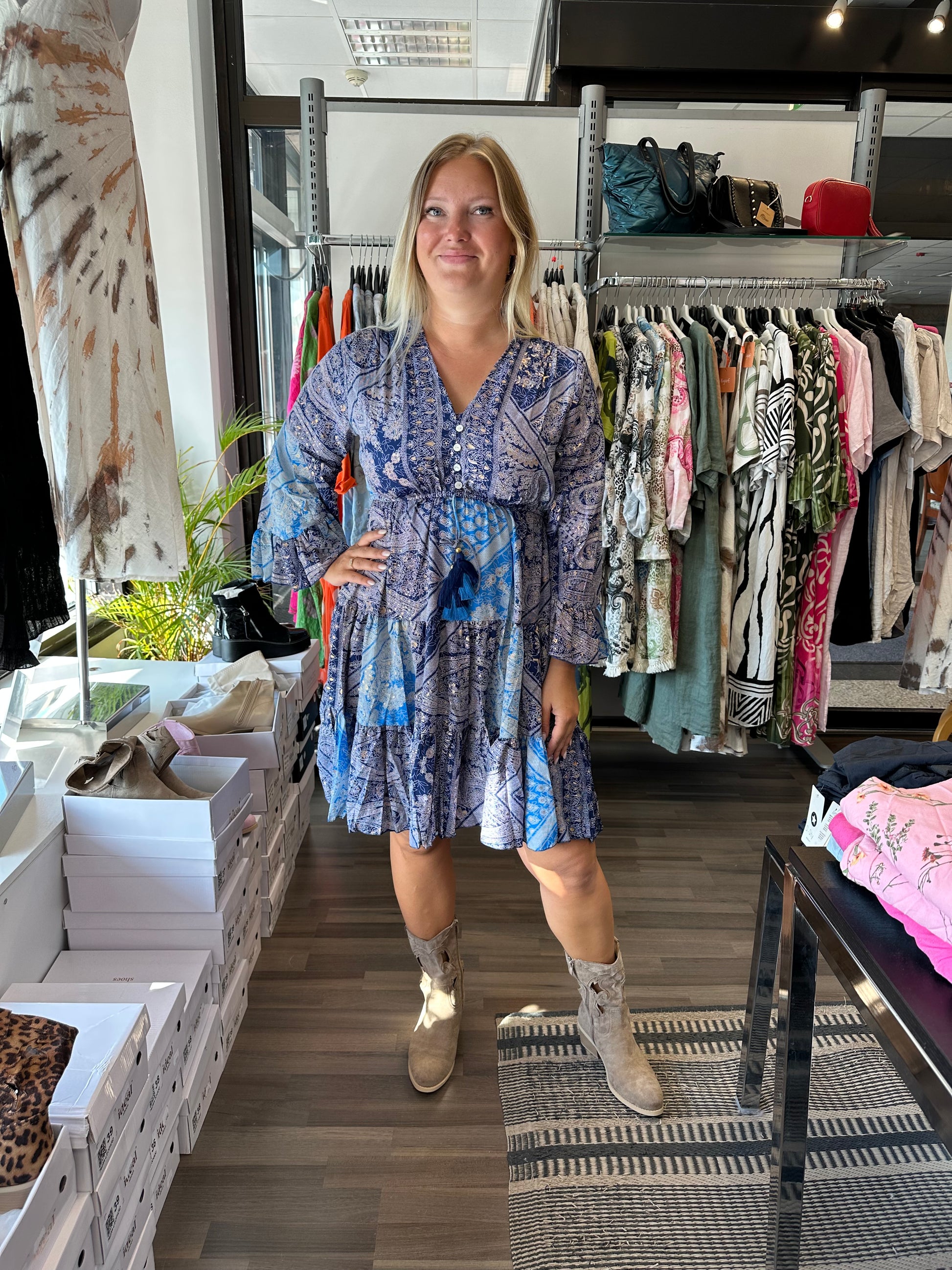 Kaunis polvipituinen mekko, jossa leveät frillahihat. V-pääntie ja napit edessä. Vyötäröllä joustava kuminauha. A-linjainen helma poikkilaskoksilla.