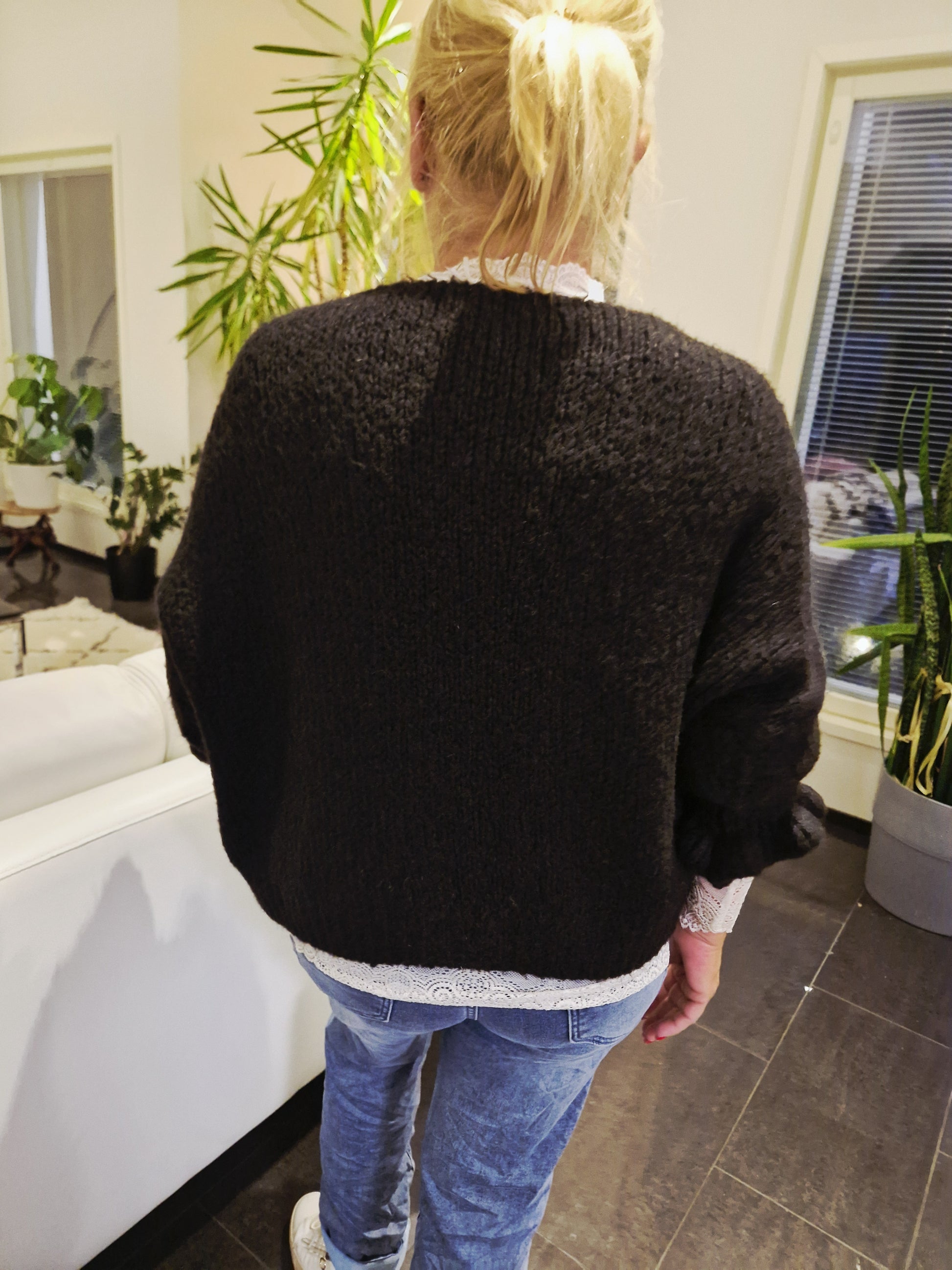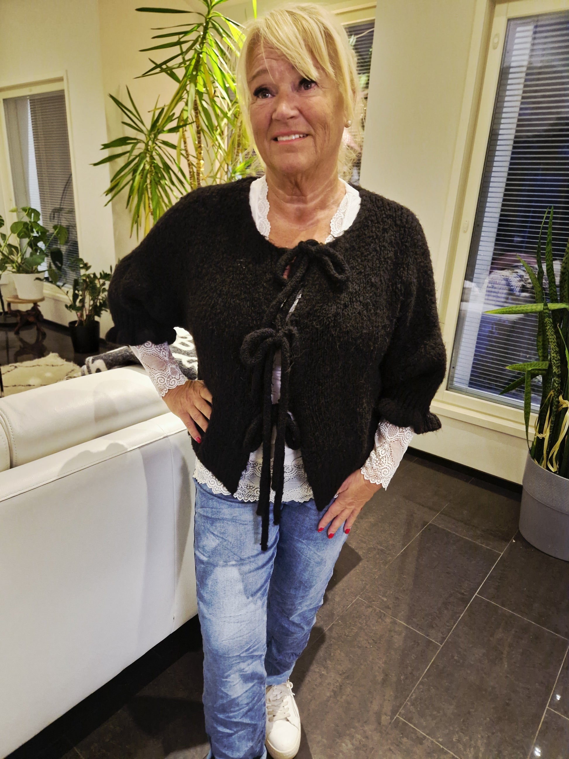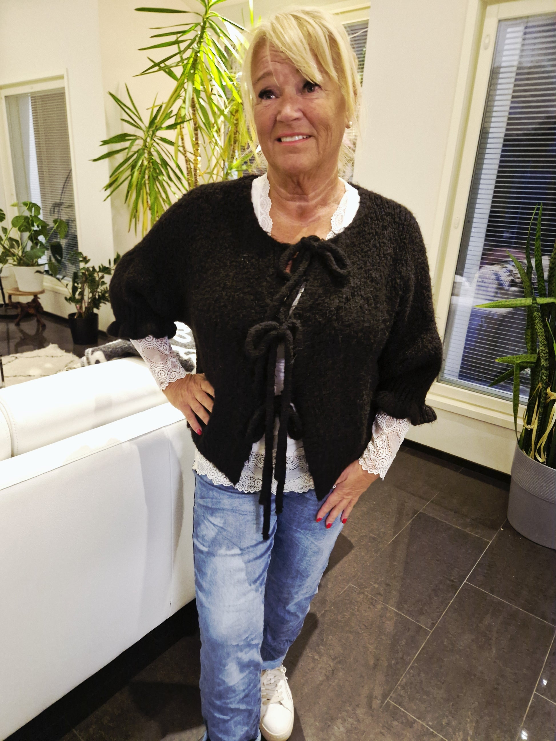 Pehmeää neuletta kivat solmut. Solmut voi myös avata mutta kiva näin kiinni
