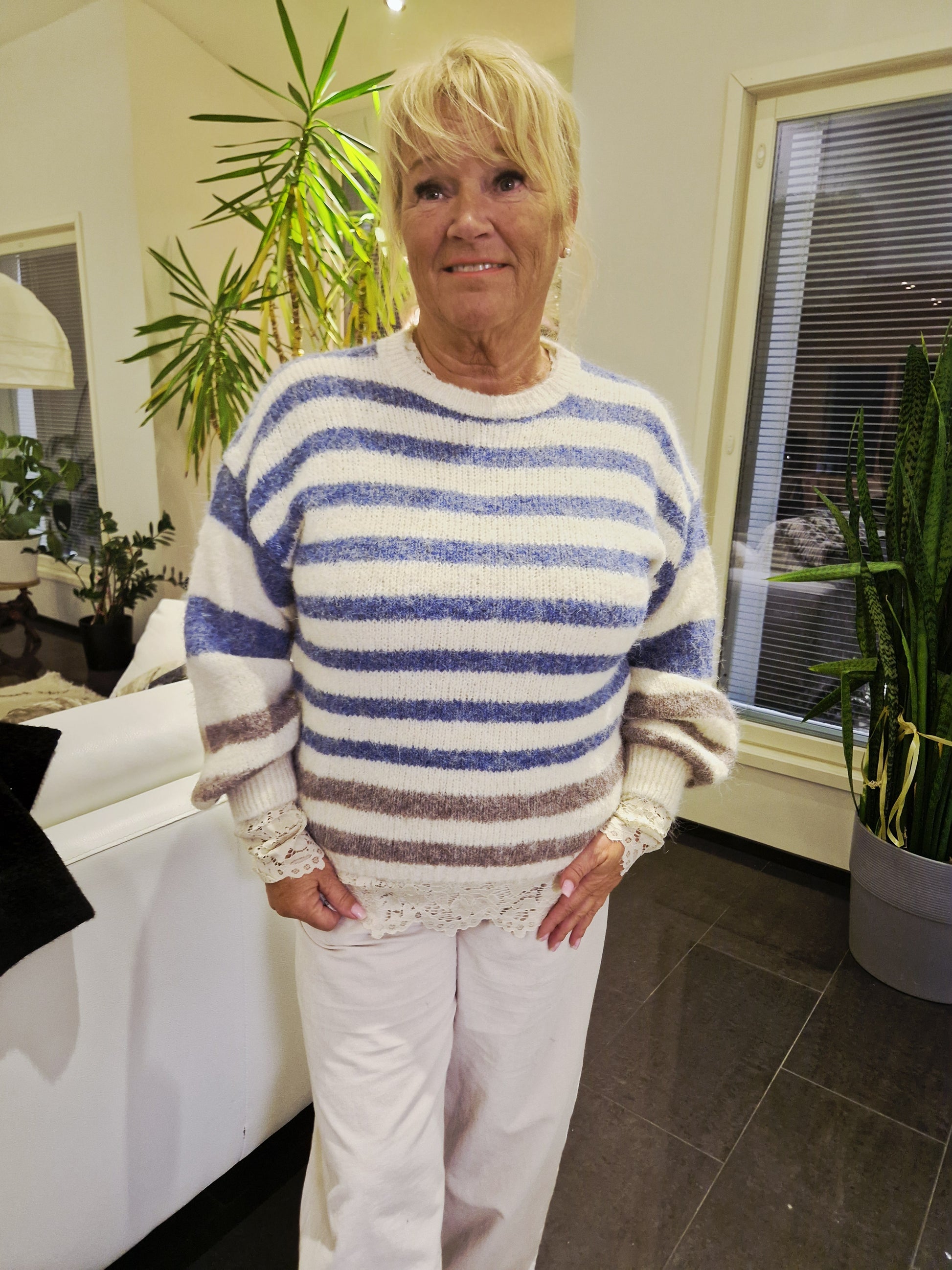 Ihanan pehmeä neule, utuinen sininen ja vaalea raita. Ripaus beigeä helmassa ja hihoissa. Leveä hihansuu on kiva.