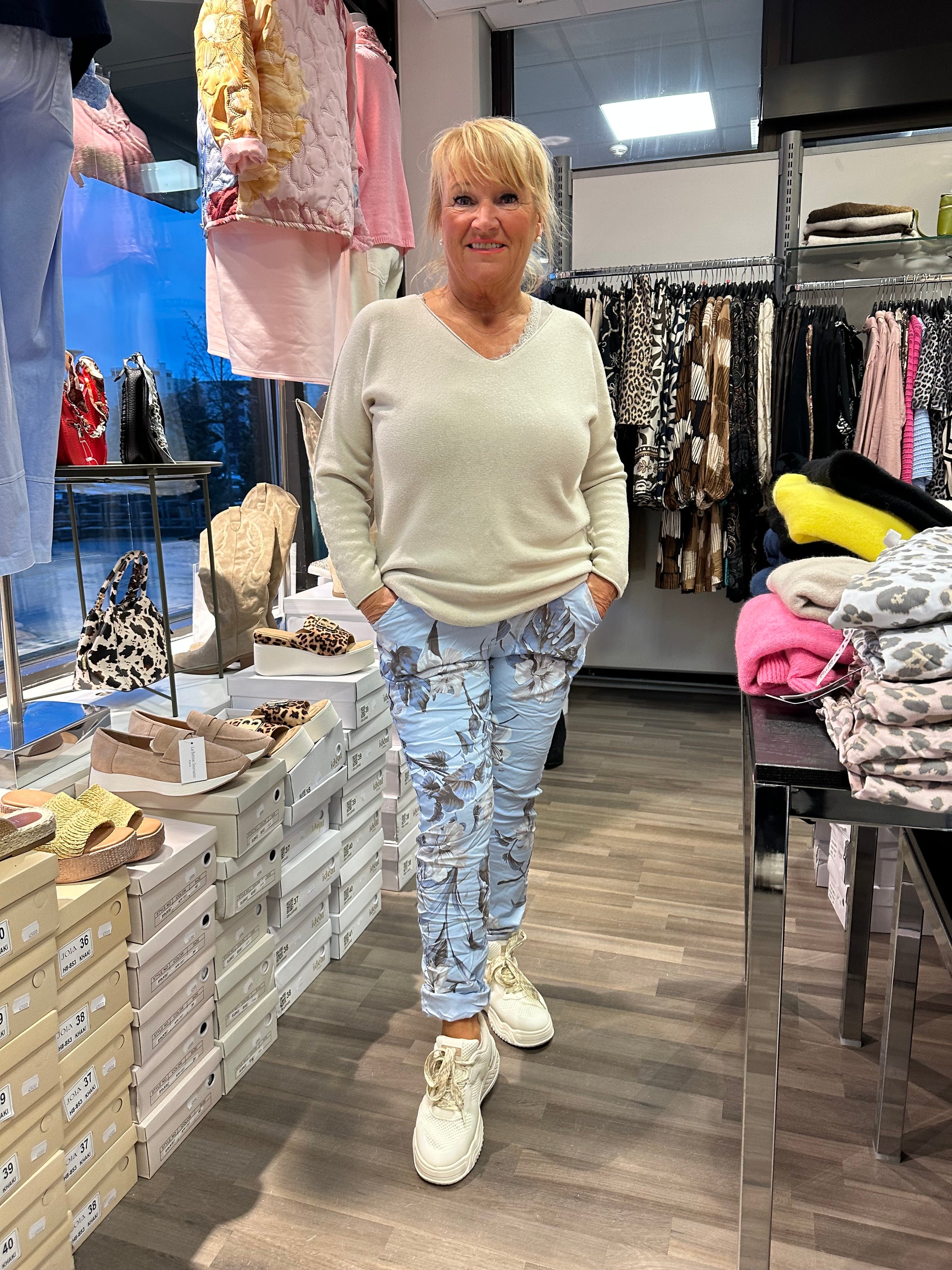 Joustavat, kevyet viskoosihousut. Joustava vyötärö, jossa nyöri. Edessä ja takana taskut.