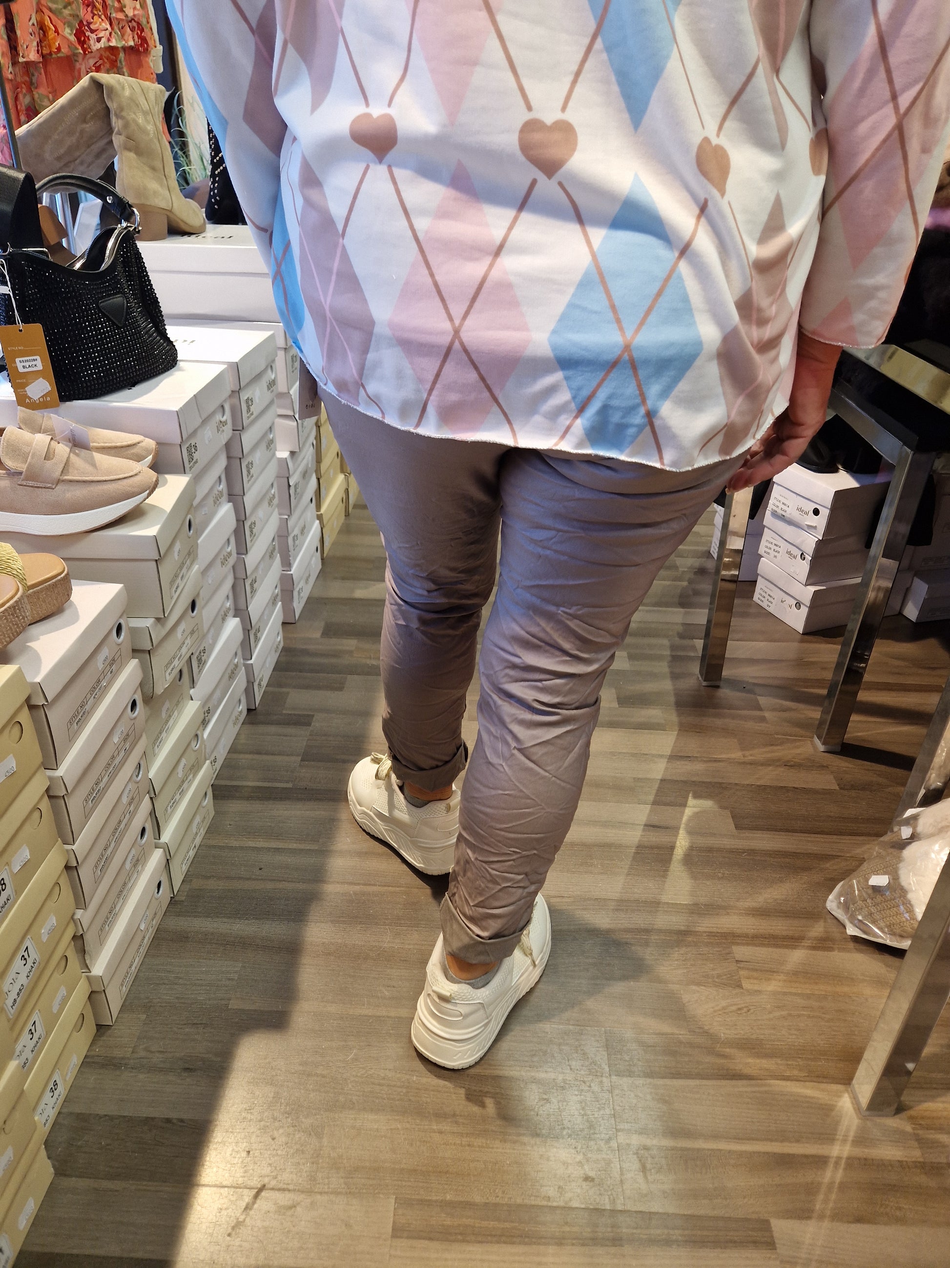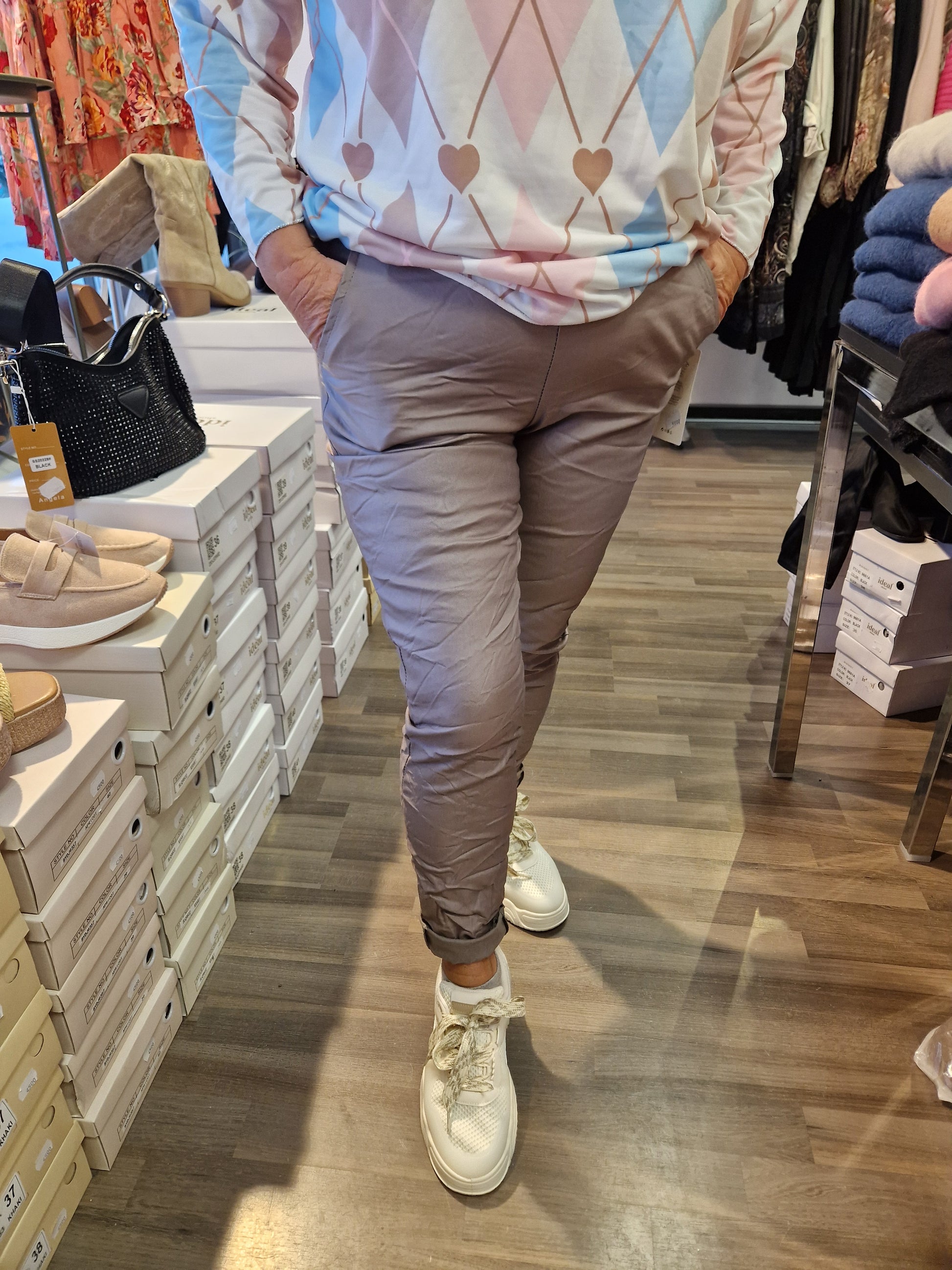 Korkeavyötäröiset housut joustavasta kankaasta. Vyötäröllä nyöri ja sivuilla taskut.