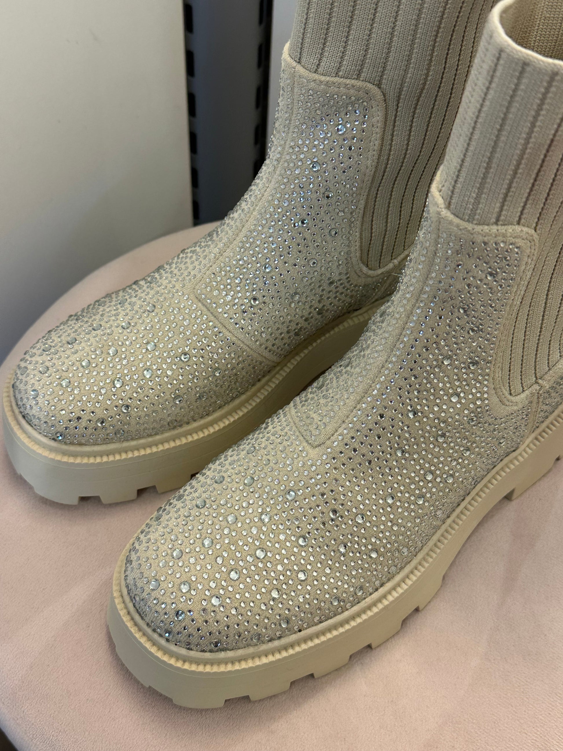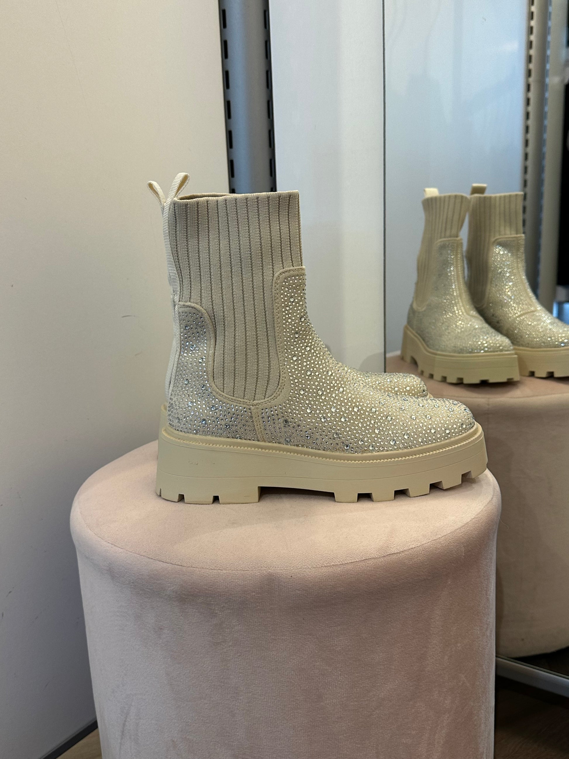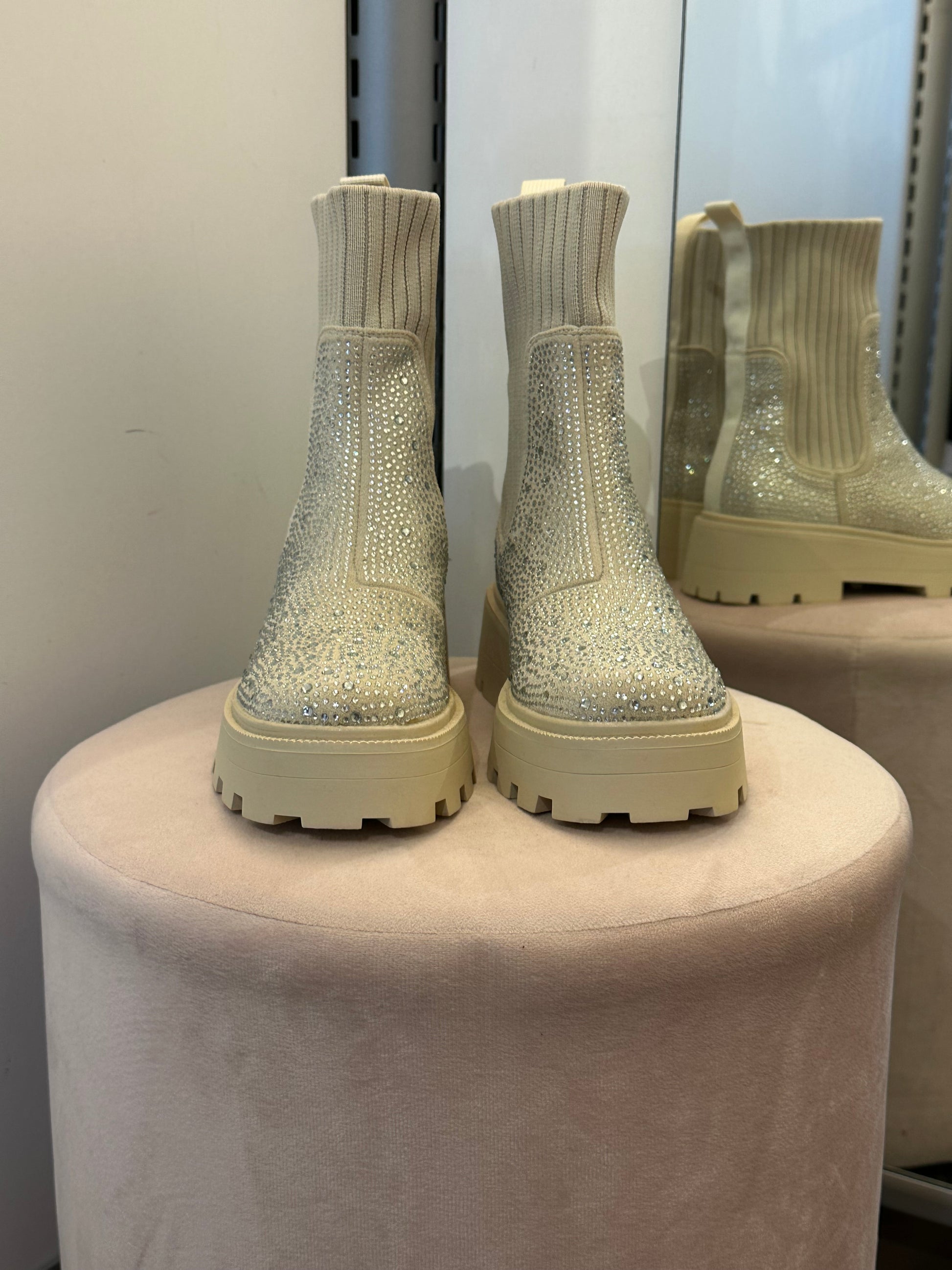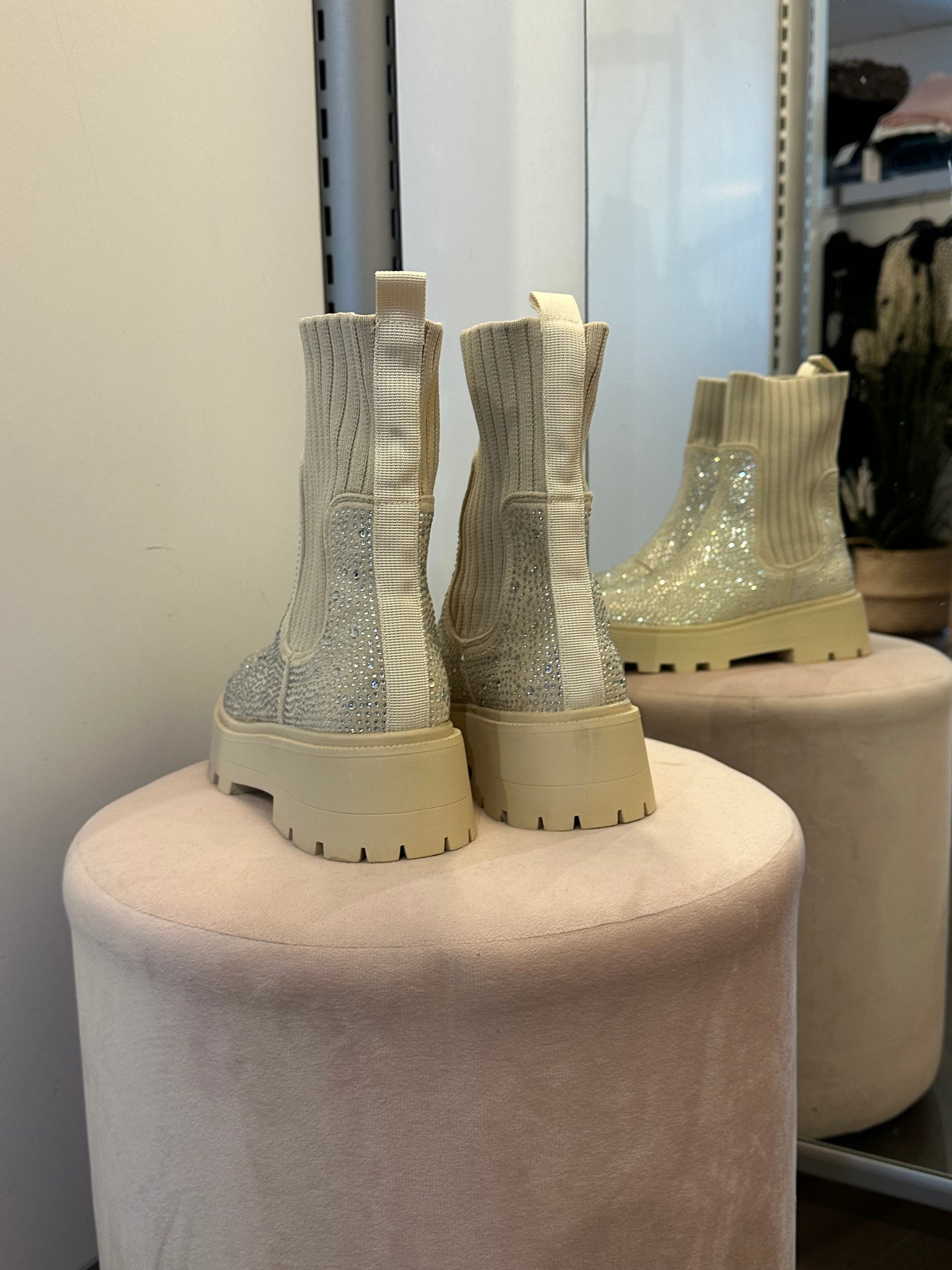 Makeet vaaleat nilkkurit joustavalla sukkavarrella ja blingillä. Vastaa normaalia kokoa.