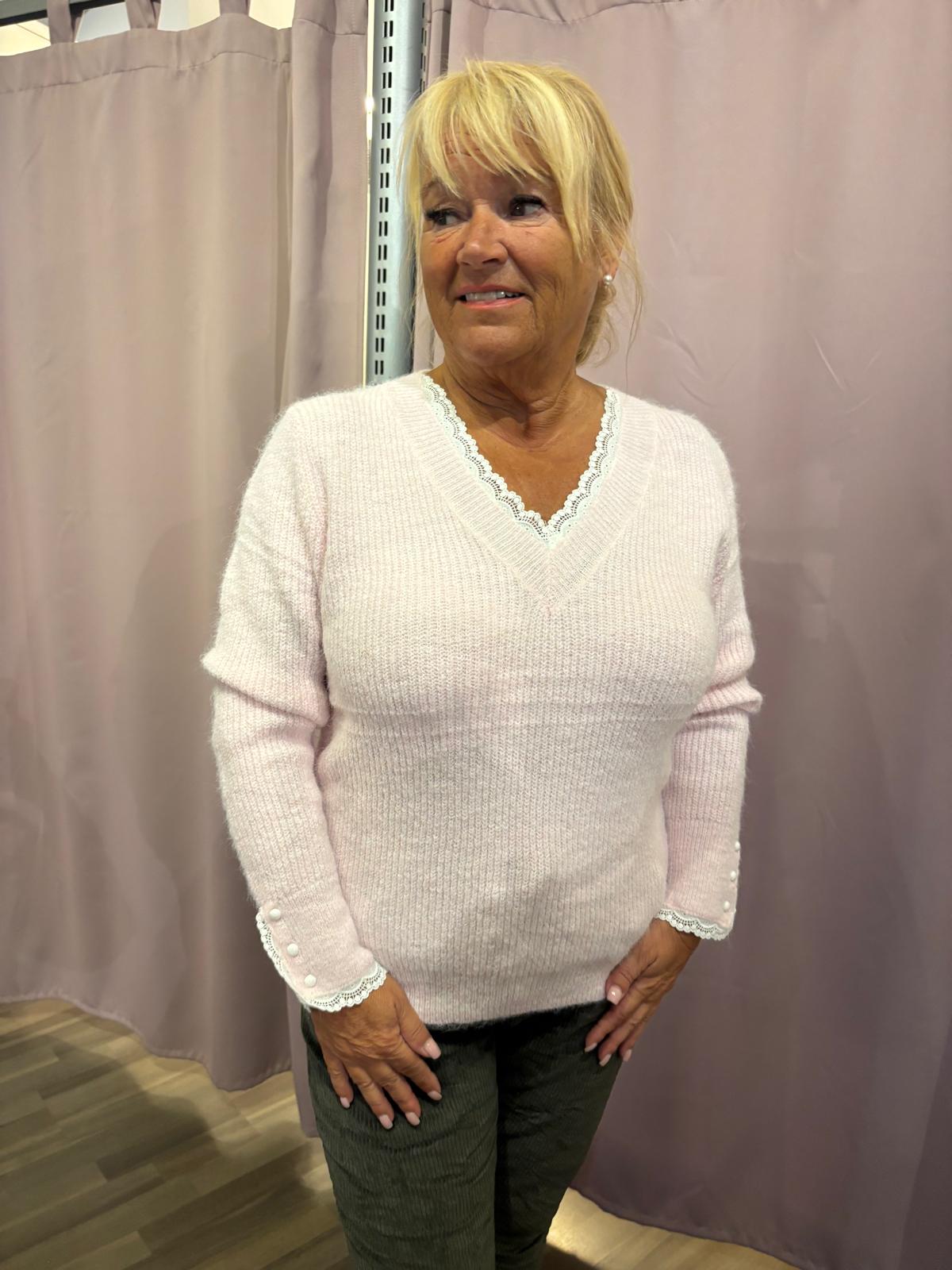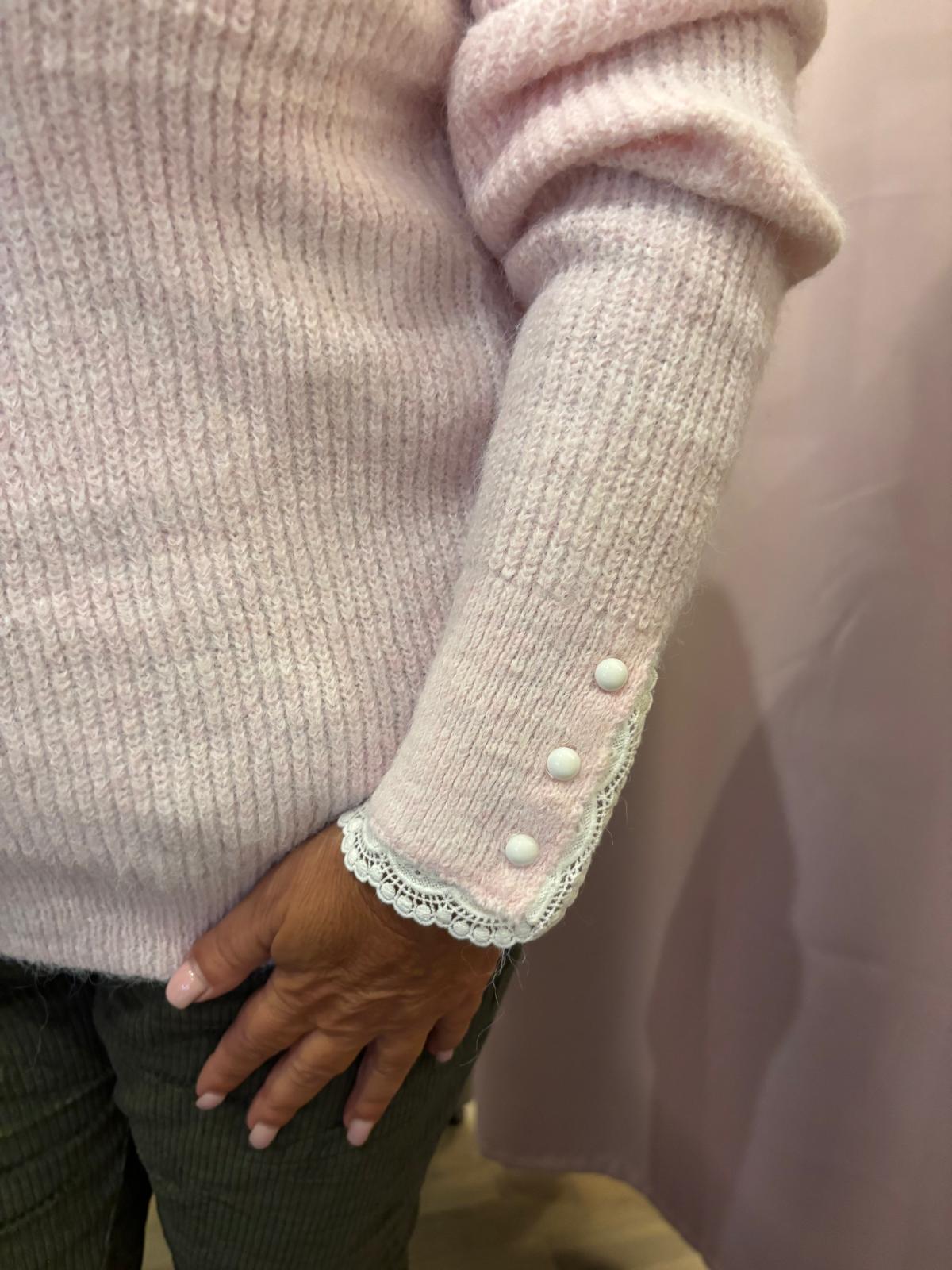 Suloisen pehmeä, vähän pörröinen neulepusero. V-pääntie jossa pitsikoristeet, hihansuissa napit ja pitsit koristeena.