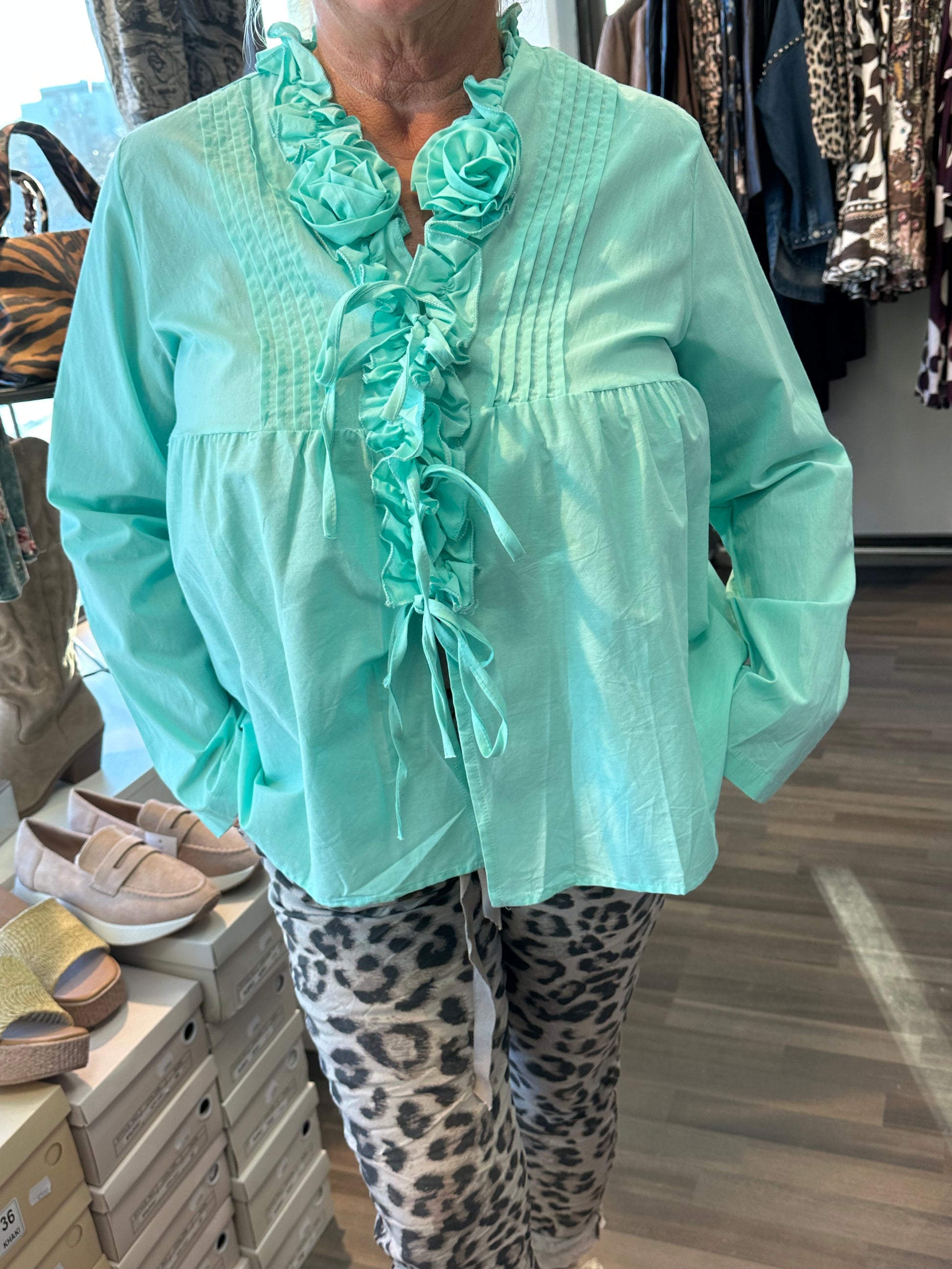 Suloinen pusero/jakku kevyttä puuvillaa. Edessä röyhelöä. Avoin pusero, jossa edessä kangasnyörit.