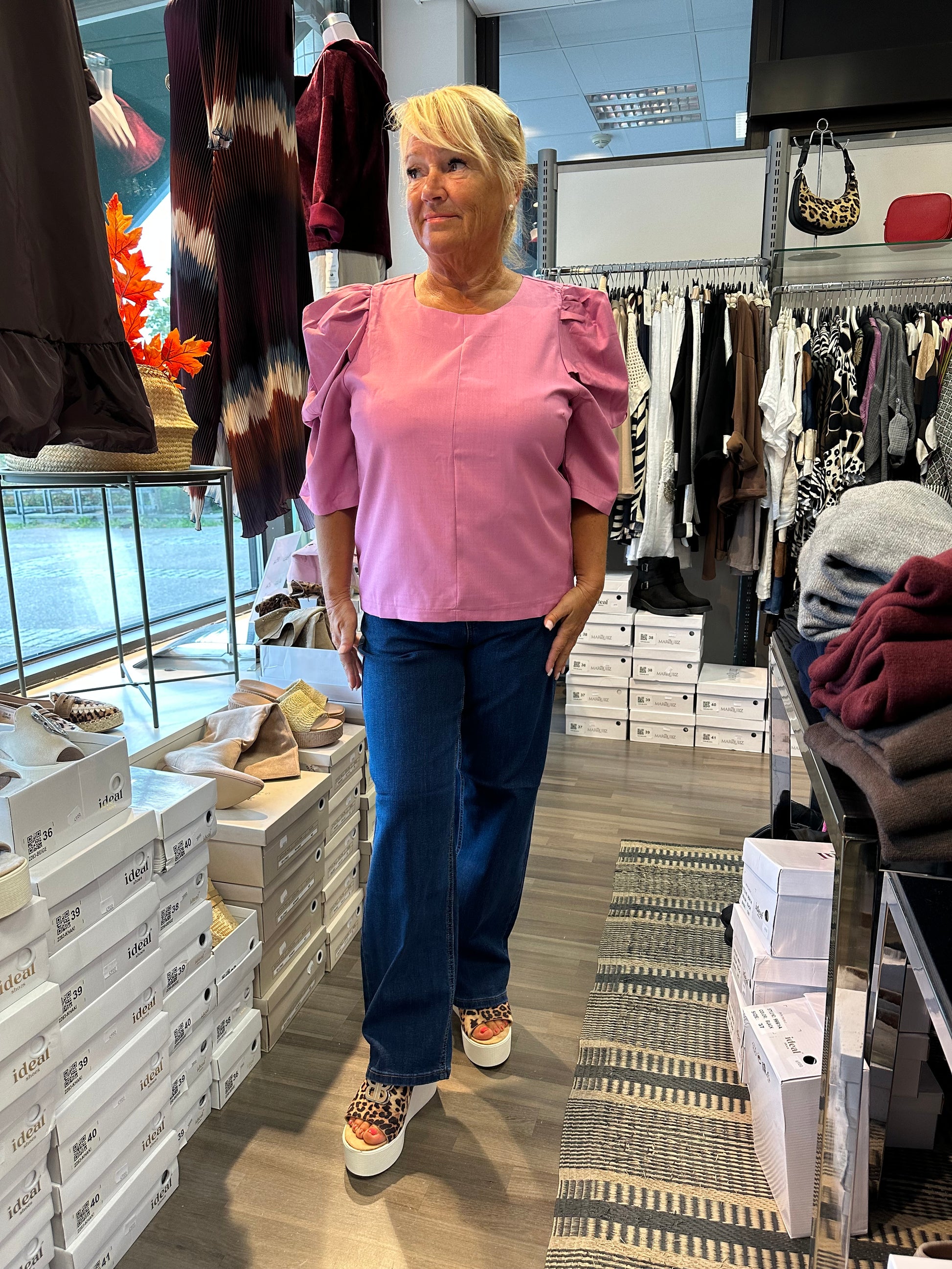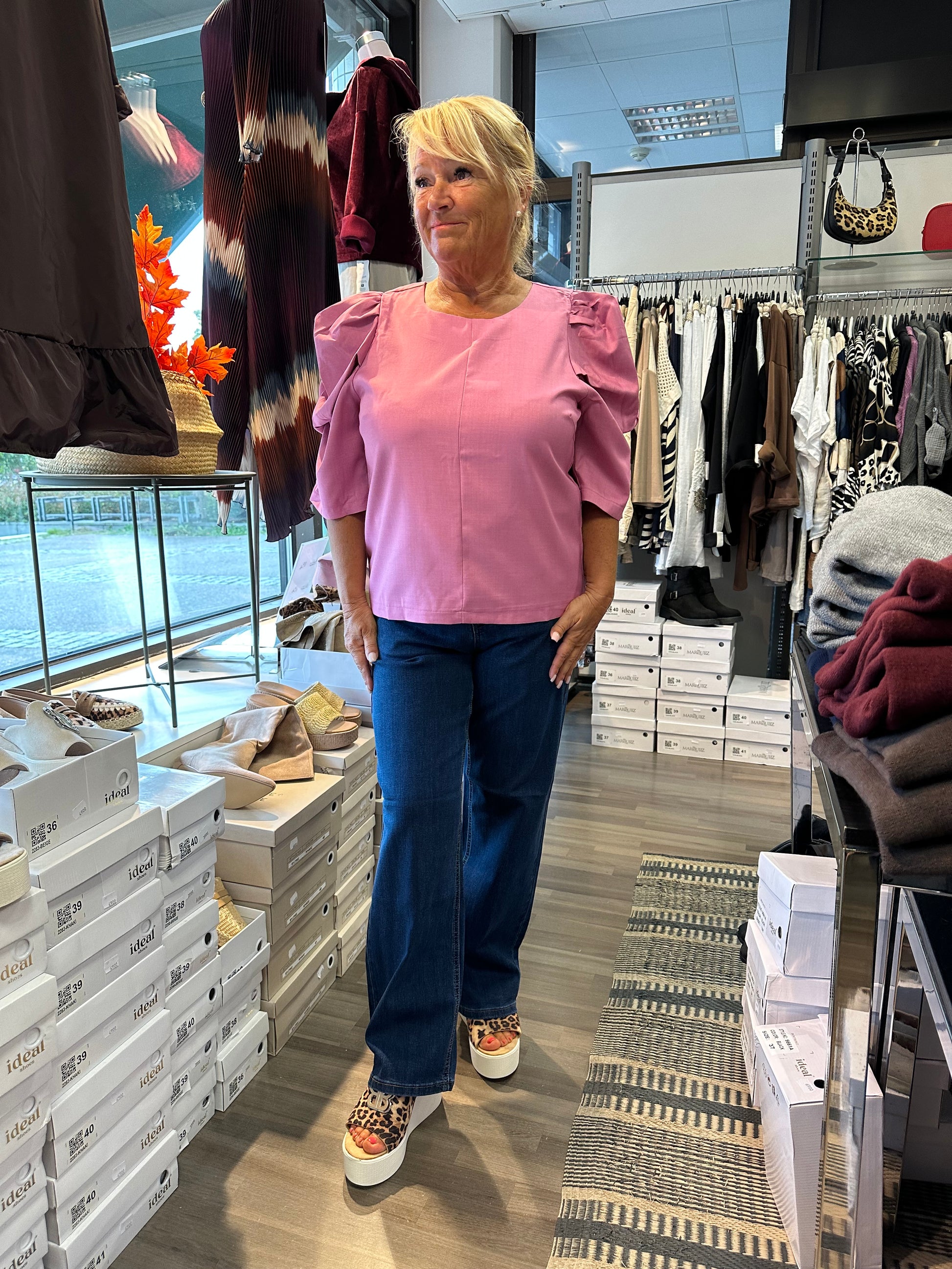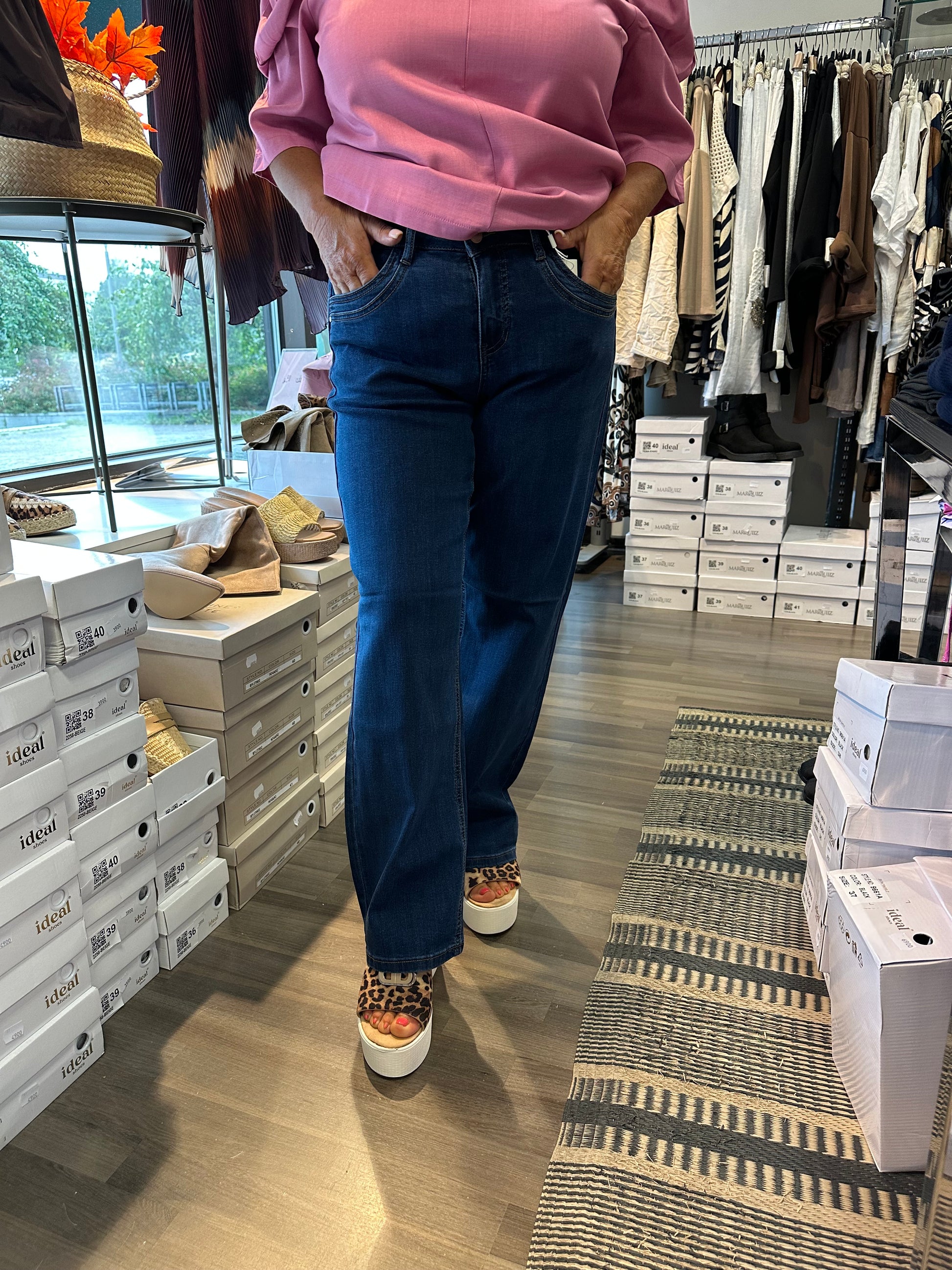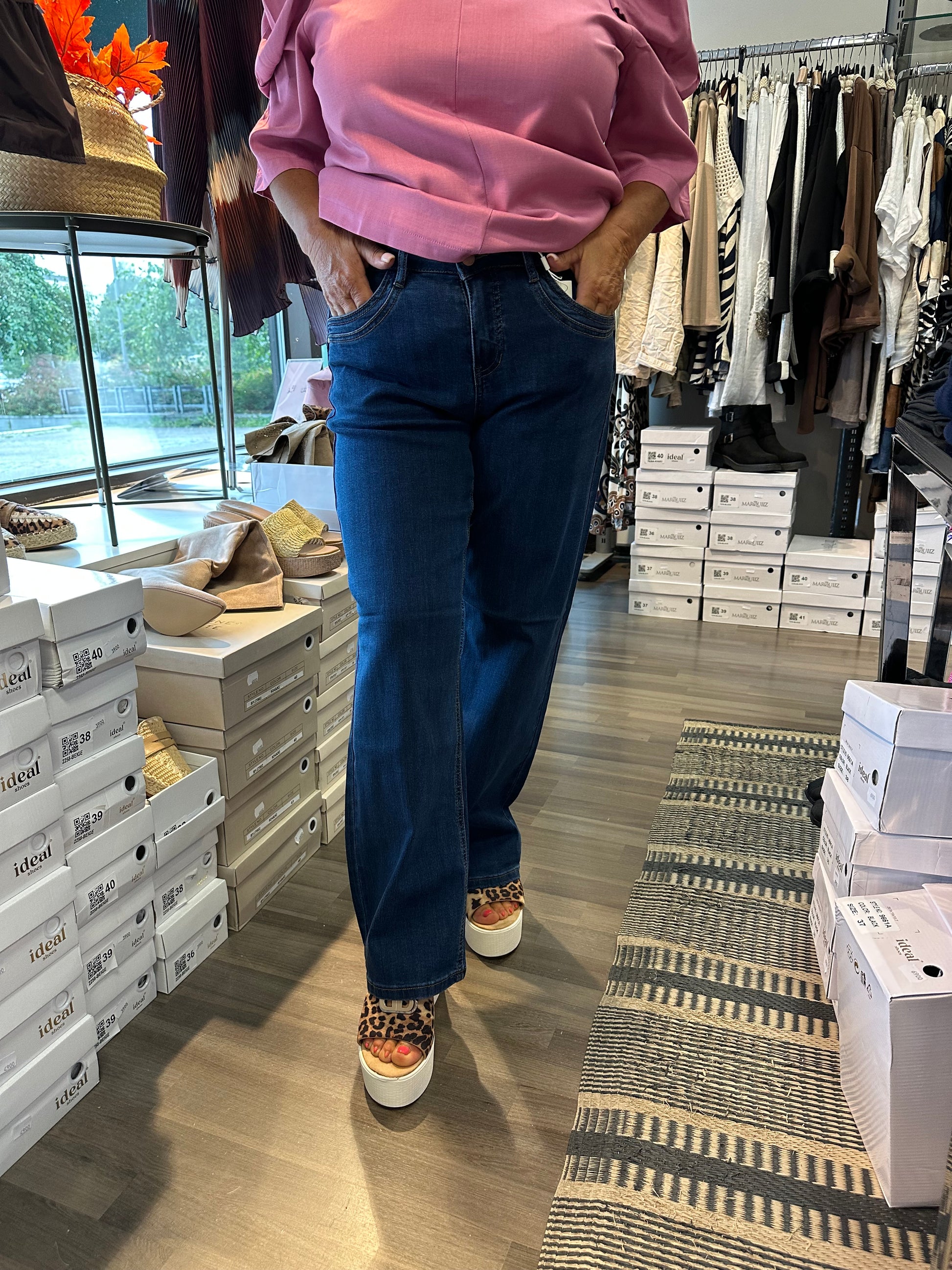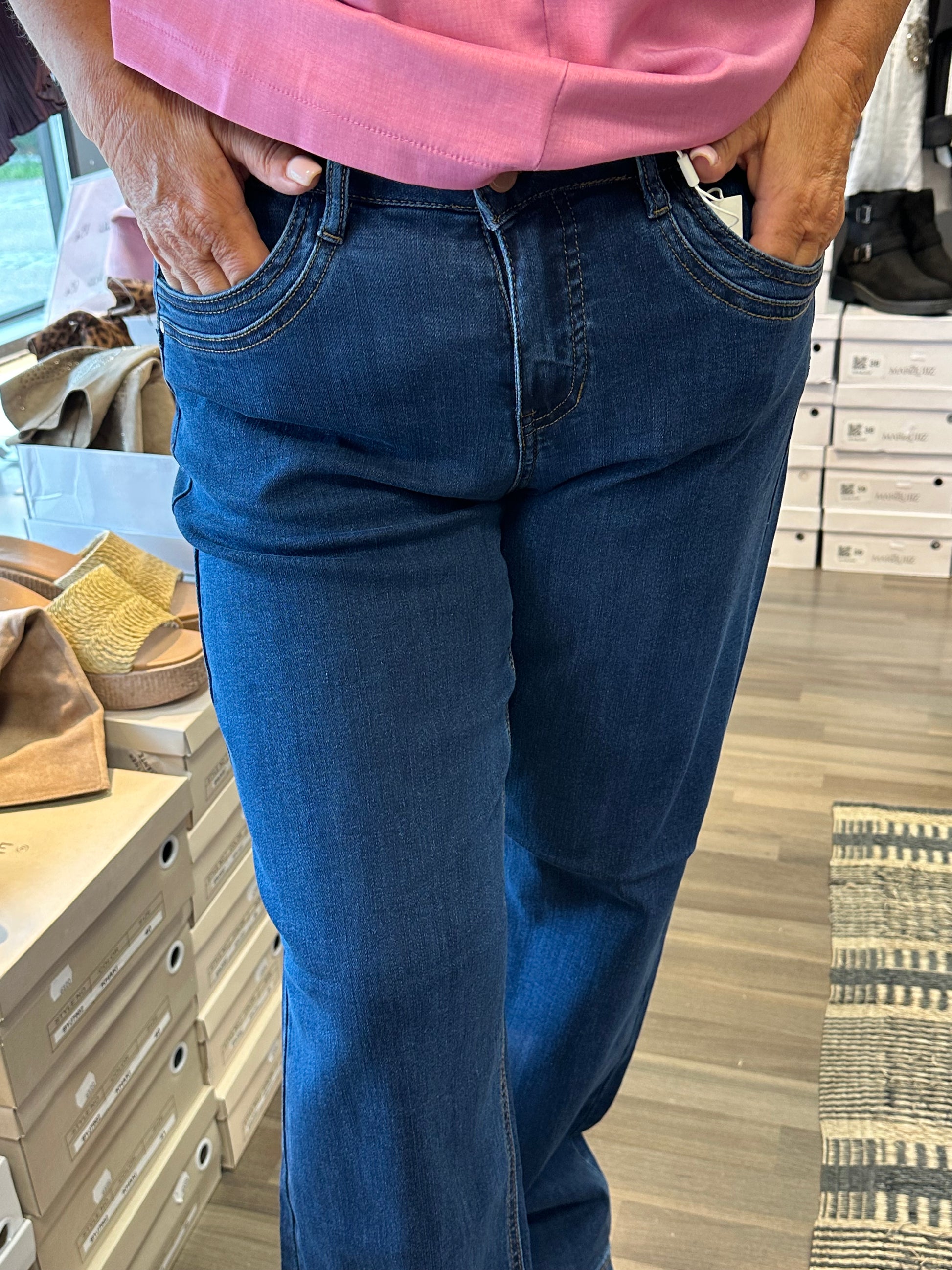 Mukavan joustavat suoralahkeiset farkut korkealla vyötäröllä. Vetoketju ja nappikiinnitys.