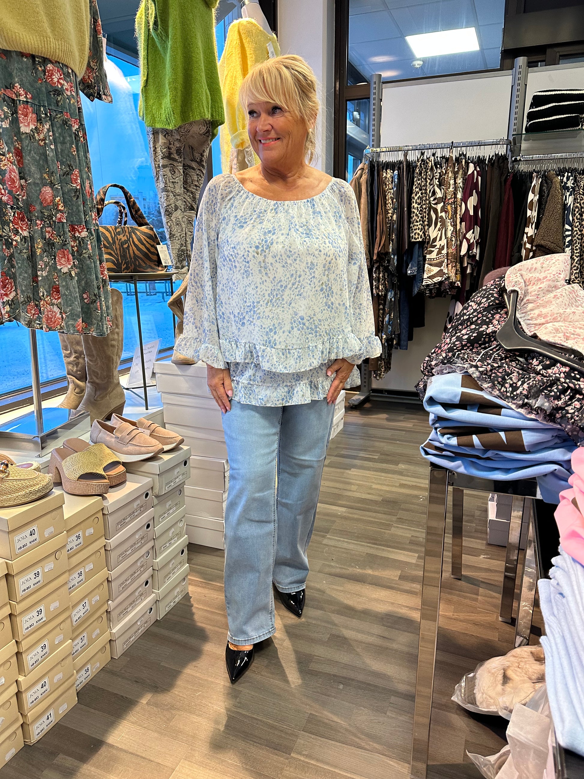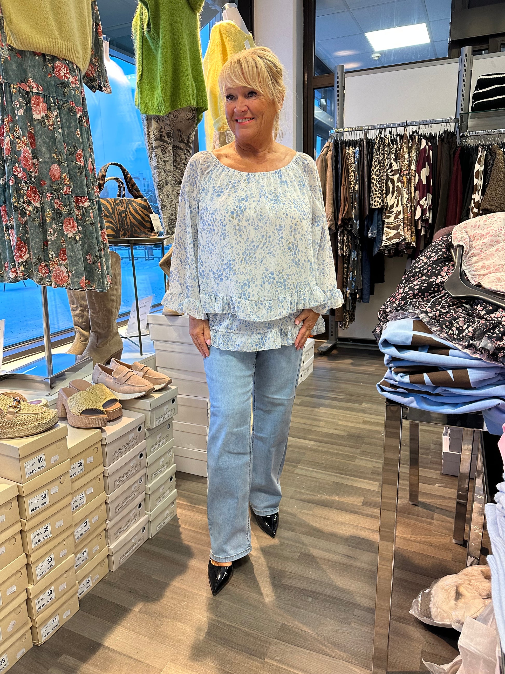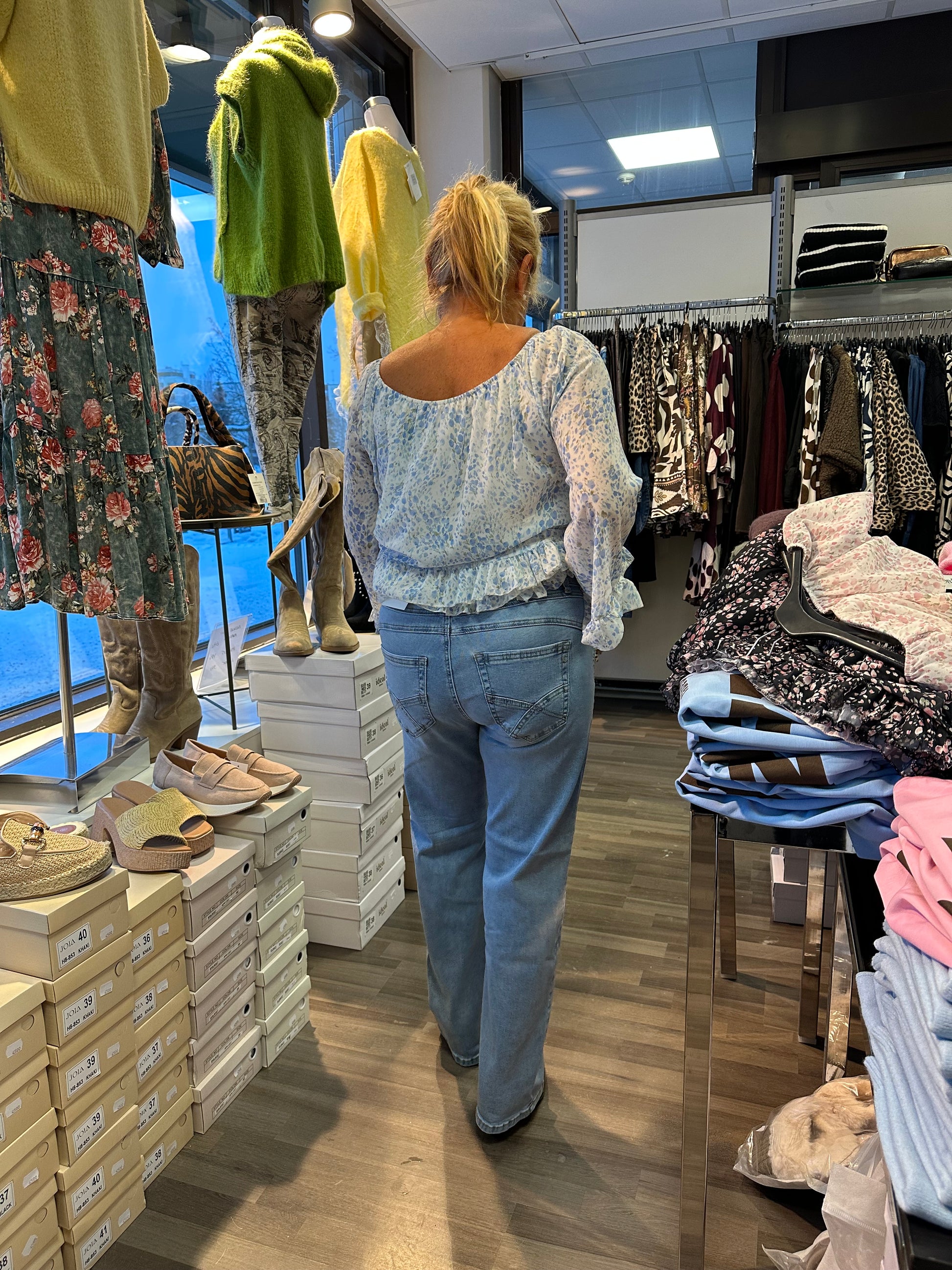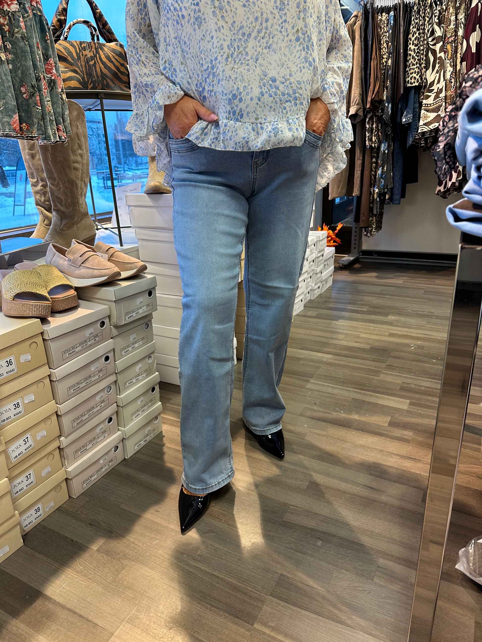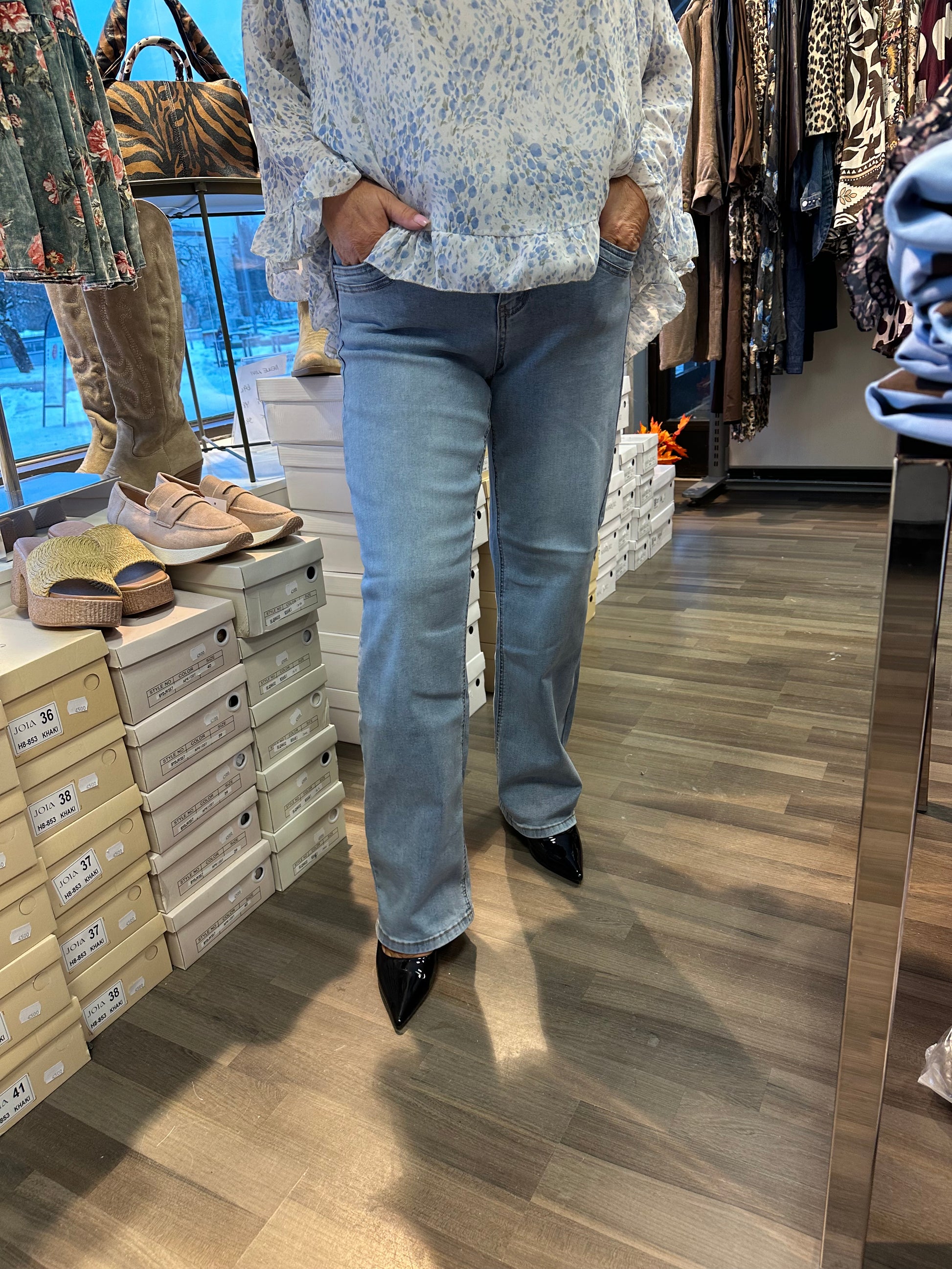 Mukavan joustavat suoralahkeiset farkut korkealla vyötäröllä. Vetoketju ja nappikiinnitys.