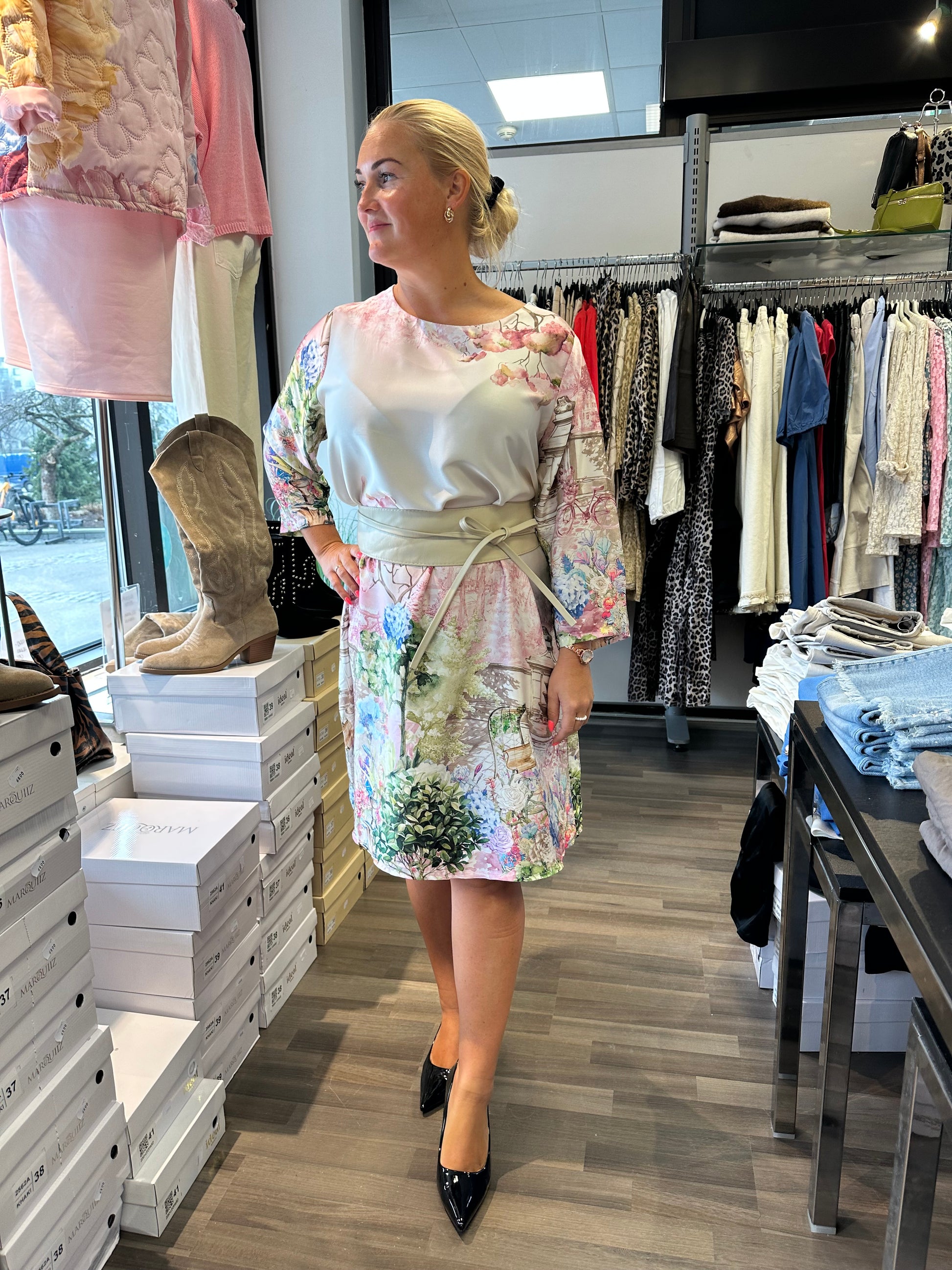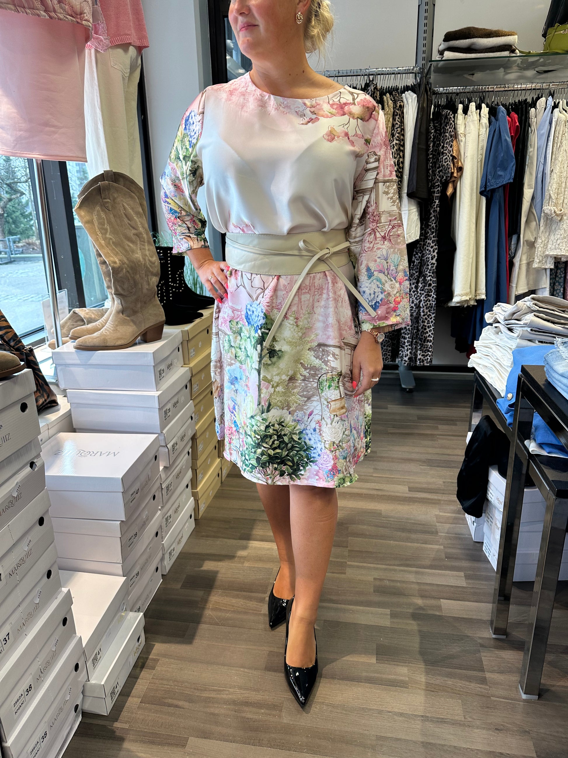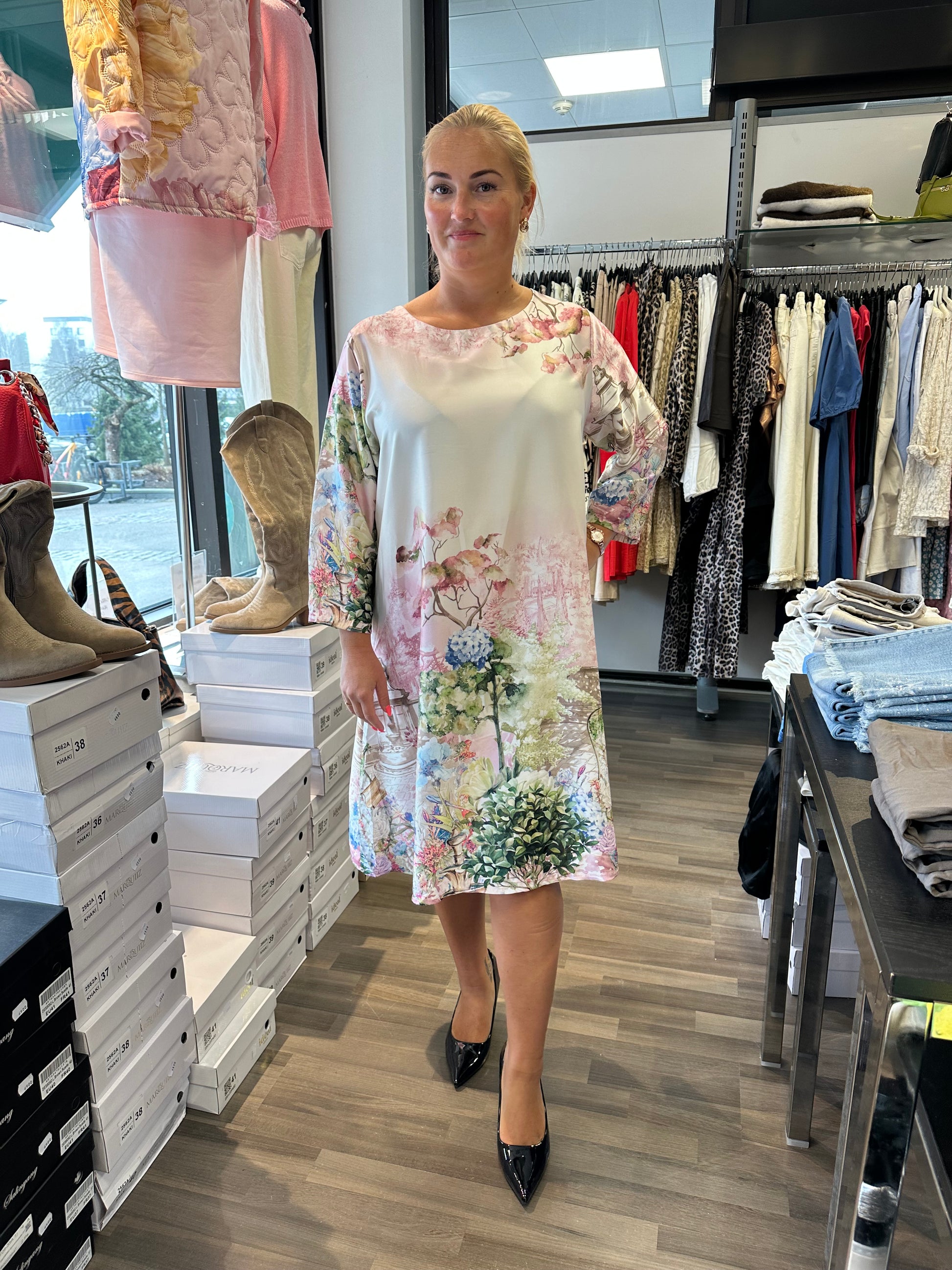 Kaunis ja kevyt mekko romanttisella puutarhakuosilla. Pehmeä värimaailma ja yksityiskohtainen printti tuovat mekkoon raikkautta. Suoralinjainen, väljä malli. Pyöreä pääntie ja 3/4-hihat.