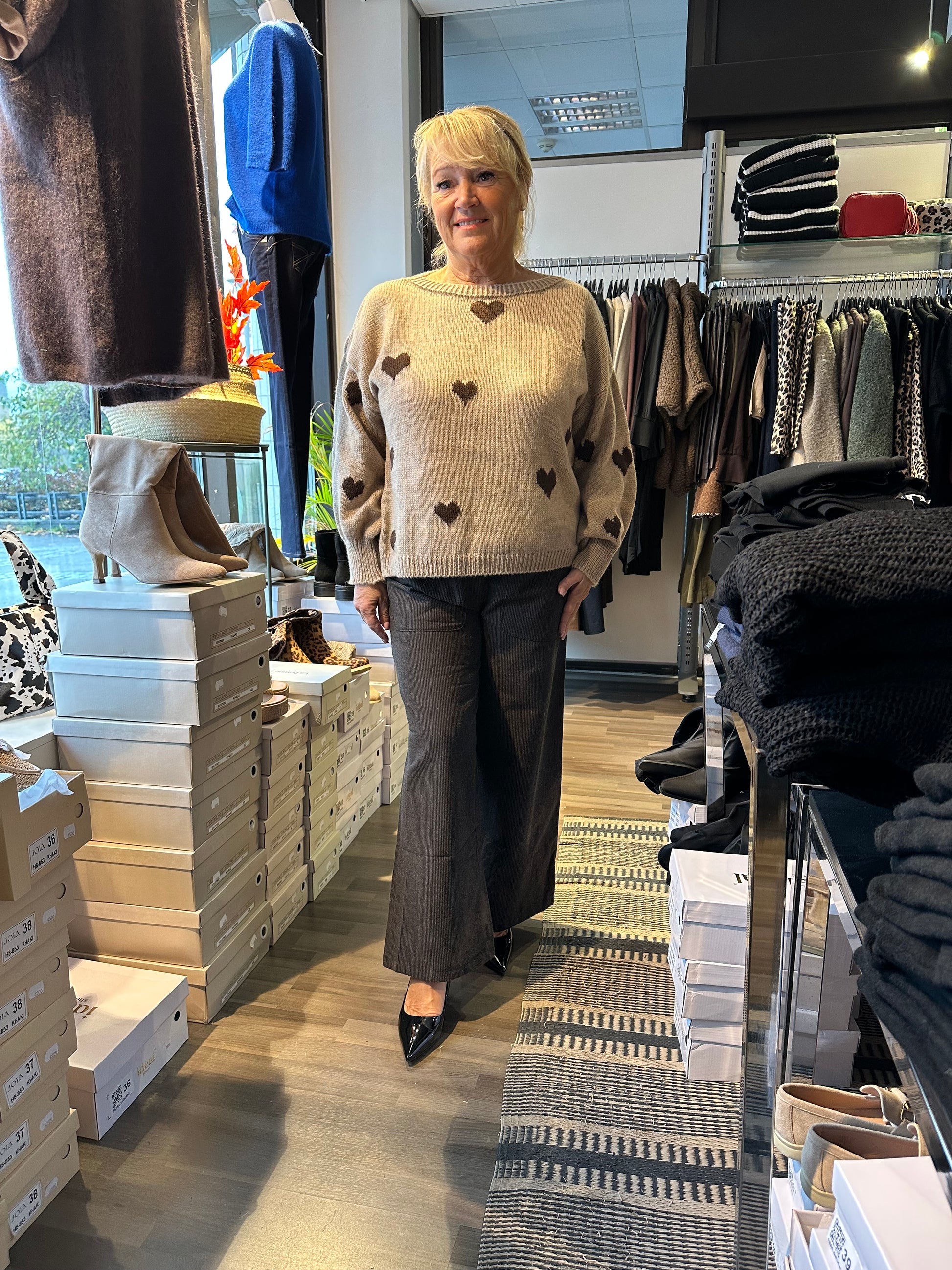Suloinen neule tummanruskeilla sydänkuvioilla. Mukavan kevyt neule.
