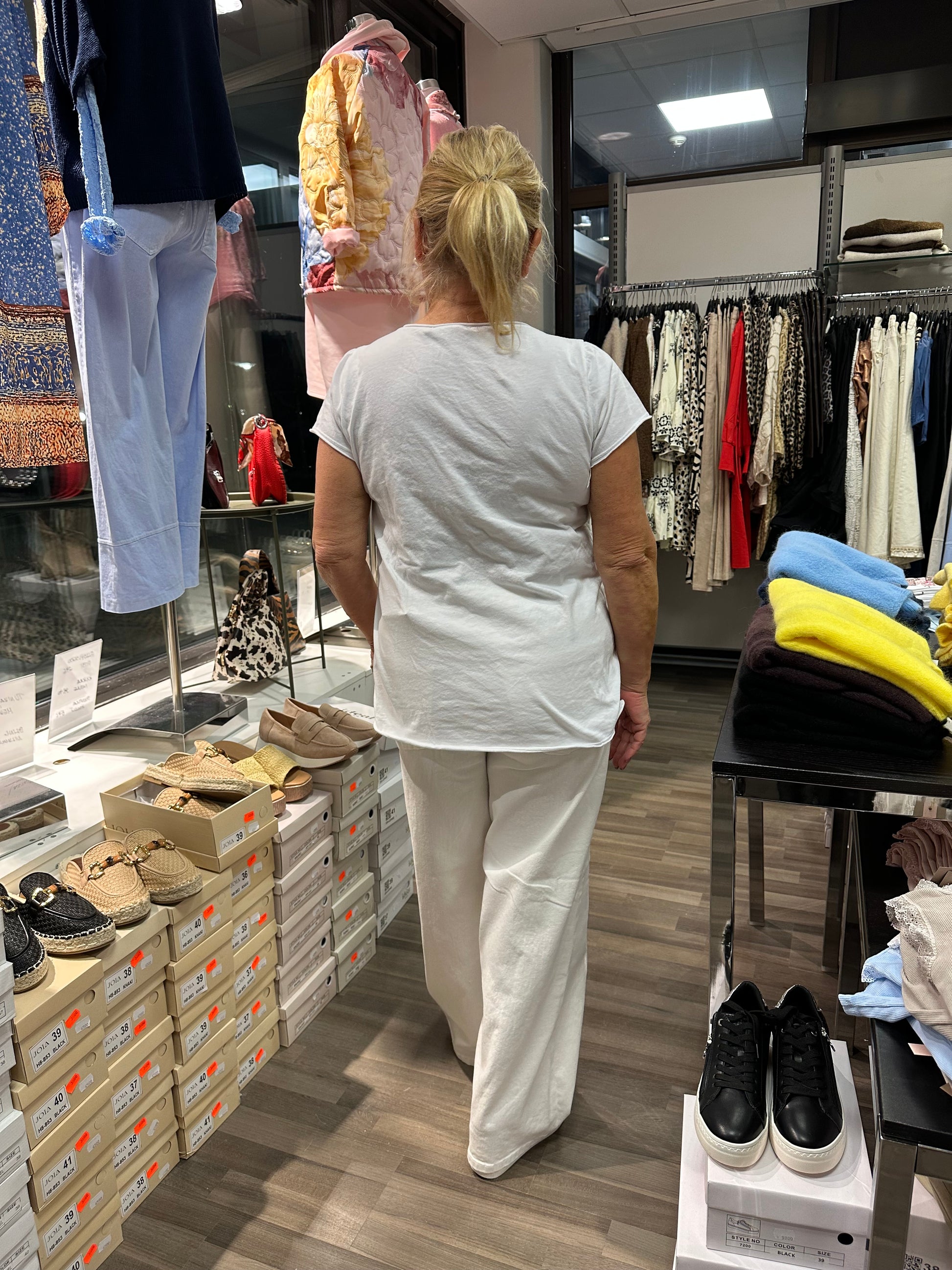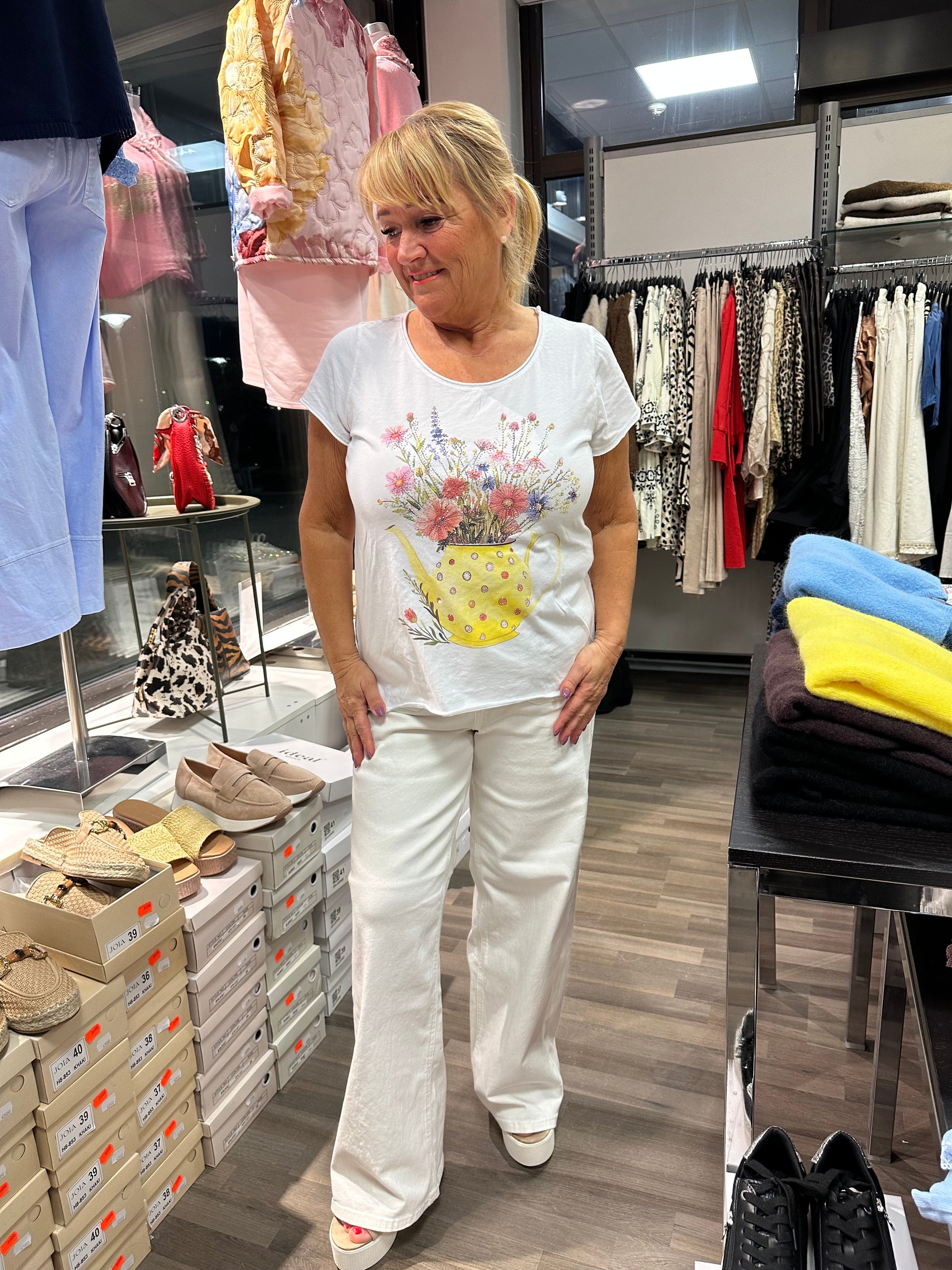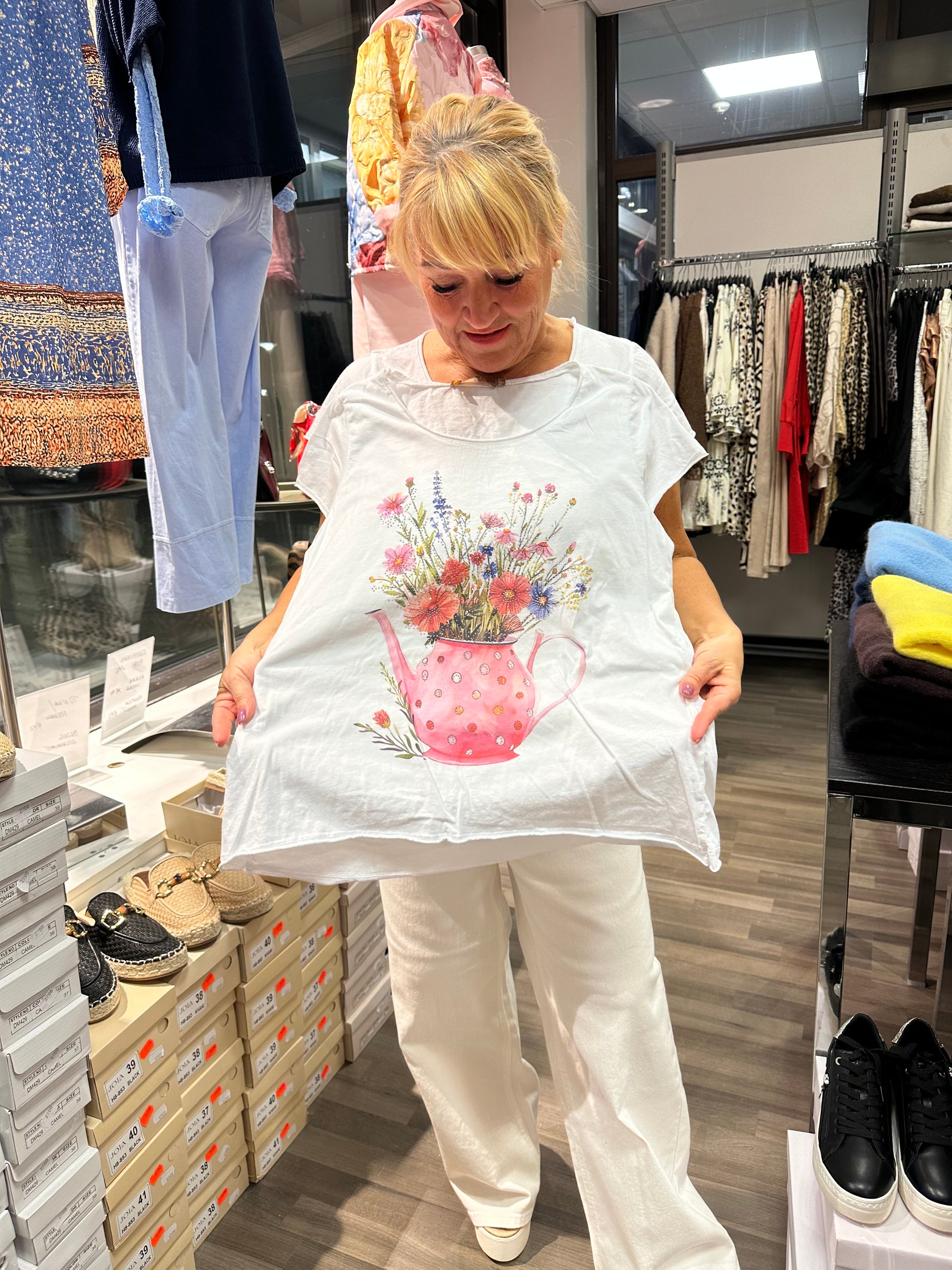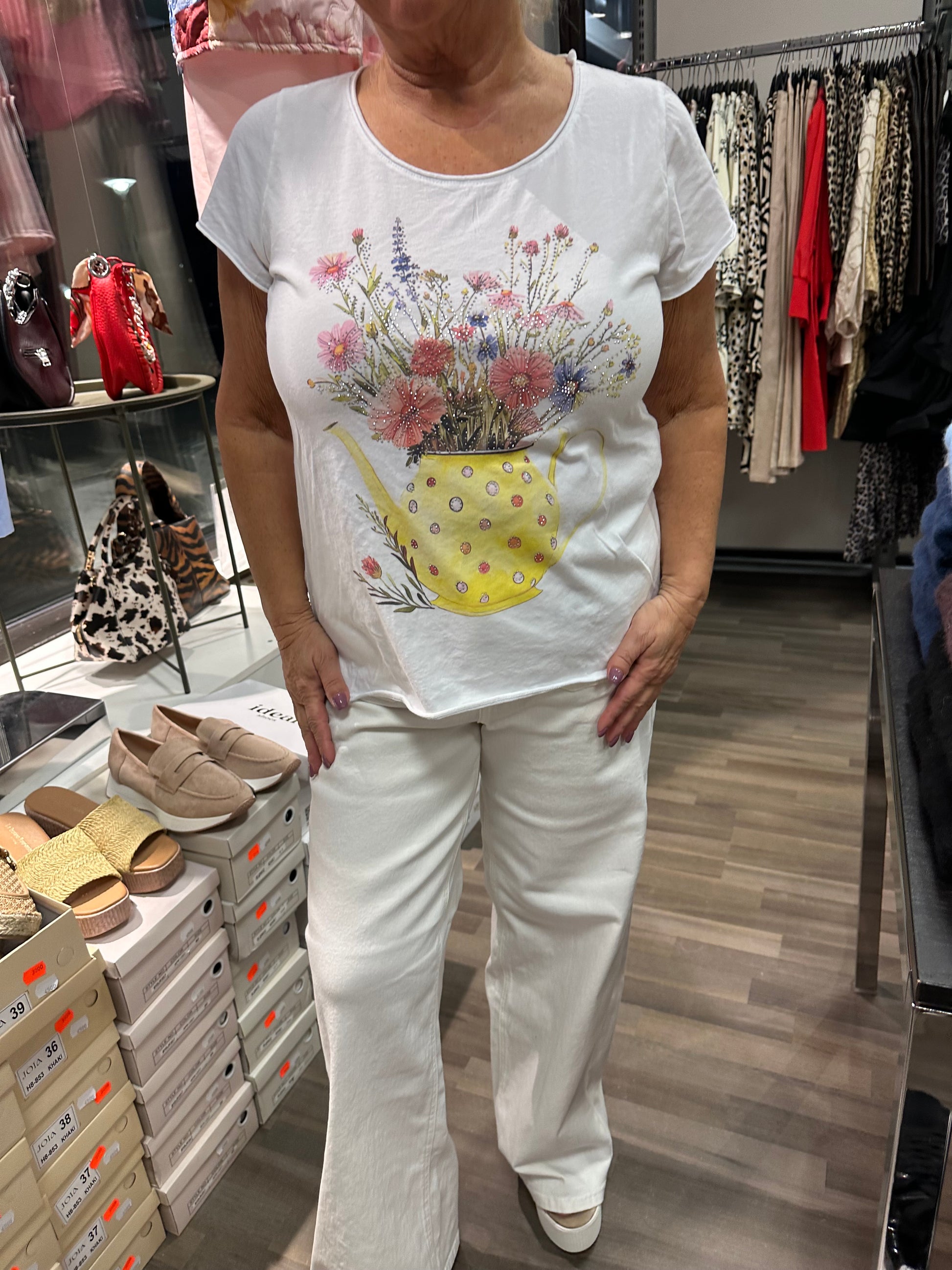 Pehmeä ja miellyttävä puuvillainen t-paita, jossa värikäs printti blingillä. Suoralinjainen malli.