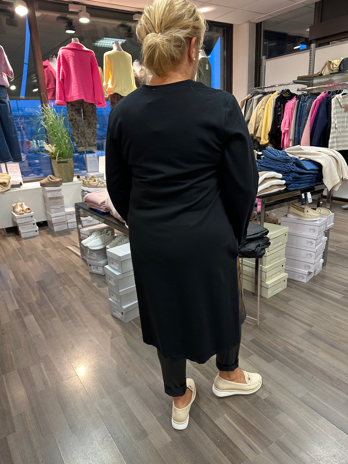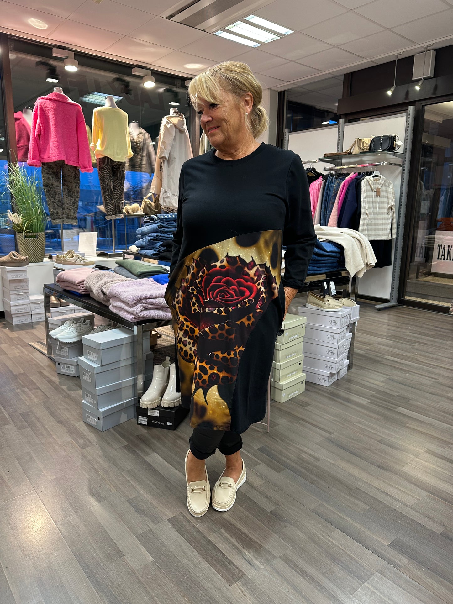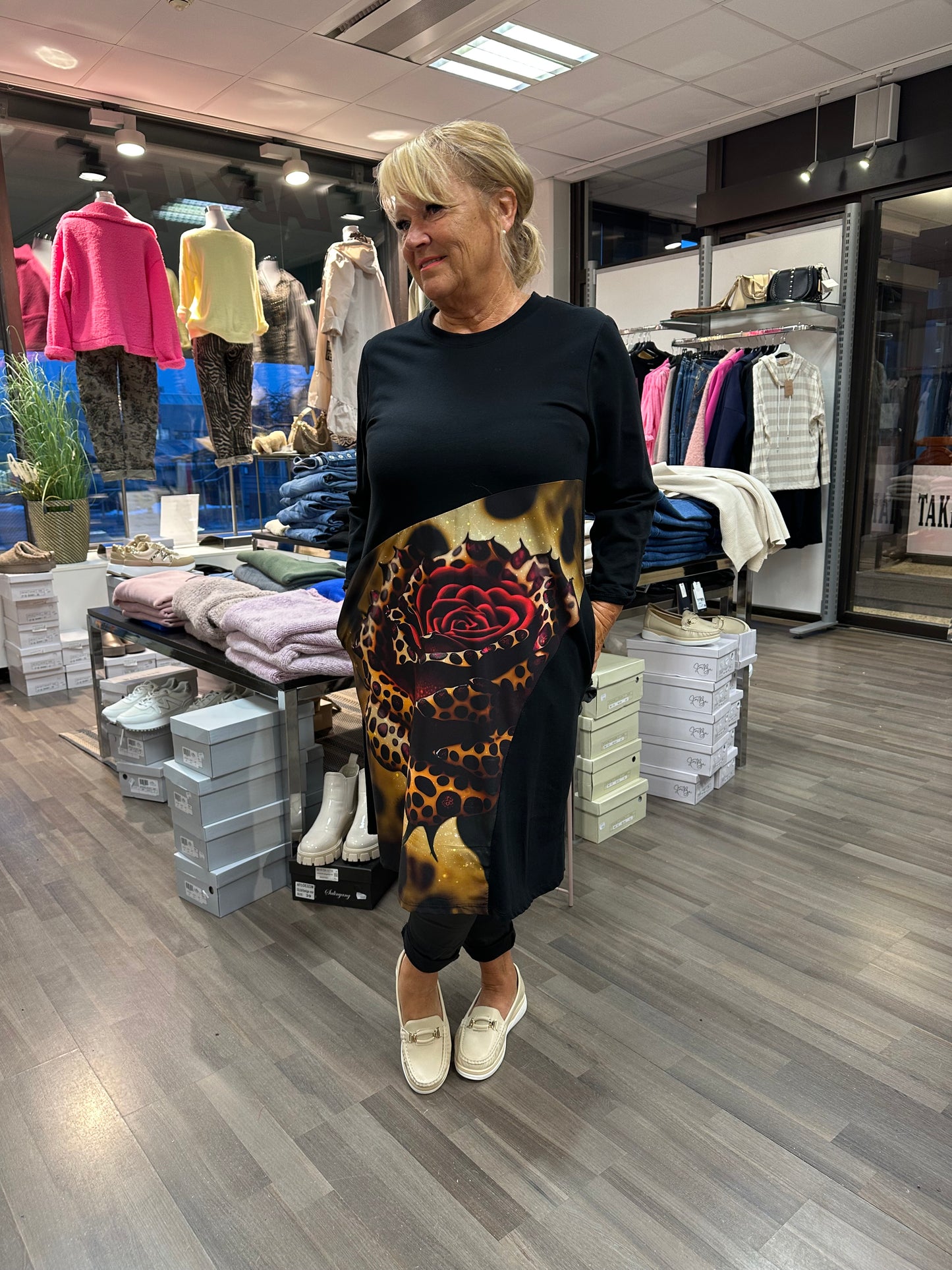 Mukava trikoomekko, jossa polyesteri kaistale kukkakuviolla. Sivuilla taskut.