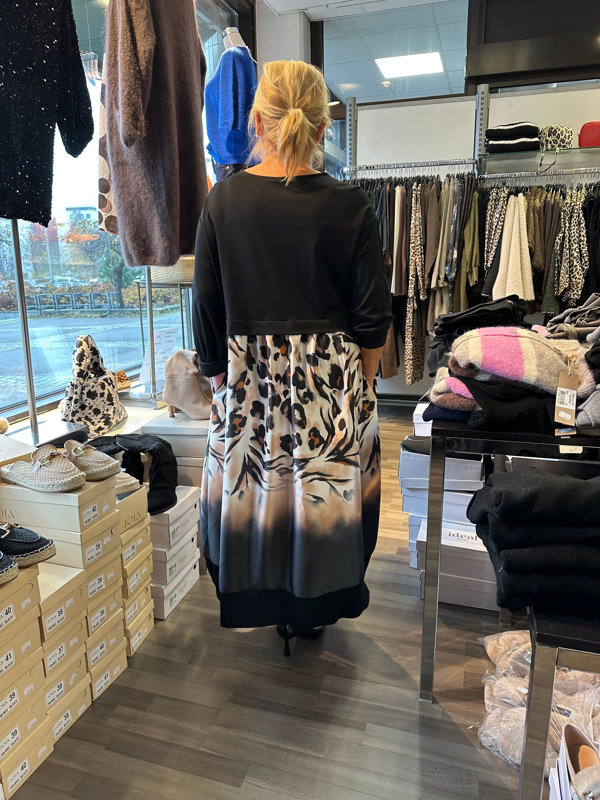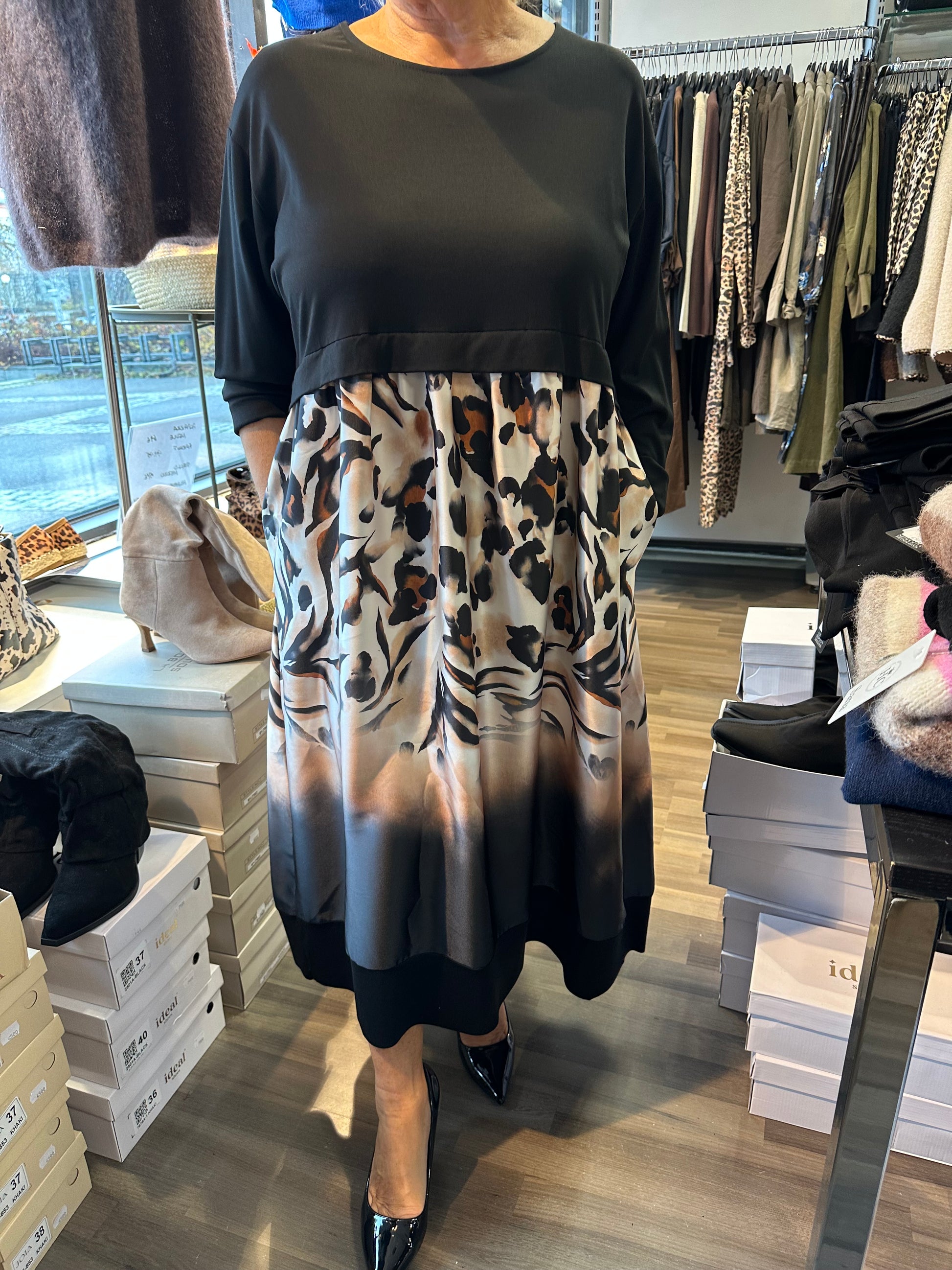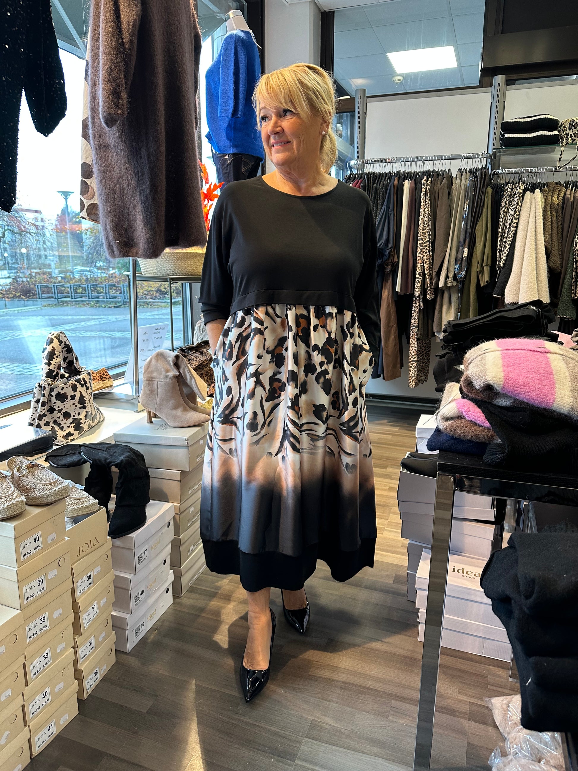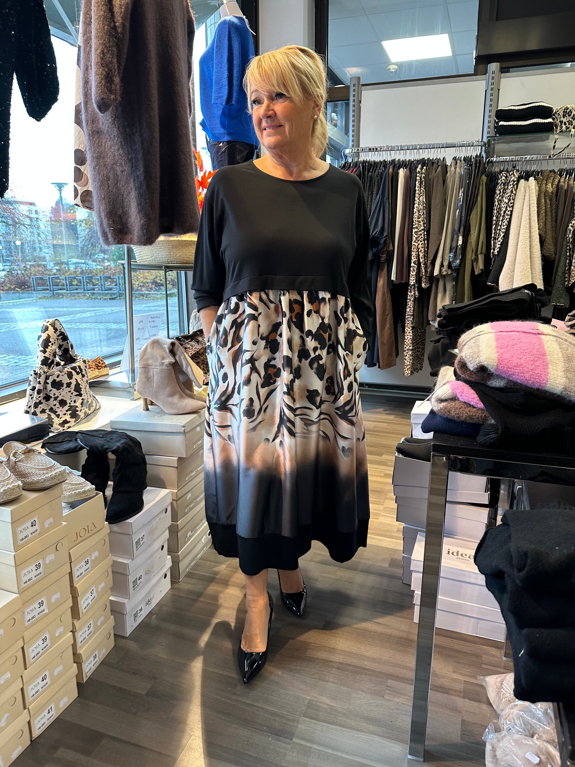 Reilumman mitoituksen trikoomekko upealla satiinihelmalla. Helma miellyttävän paksua satiinia, joka laskeutuu nätisti. Hieman tulppaanimallinen, jossa trikoinen helmakaistale. Taskut sivuilla.