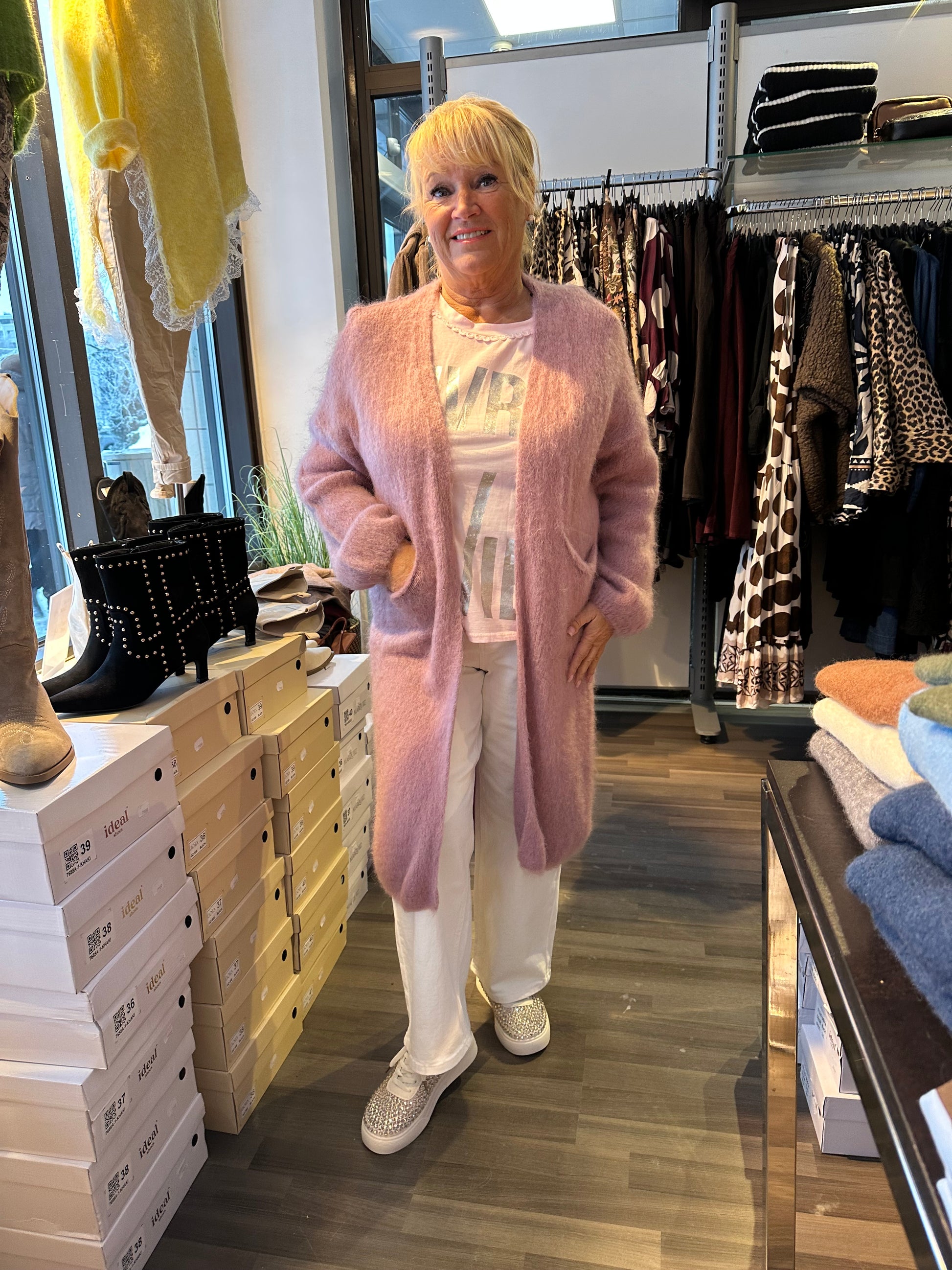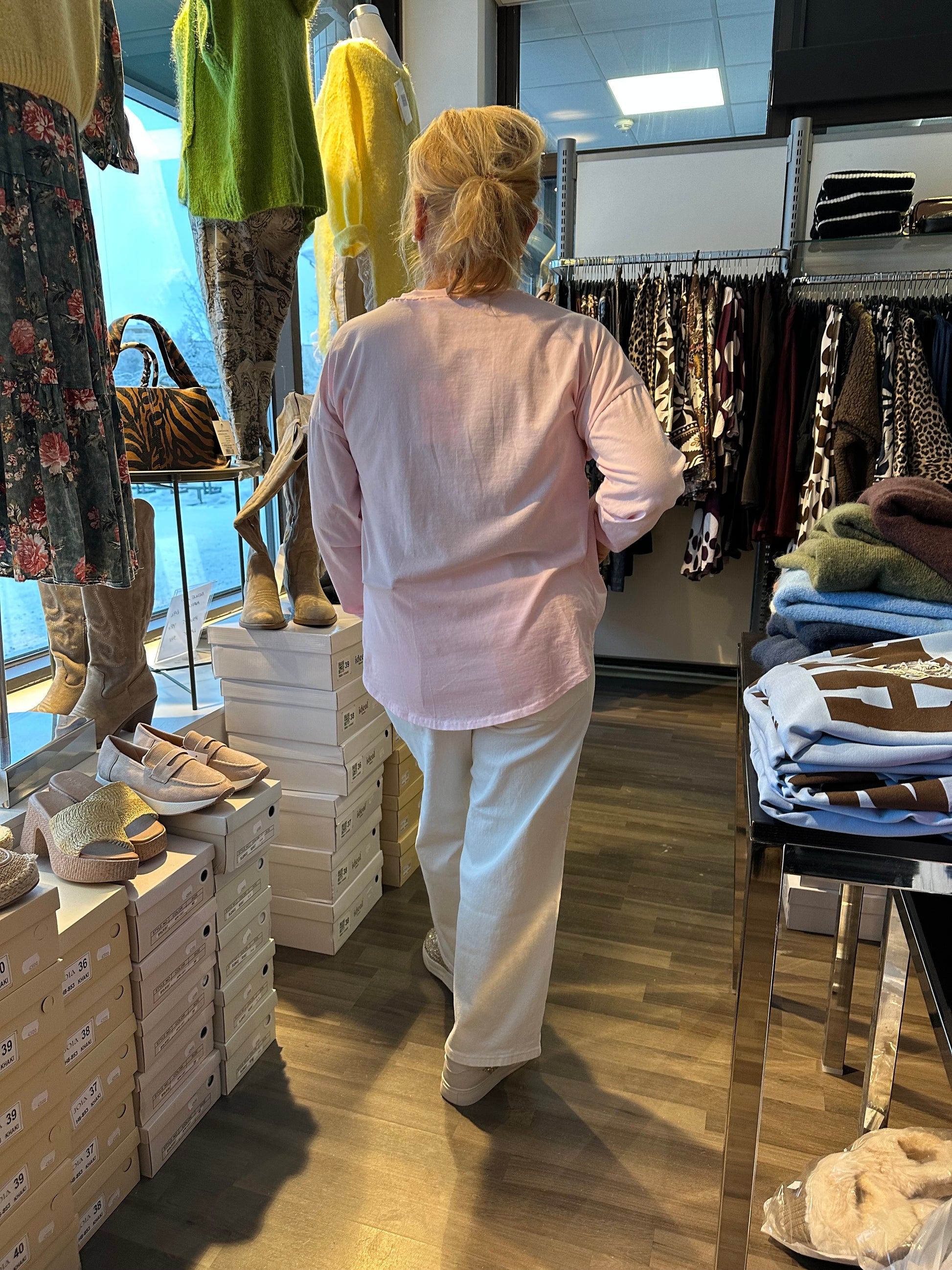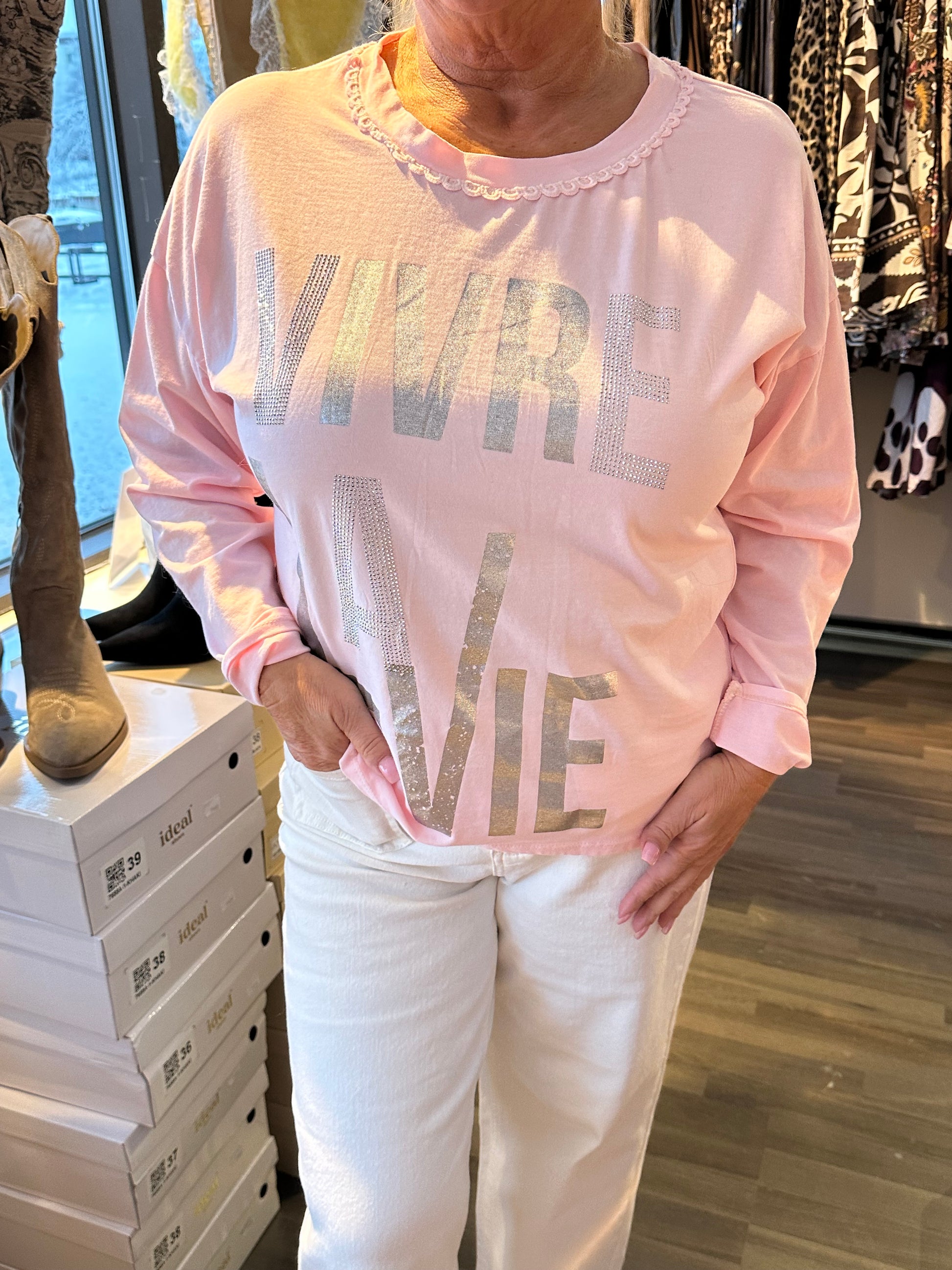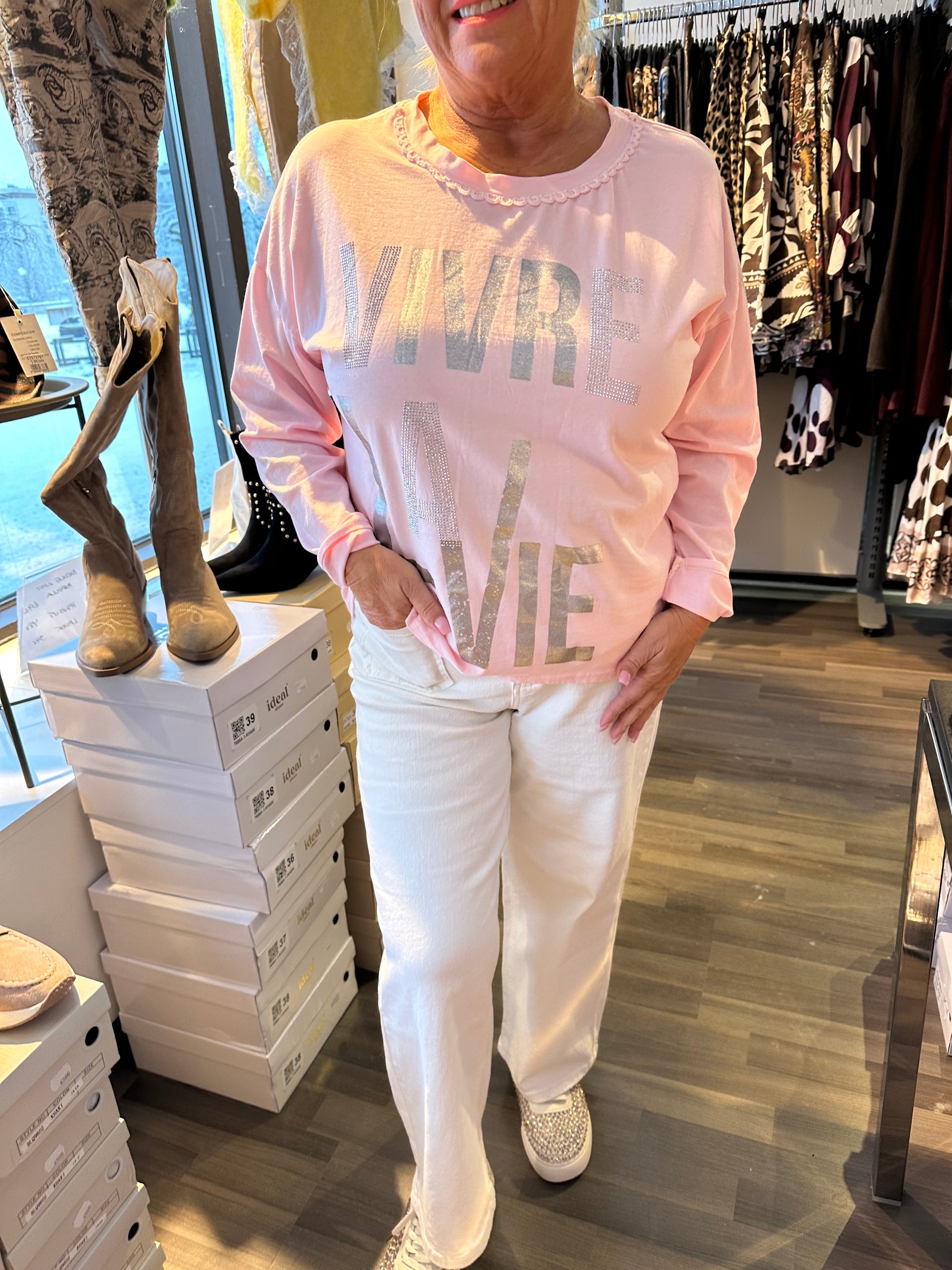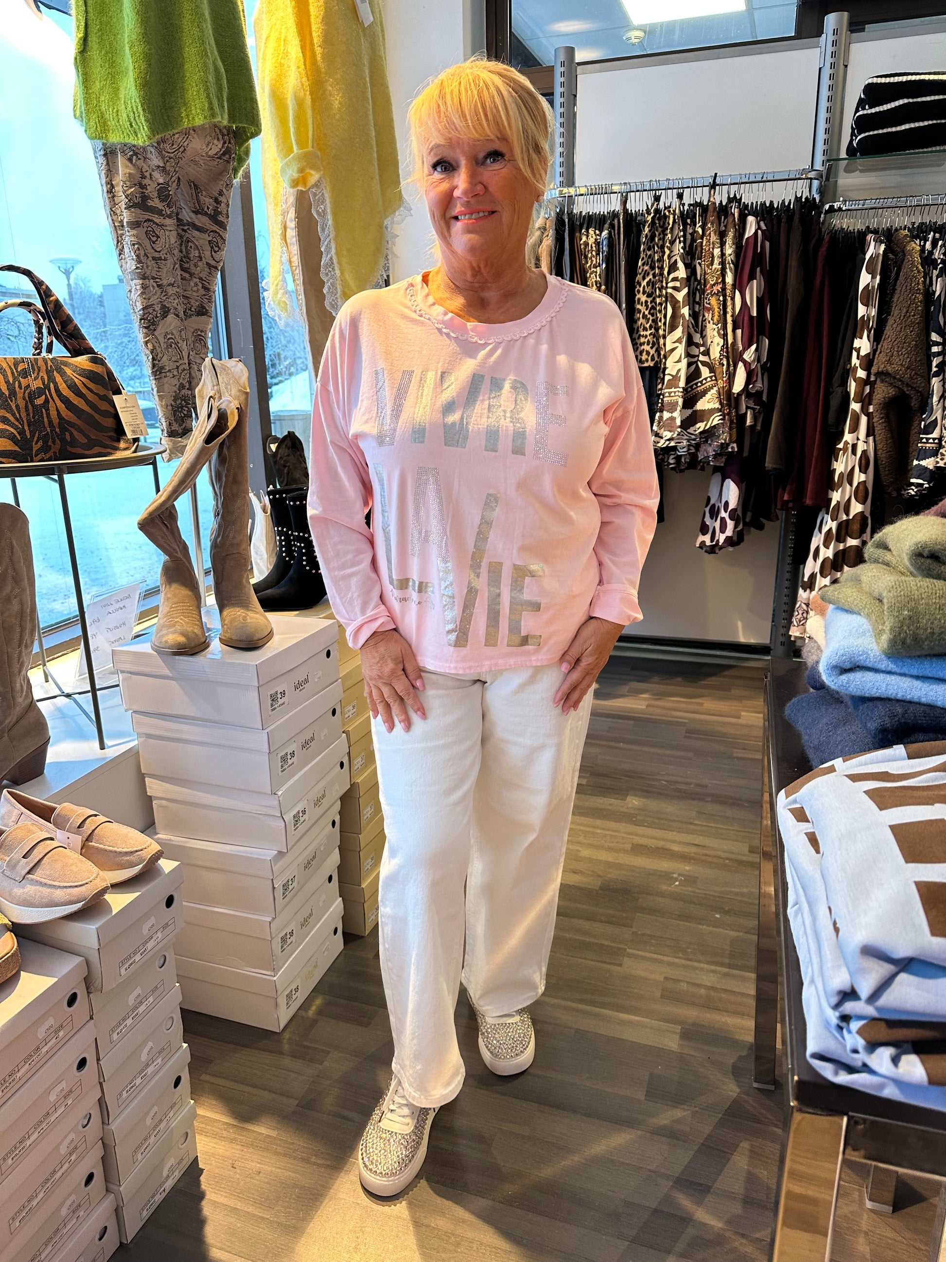 Todella miellyttävän tuntuinen trikoopusero. Edessä hieman blingiä ja tekstiä. Pyöreä pääntiellä suloisella brodeeratulla yksityiskohdalla.