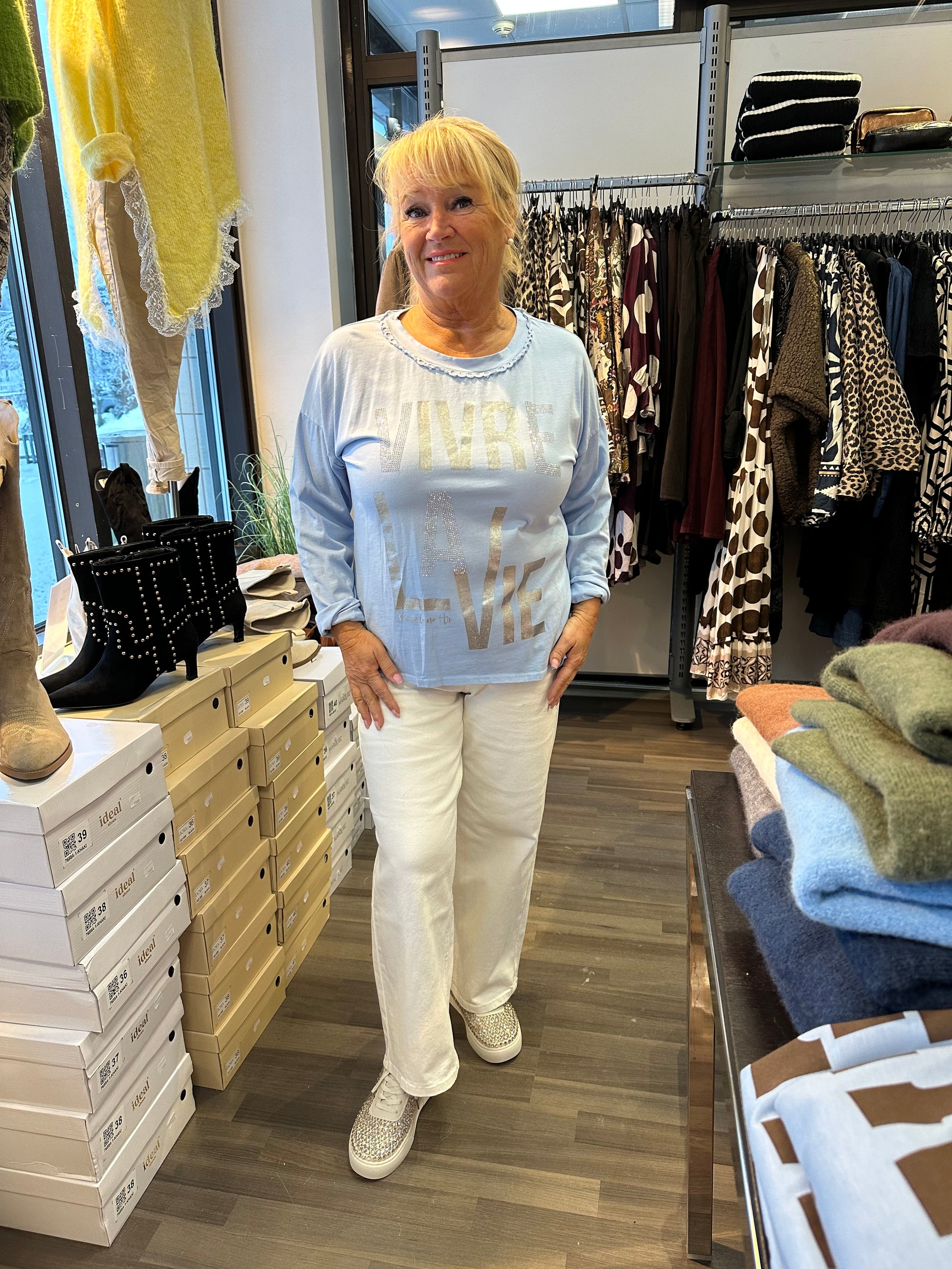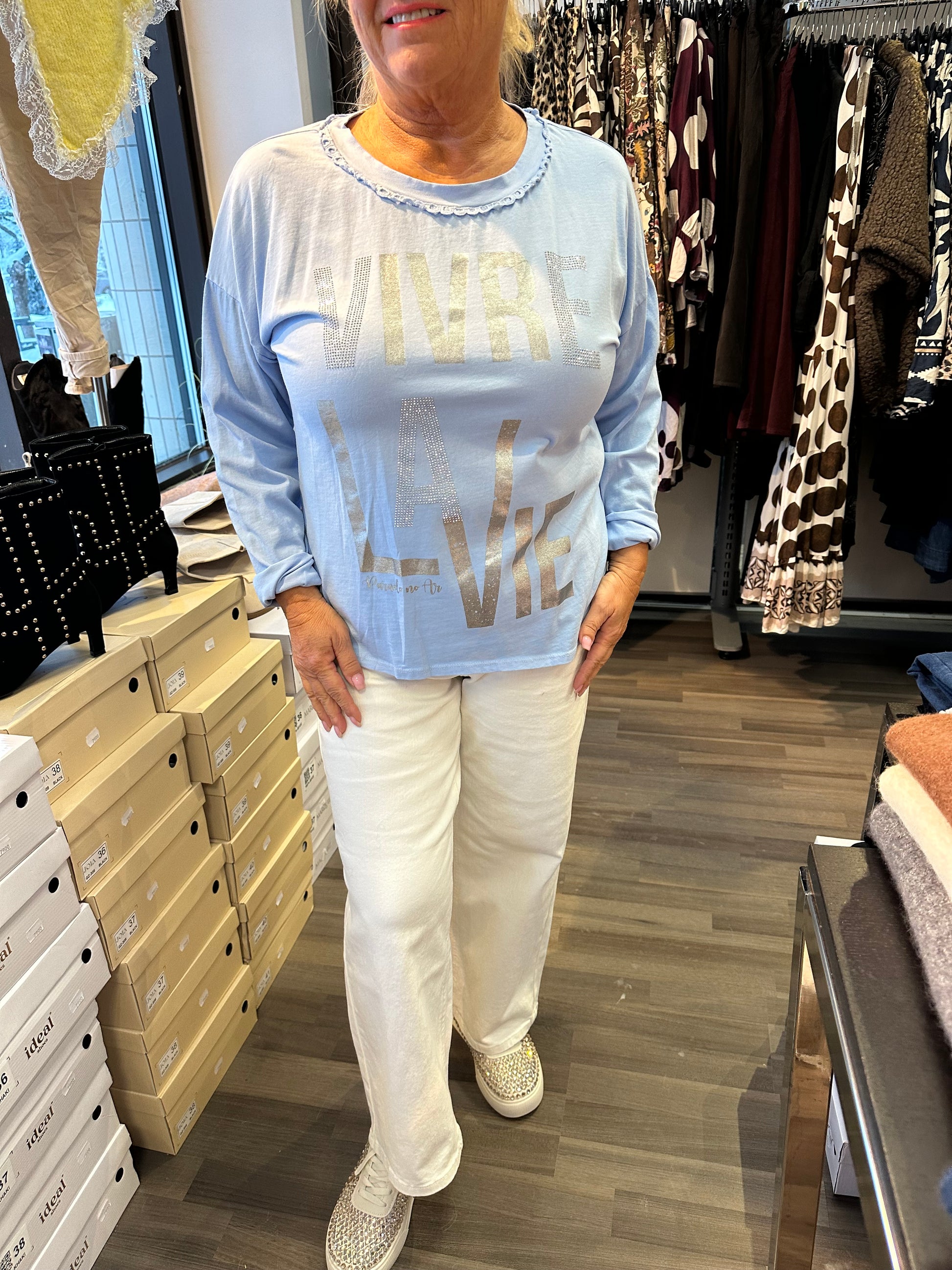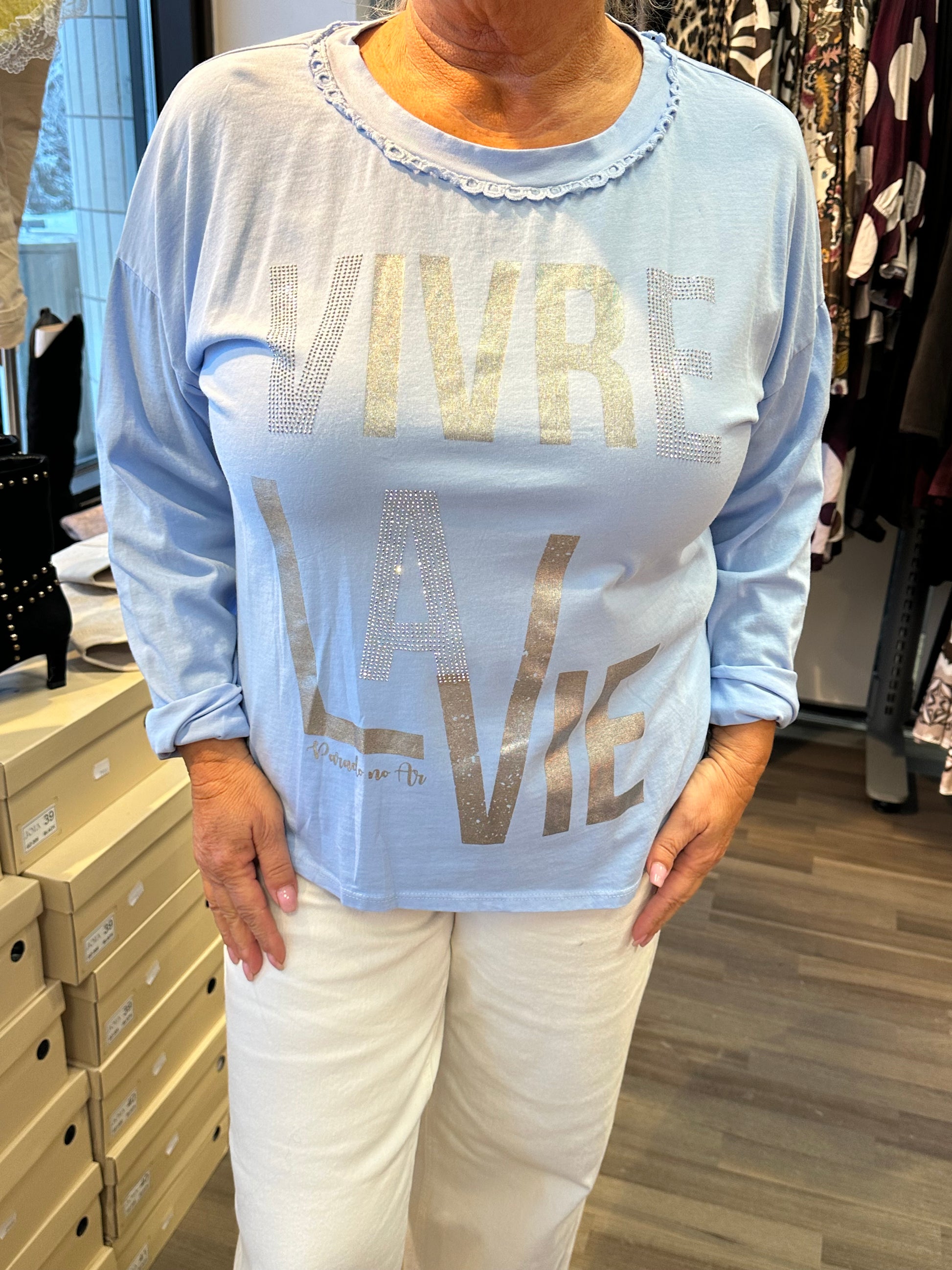 Todella miellyttävän tuntuinen trikoopusero. Edessä hieman blingiä ja tekstiä. Pyöreä pääntiellä suloisella brodeeratulla yksityiskohdalla.