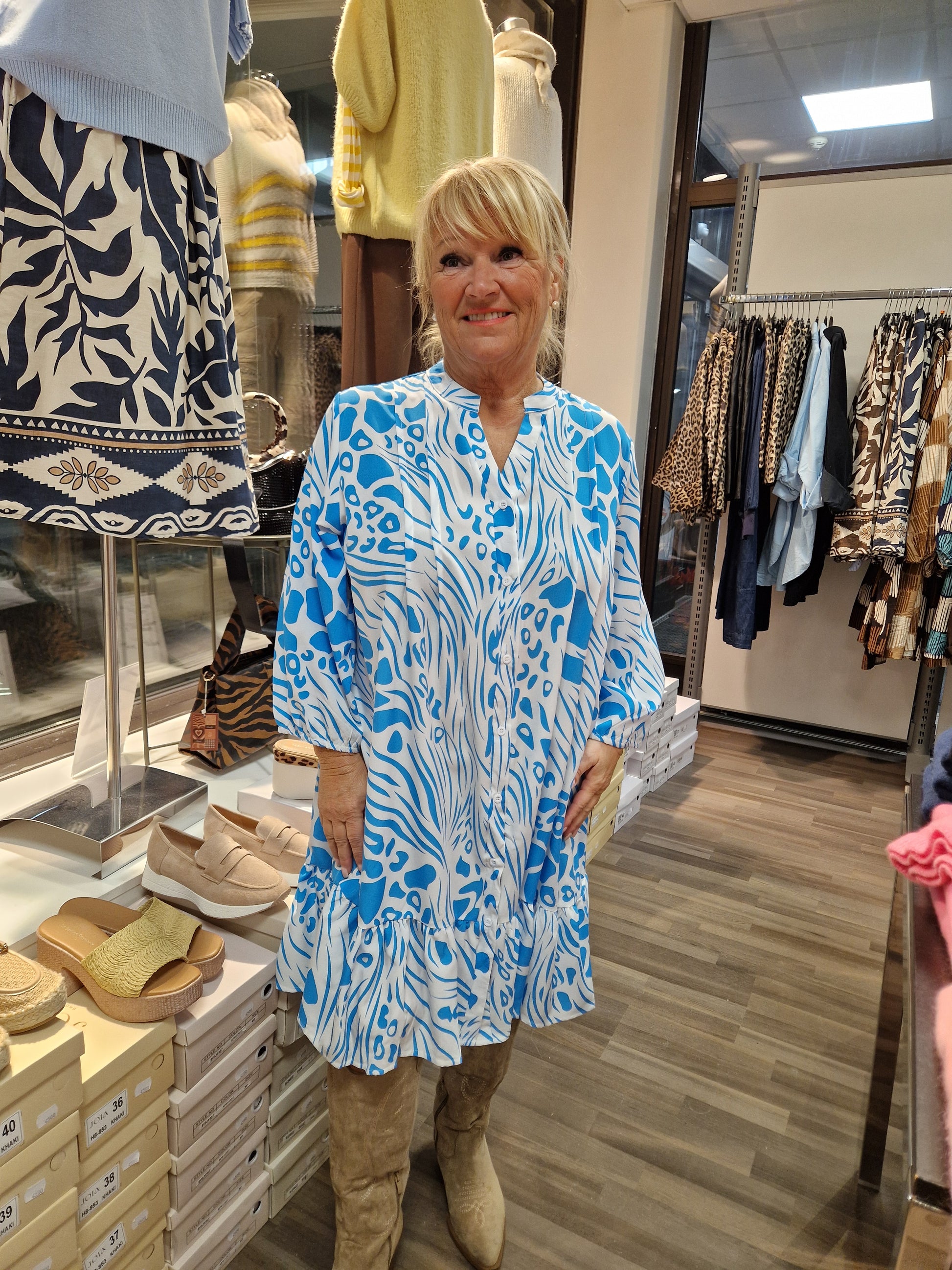 Kevyt tunika/mekko. Napit edessä alasasti, frillahelma. Hihat vajaamittaiset, ja hihansuissa kumpparit. Pieni pystykaulus.