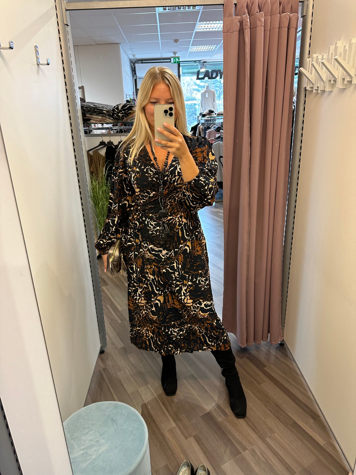 Kietaisumekko 100% viskoosia. Midimittainen. Hieman pussittavat hihat ja hihansuissa joustava kuminauha.