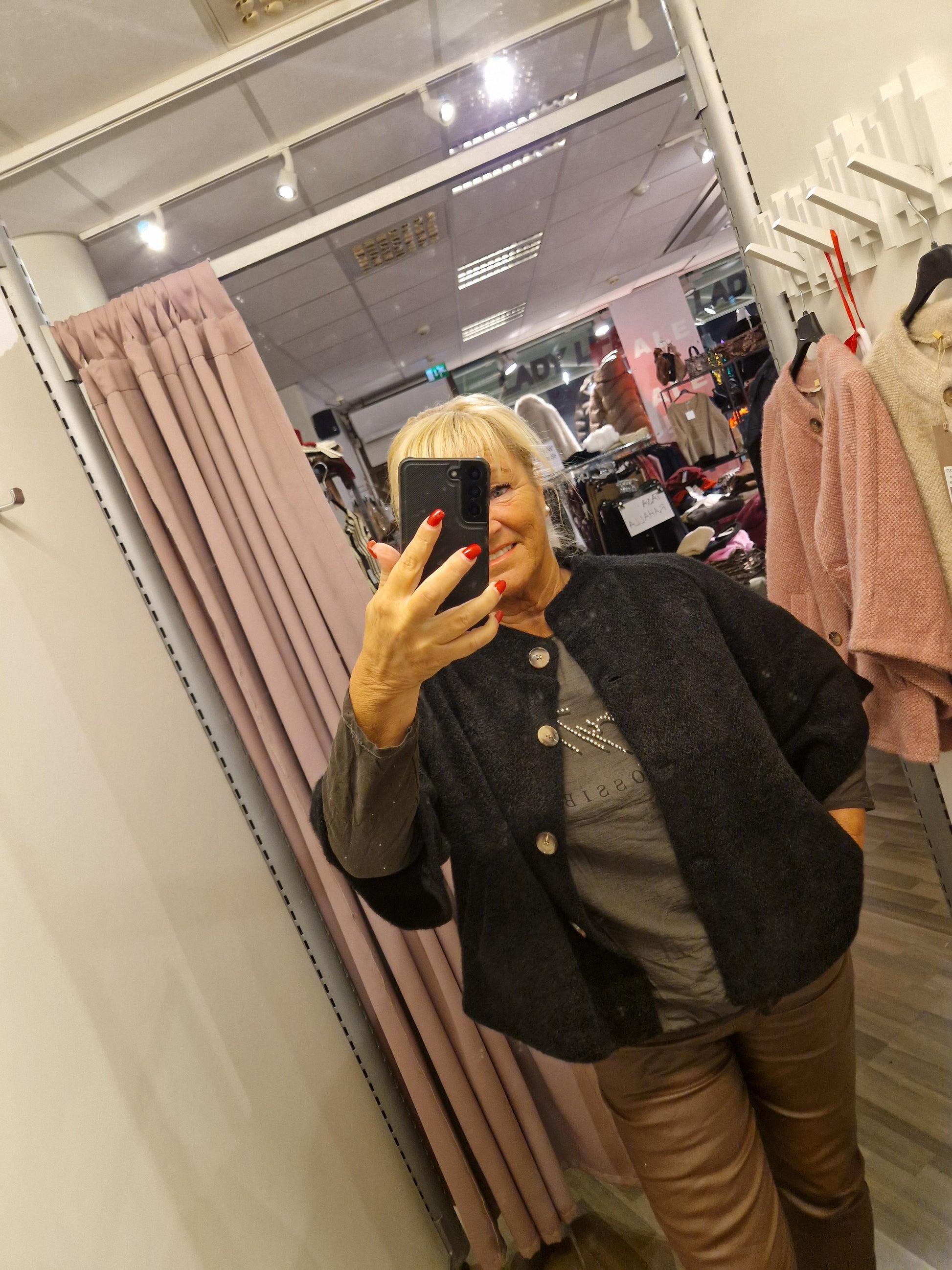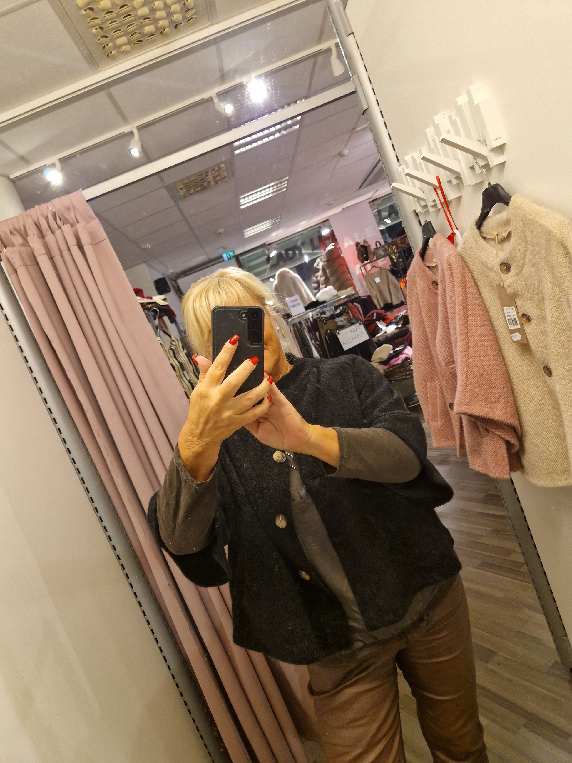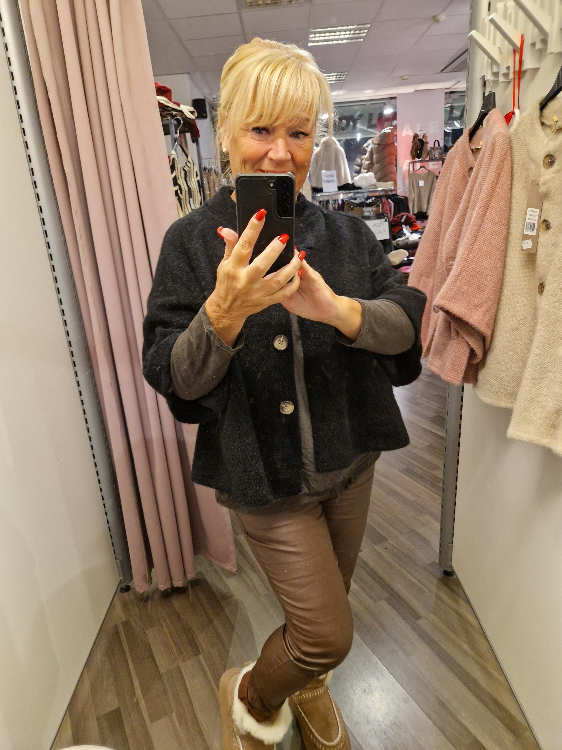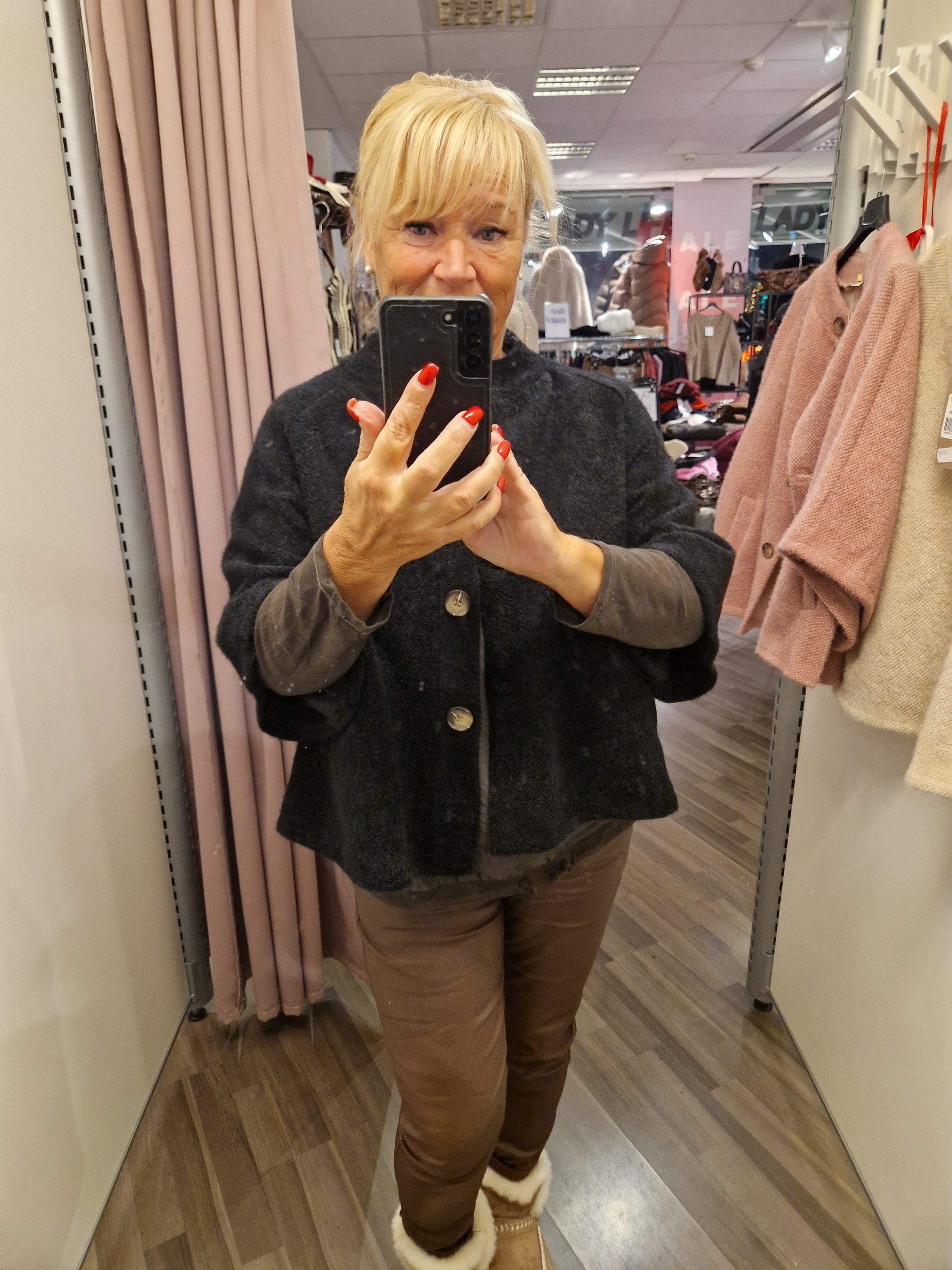 Kiva viittatyylinen jakku vajaamittaisilla hihoilla. Edessä napit ja sivuilla taskut. Vuoreton.