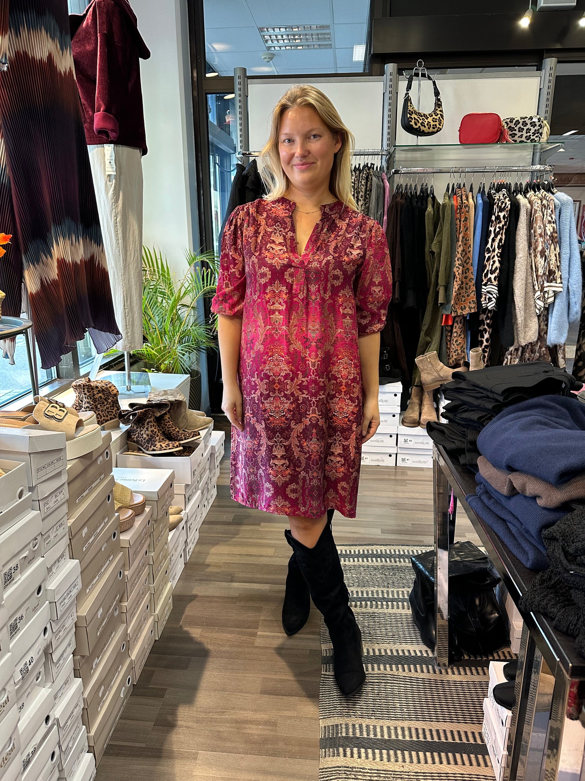 Sirompi suoranmallinen mekko kauniilla kuviolla. Puolipitkät hihat ja hihansuissa joustava kuminauha.