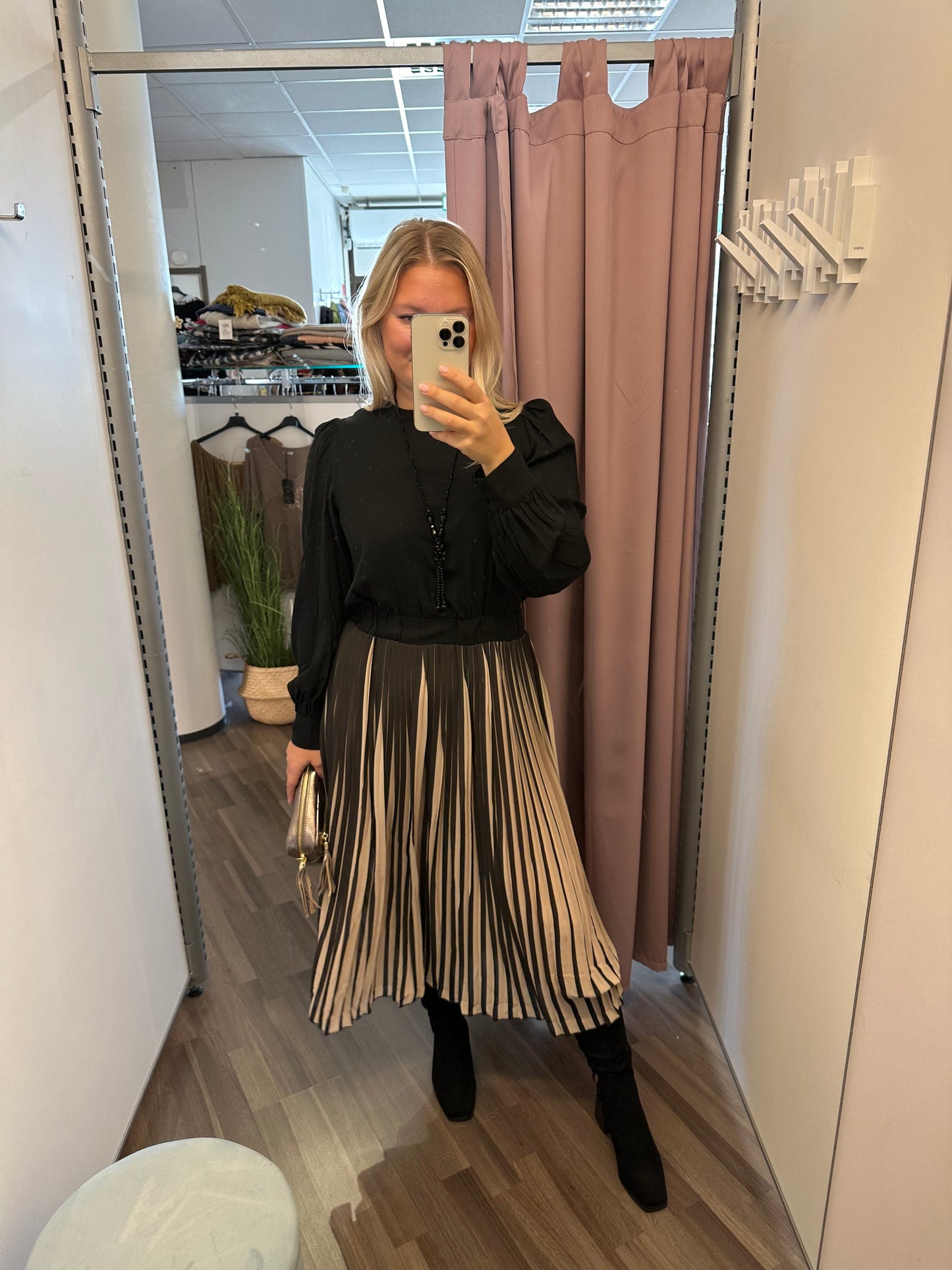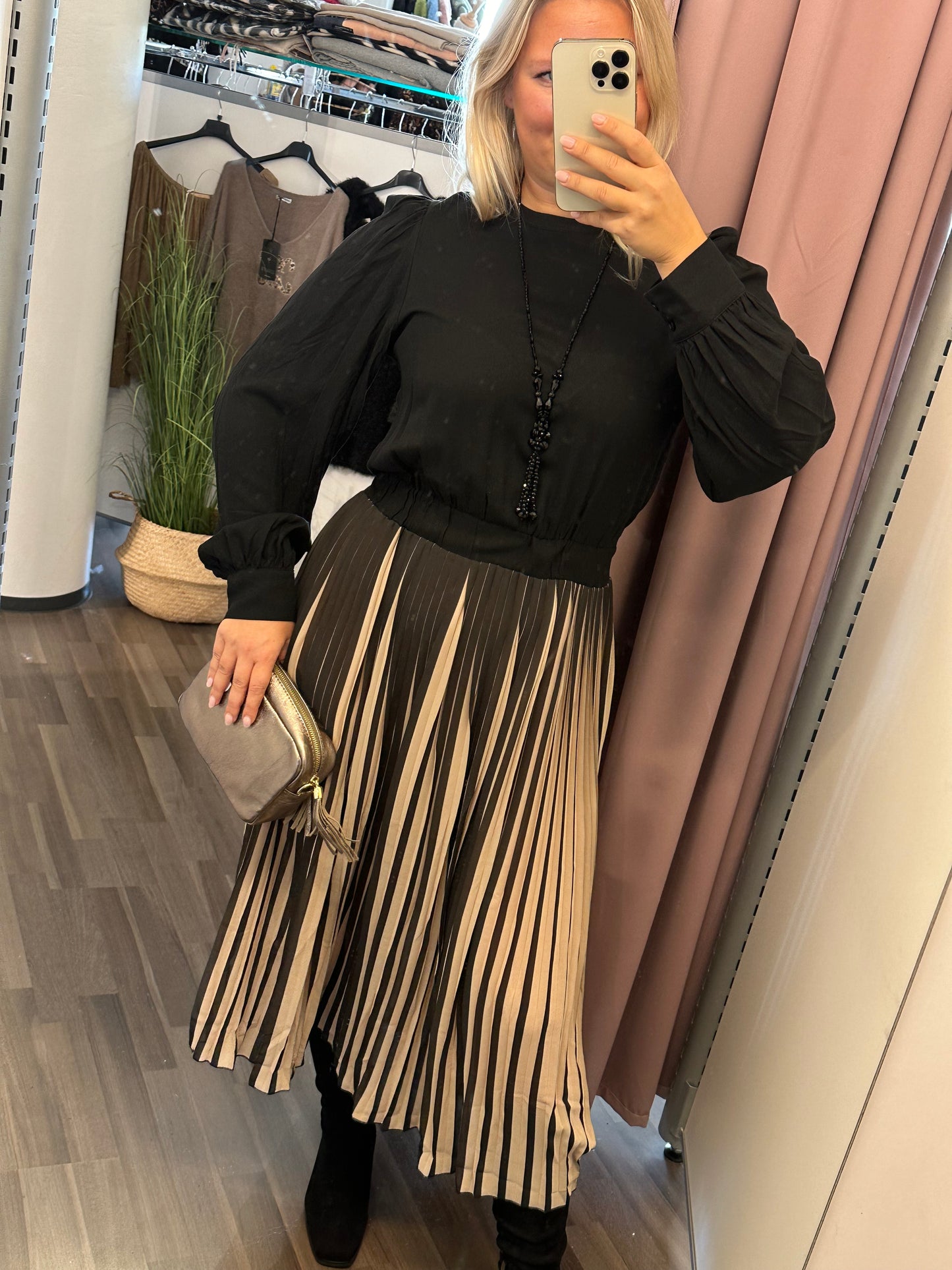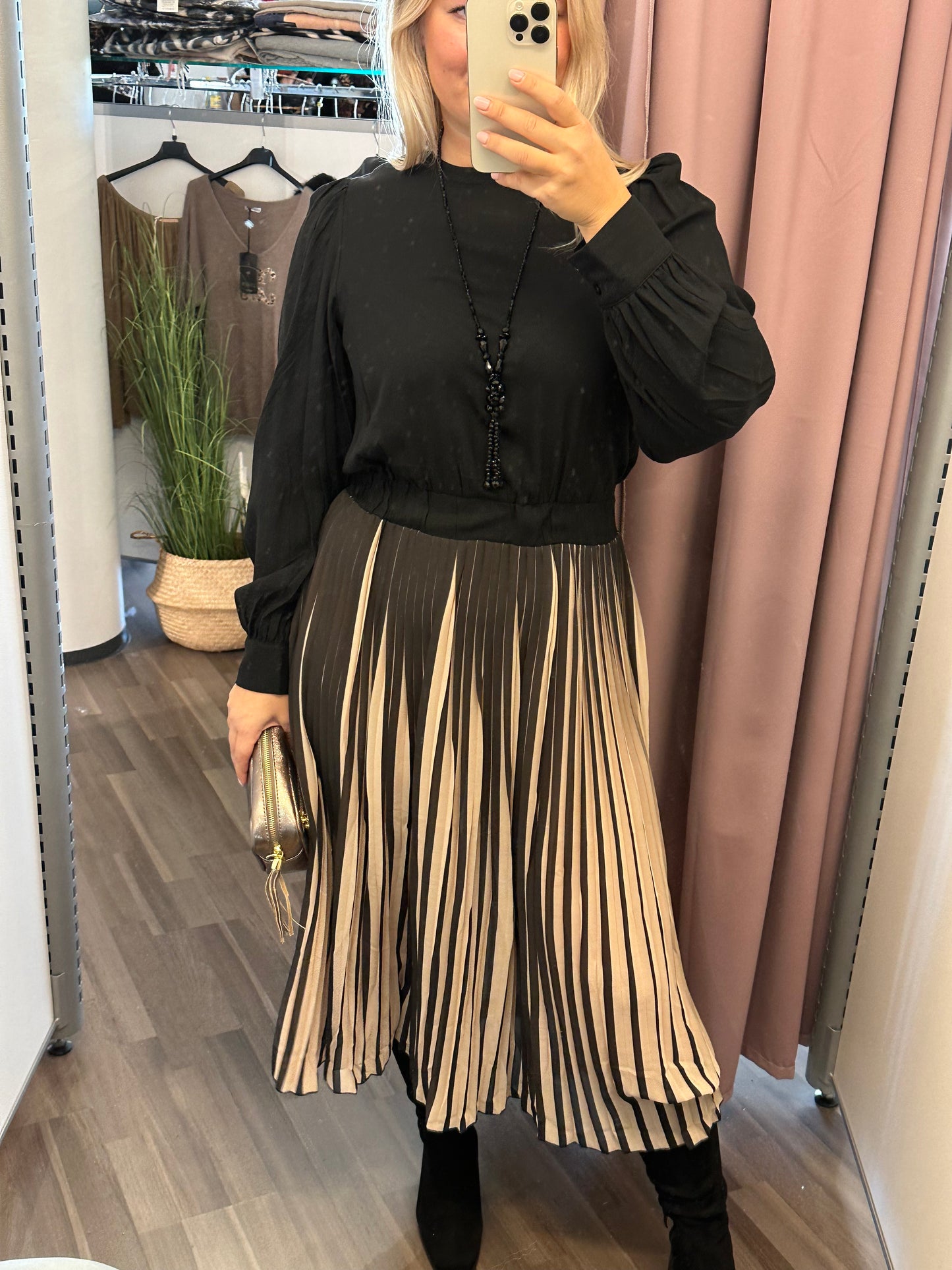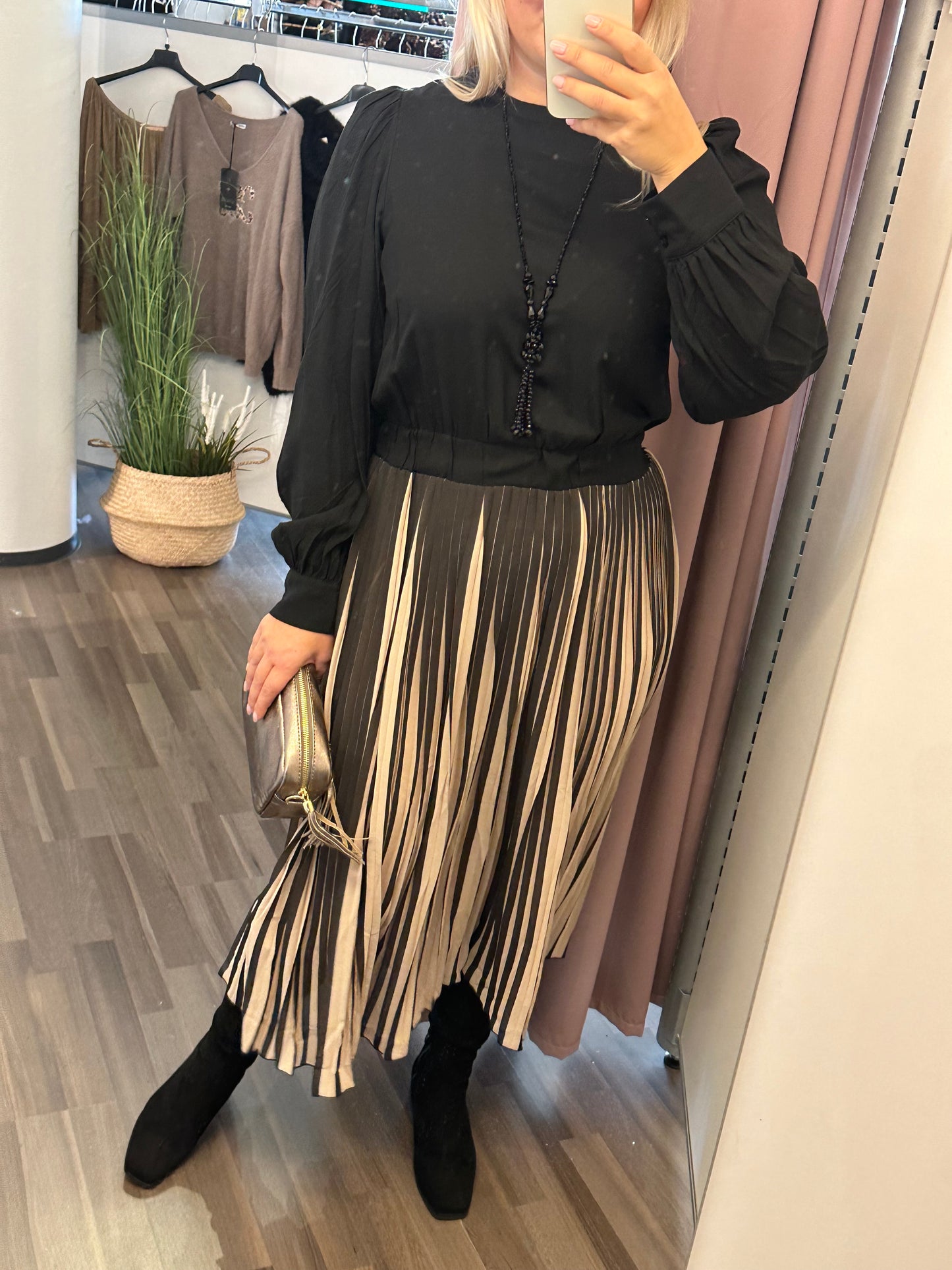 Pitkähihainen viskoosimekko pliseehelmalla.
