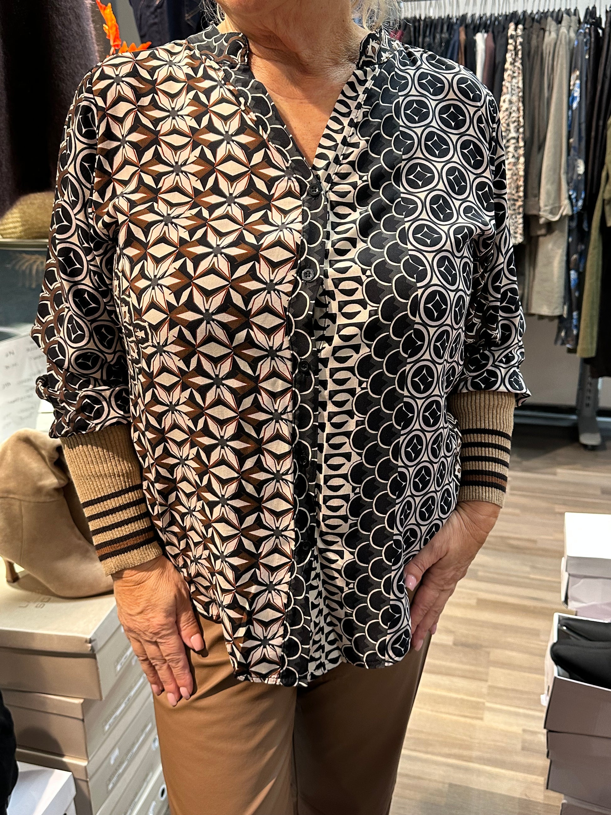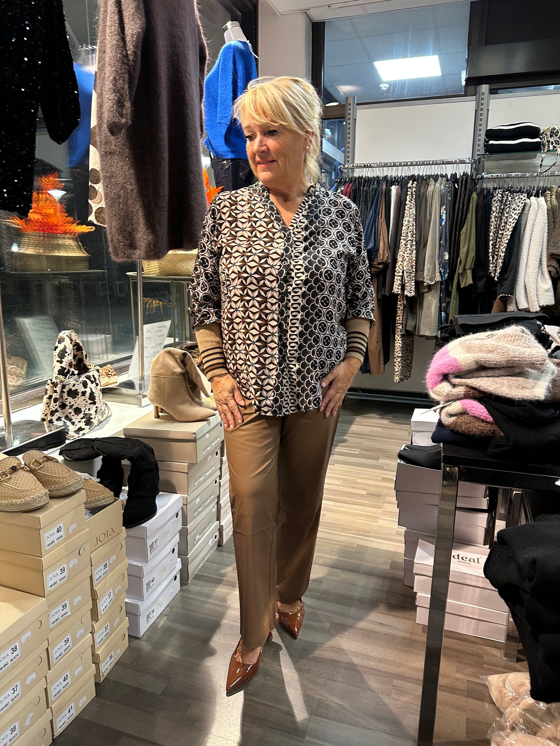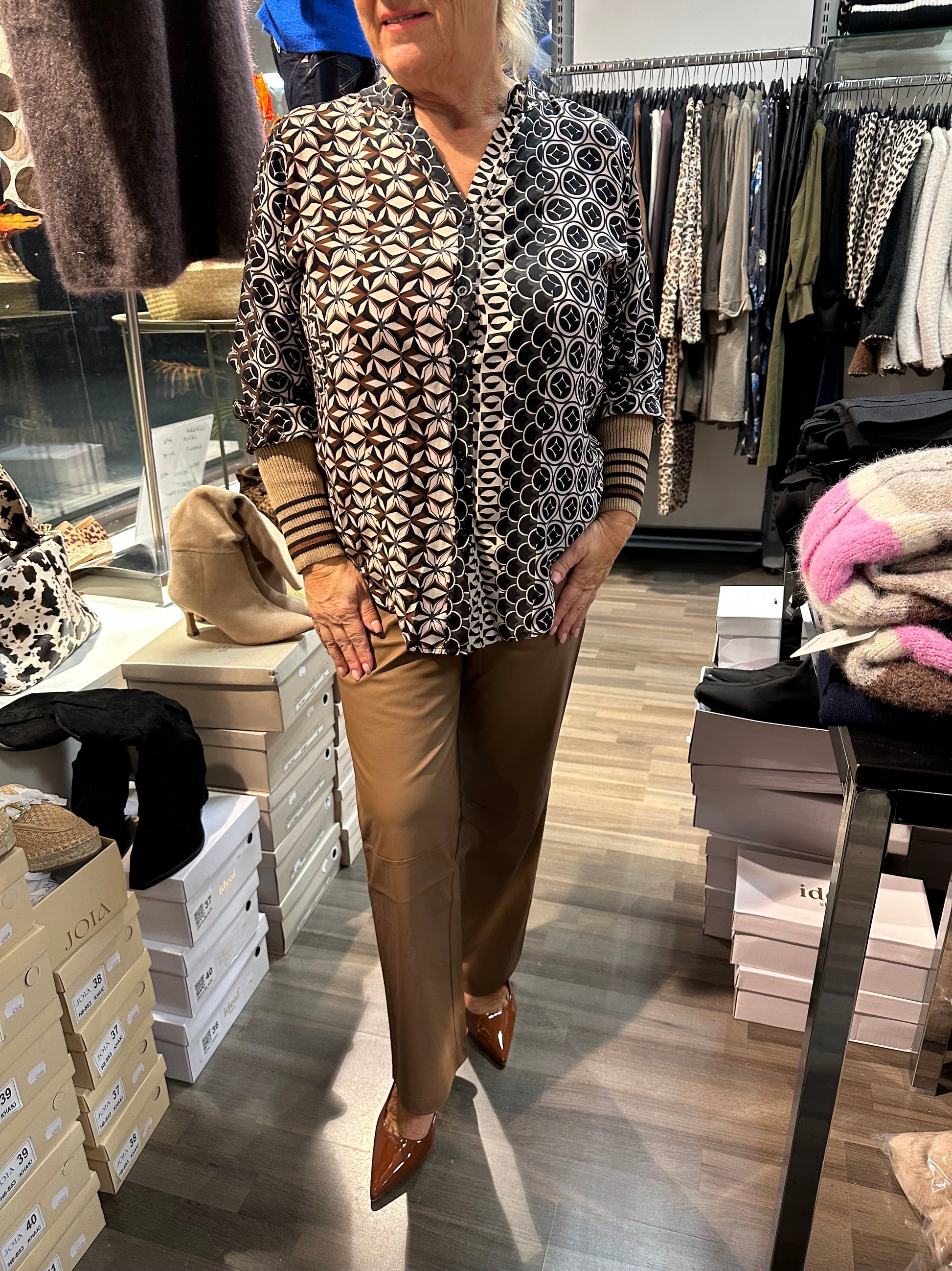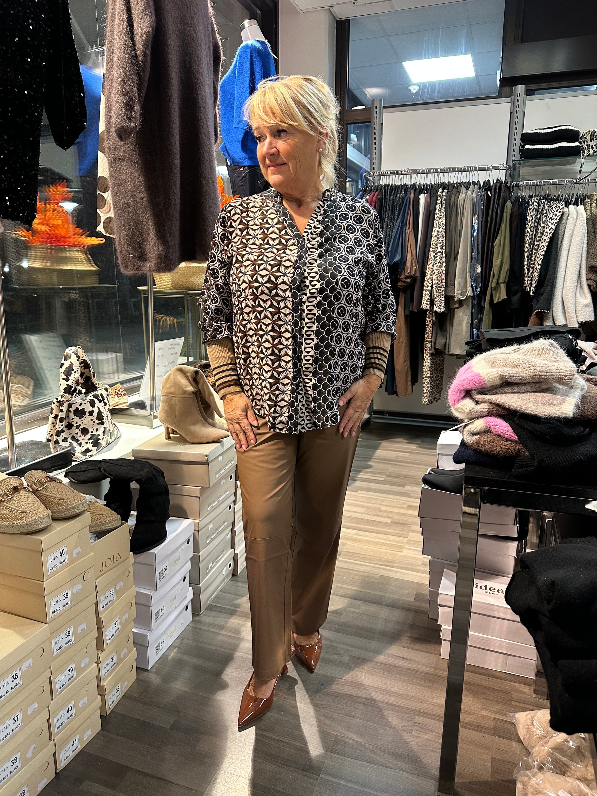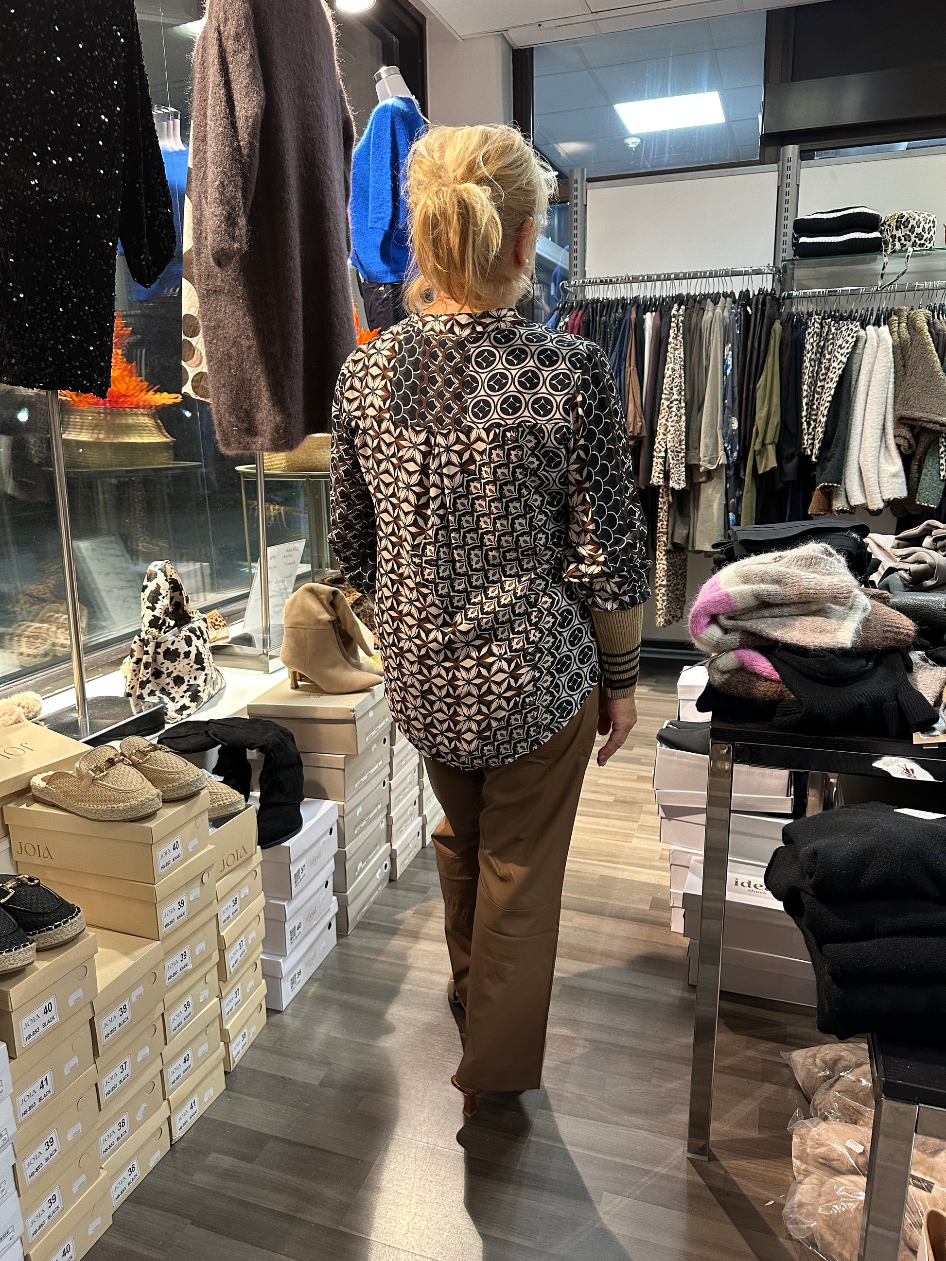 Kevyt viskoosipusero resorihihoilla. Edessä napit koko pituudelta. Pyöristetty helma.