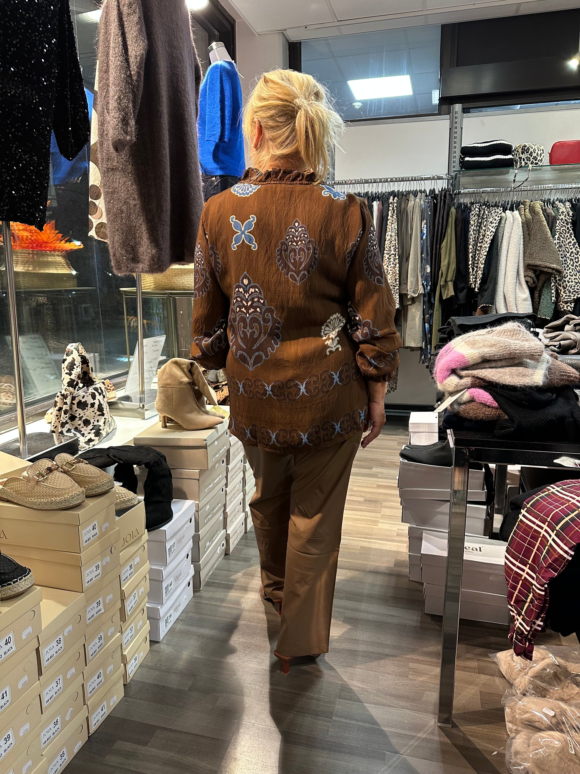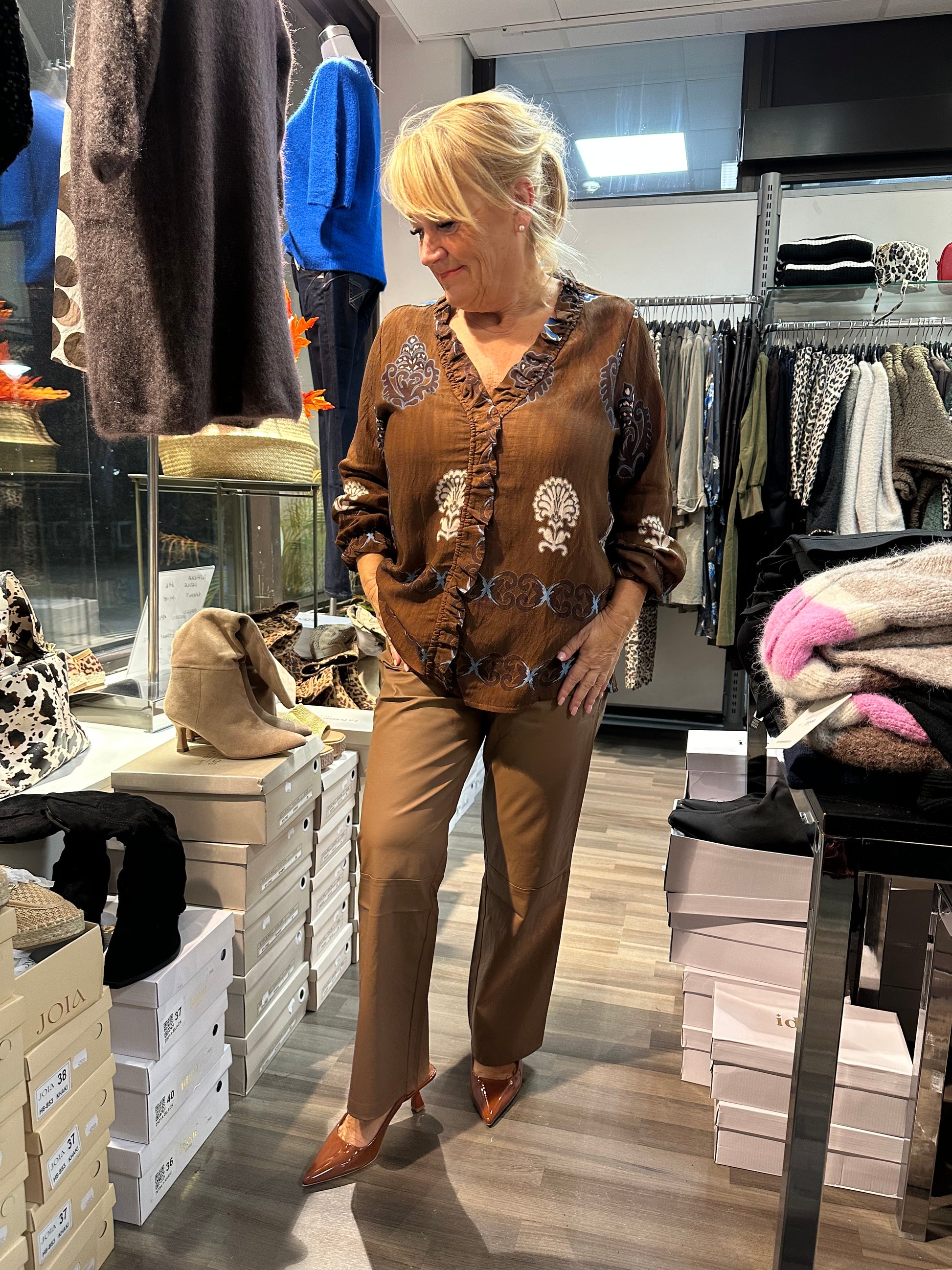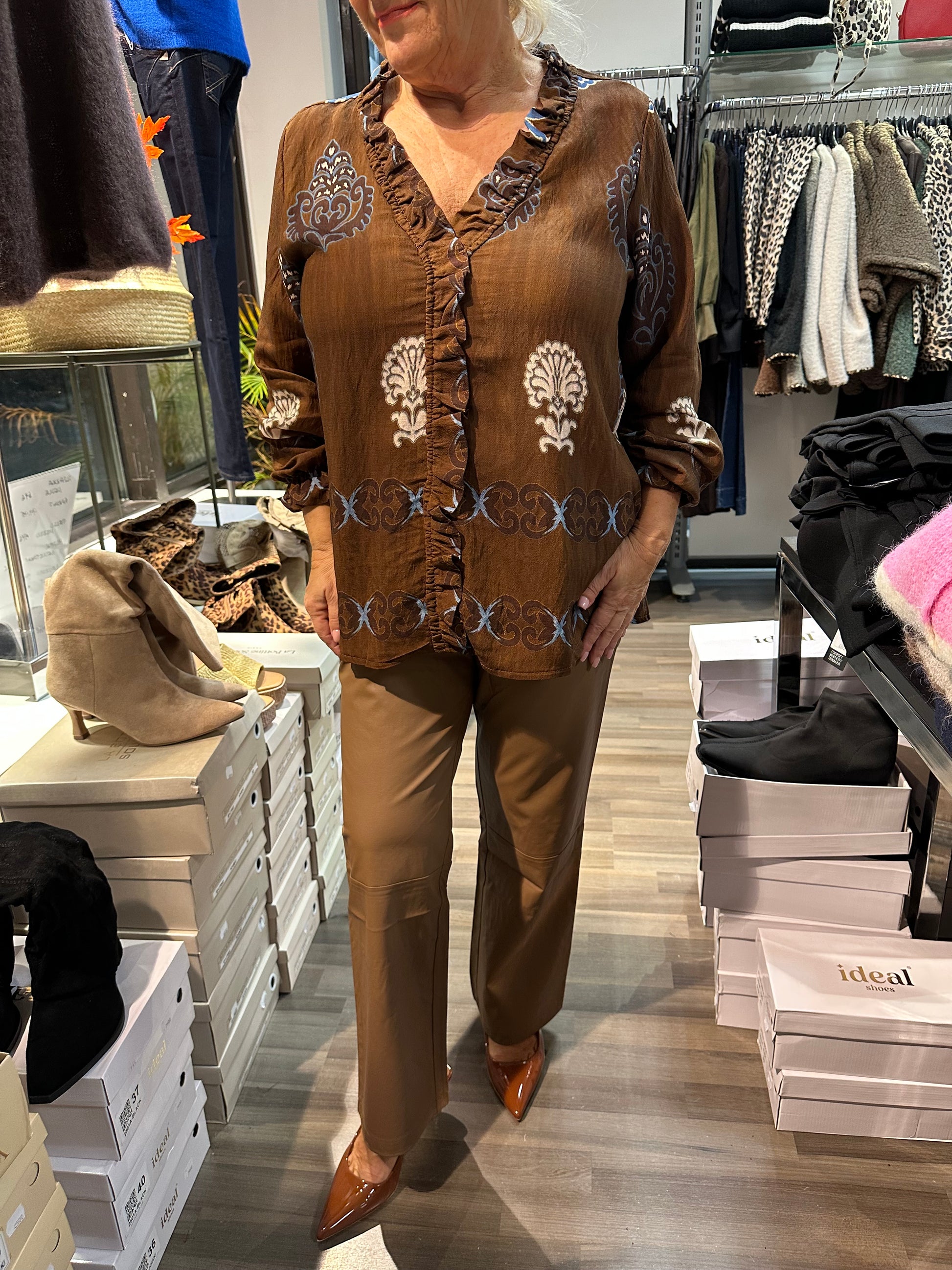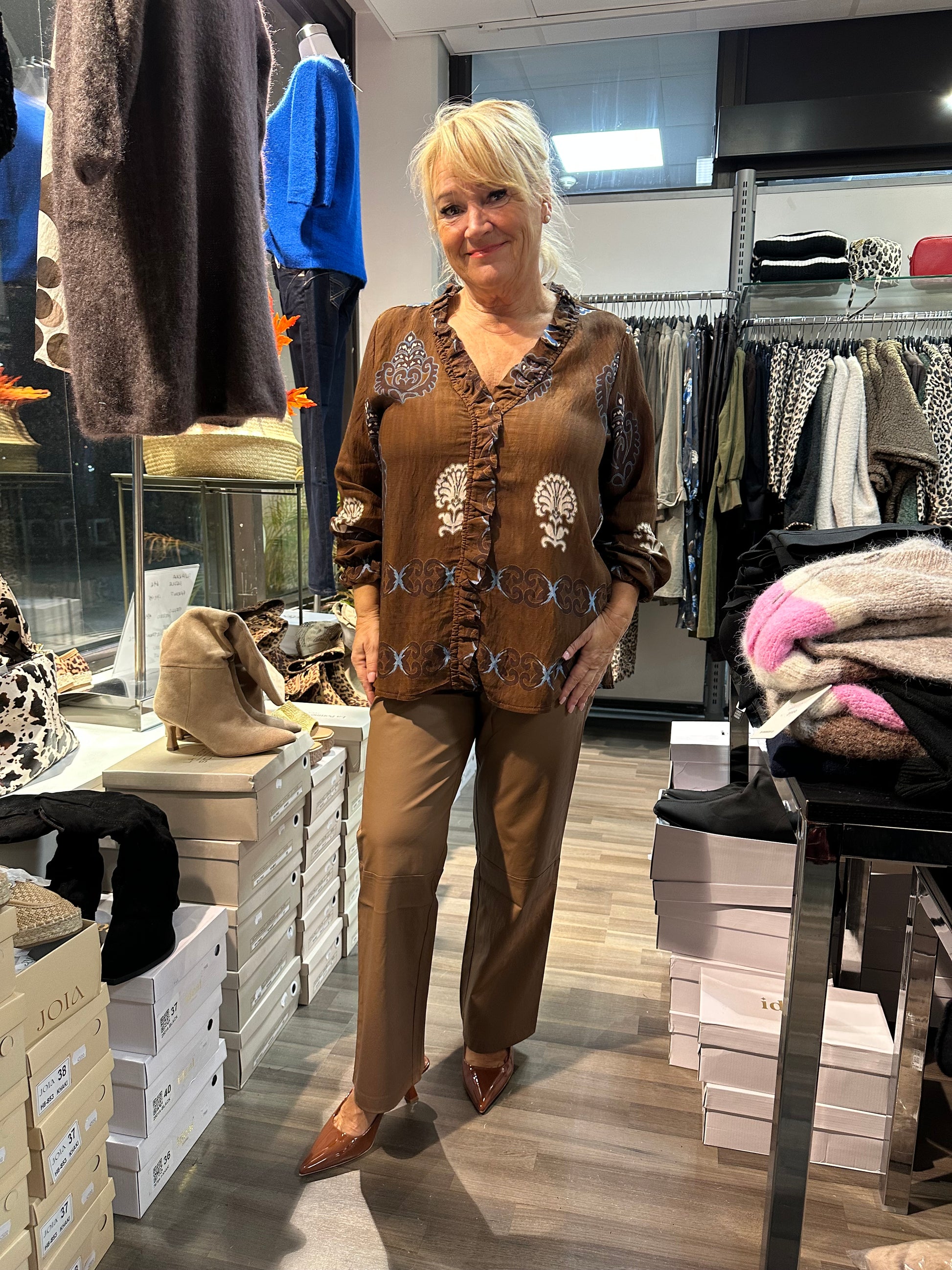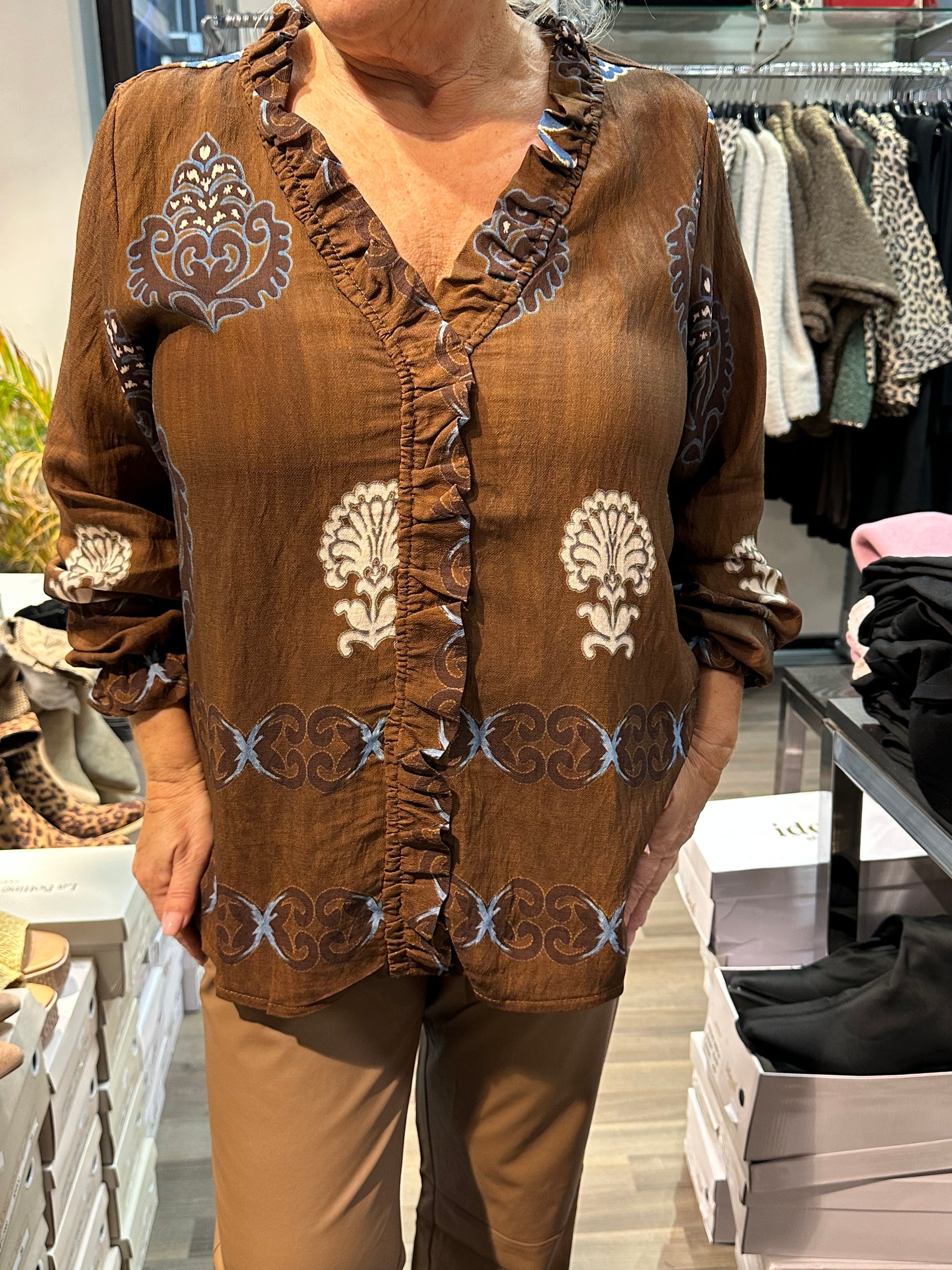 Kiva hieman pidempi pusero, jossa röyhelöä edessä ja hihansuissa joustava röyhelö.
