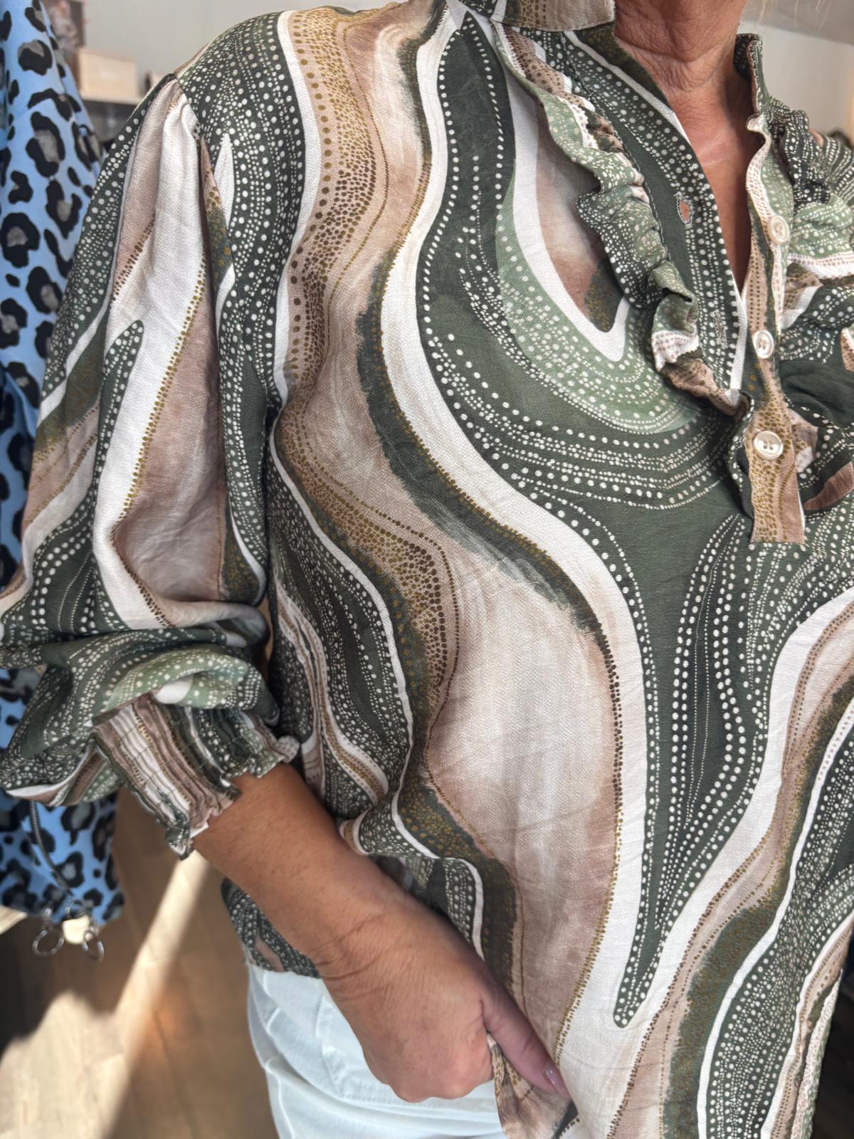 Uutta Italiasta! Viskoosipusero, pienet frillat pääntiellä ja napit. Vajaamittainen hiha, jossa kumppari resorit.